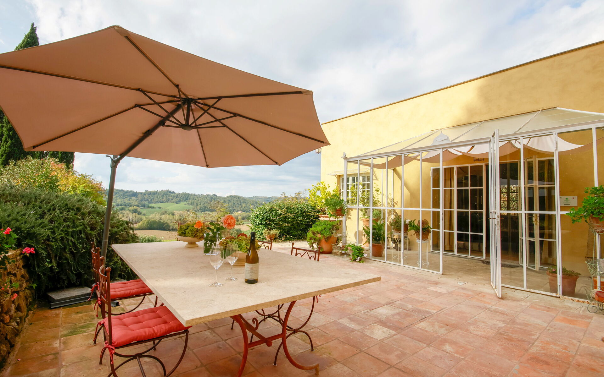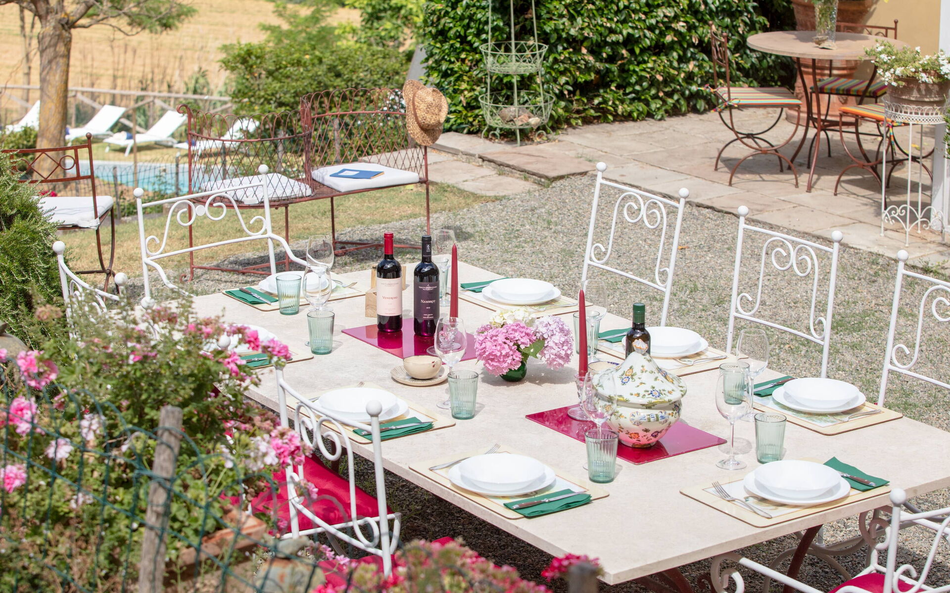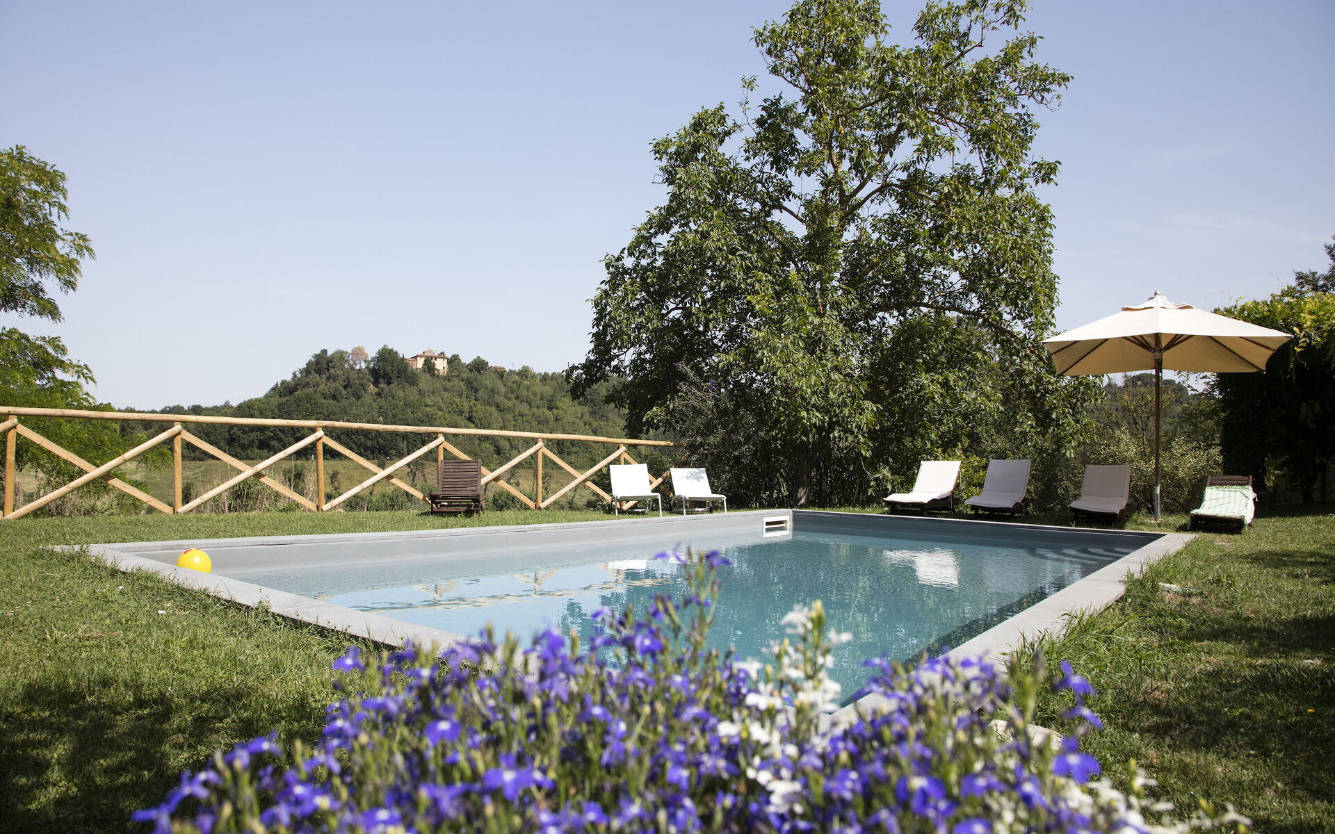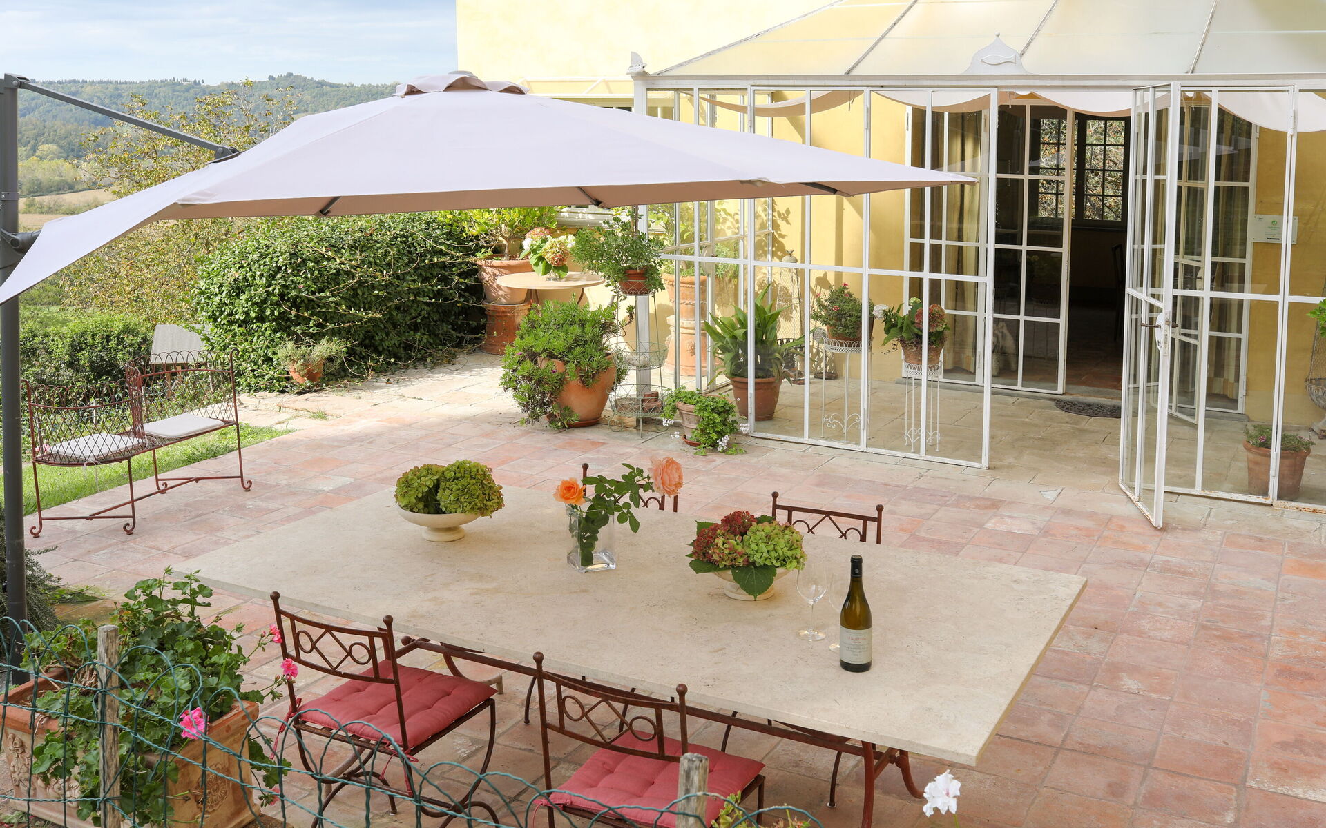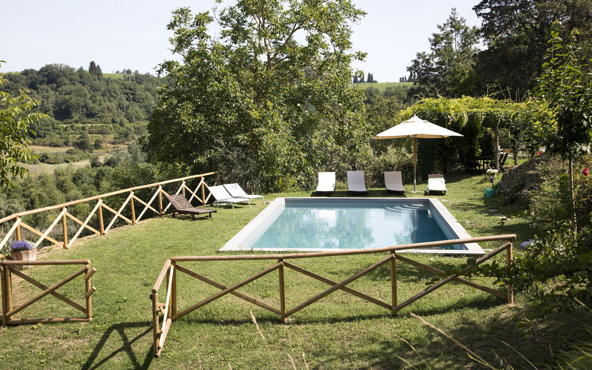 À l'extérieur, une citronneraie vitrée relie la cuisine à une terrasse avec barbecue en briques. De là, un chemin mène, en suivant le jardin en pente douce, à l'élégante piscine privée (5 x 10 m, profondeur 1,20 m - 1,50 m) agrémentée de transats, d'une gloriette ombragée par une glycine pour les repas en plein air aux beaux jours, et offrant une vue imprenable sur la campagne environnante.