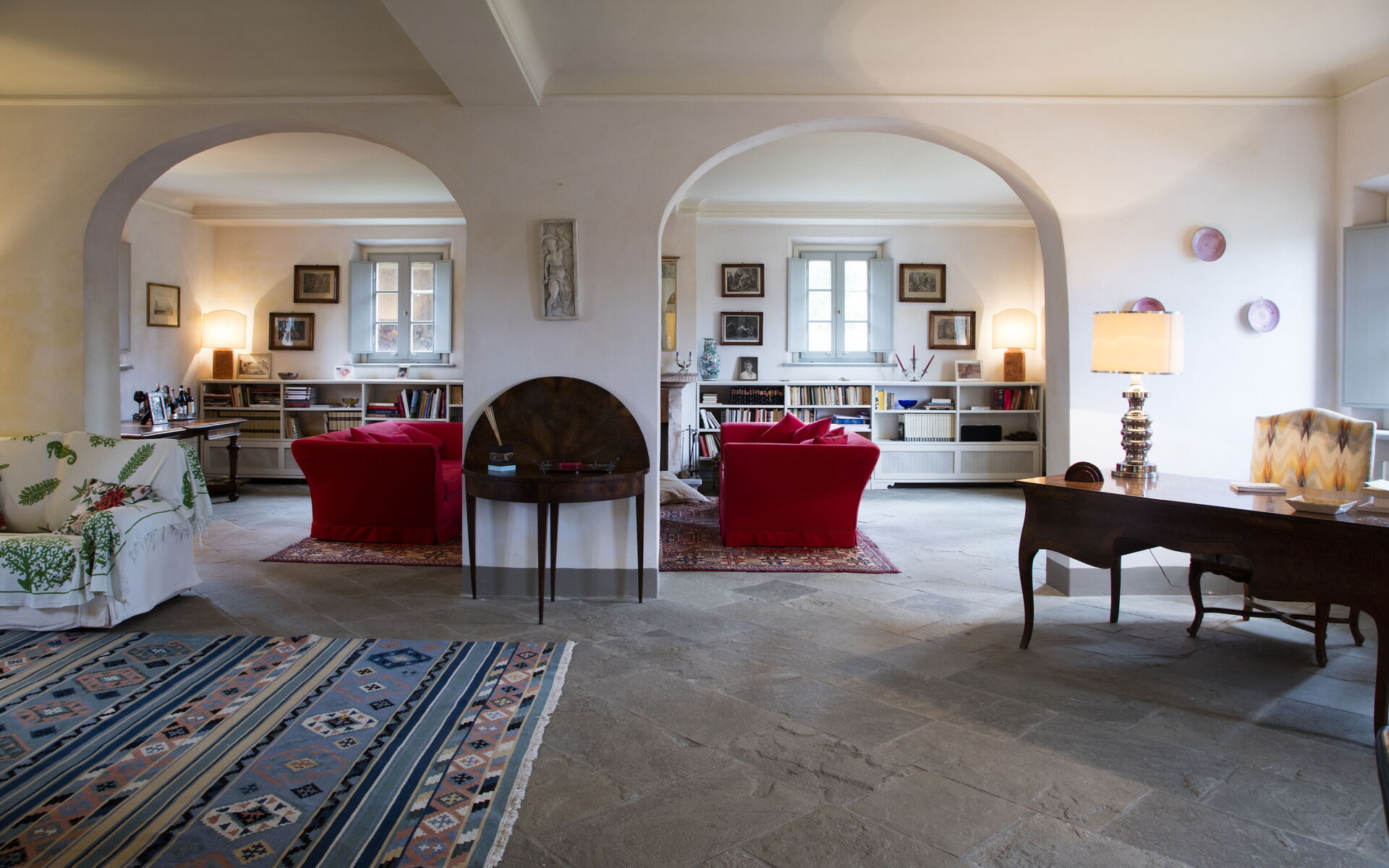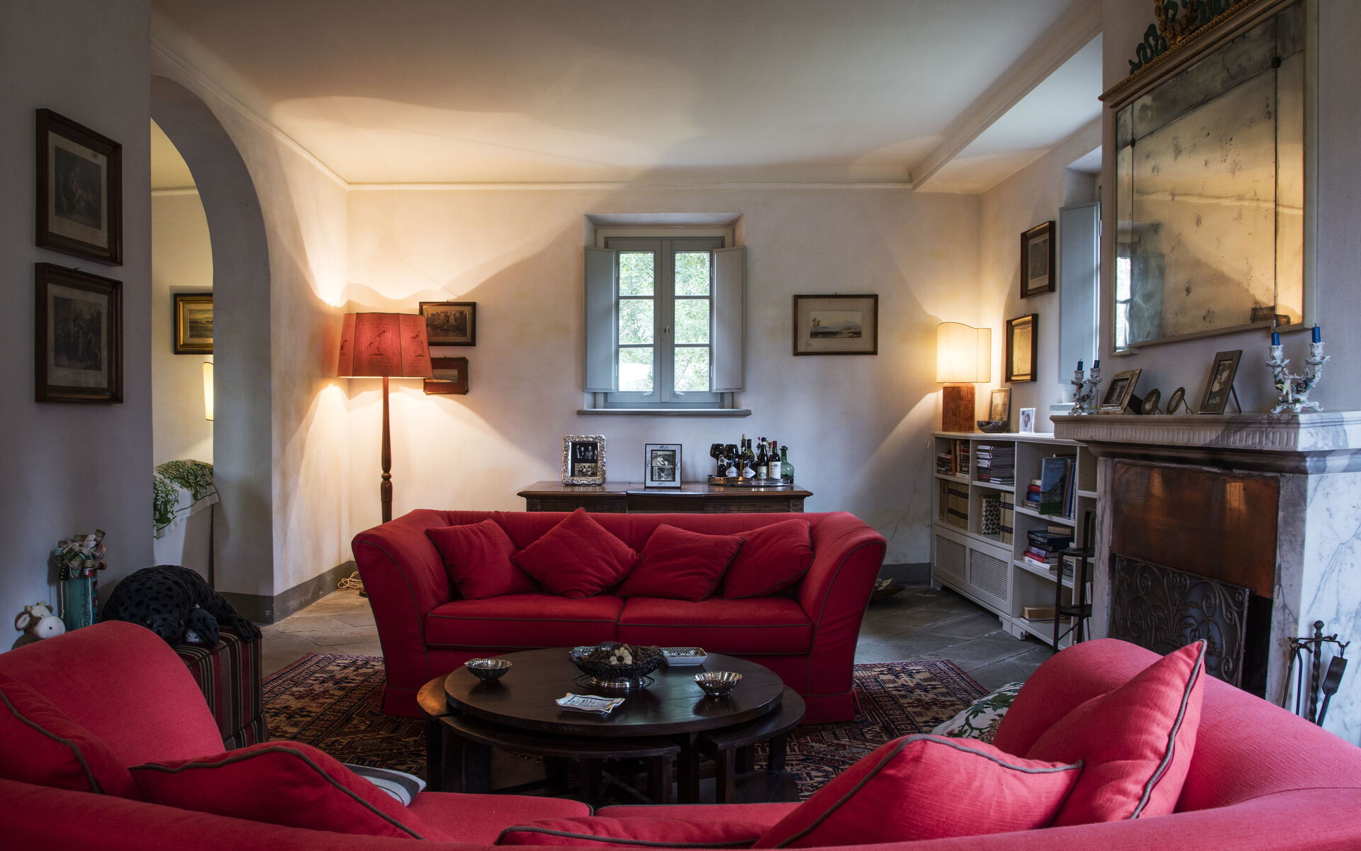 Grand séjour avec canapés confortables, TV, cheminée, bureau et bibliothèque.