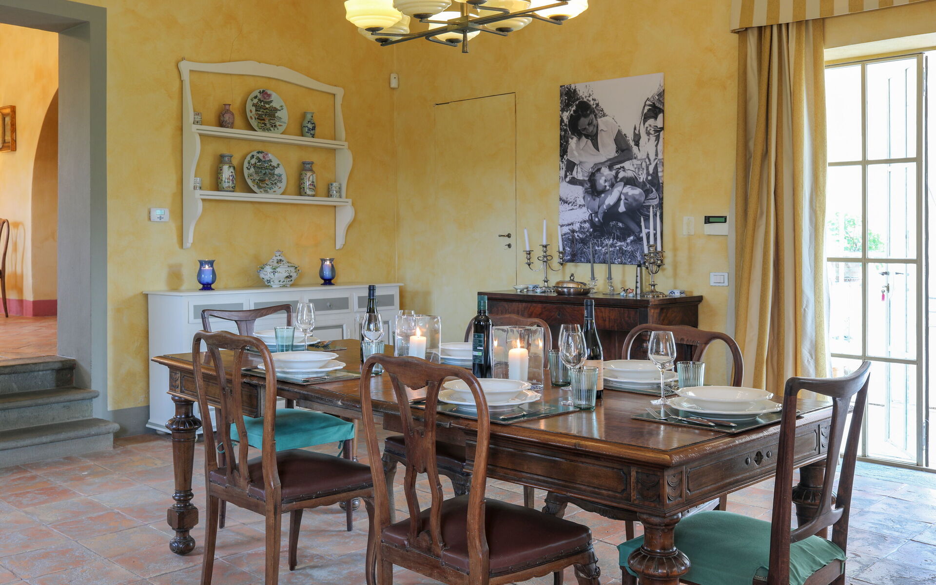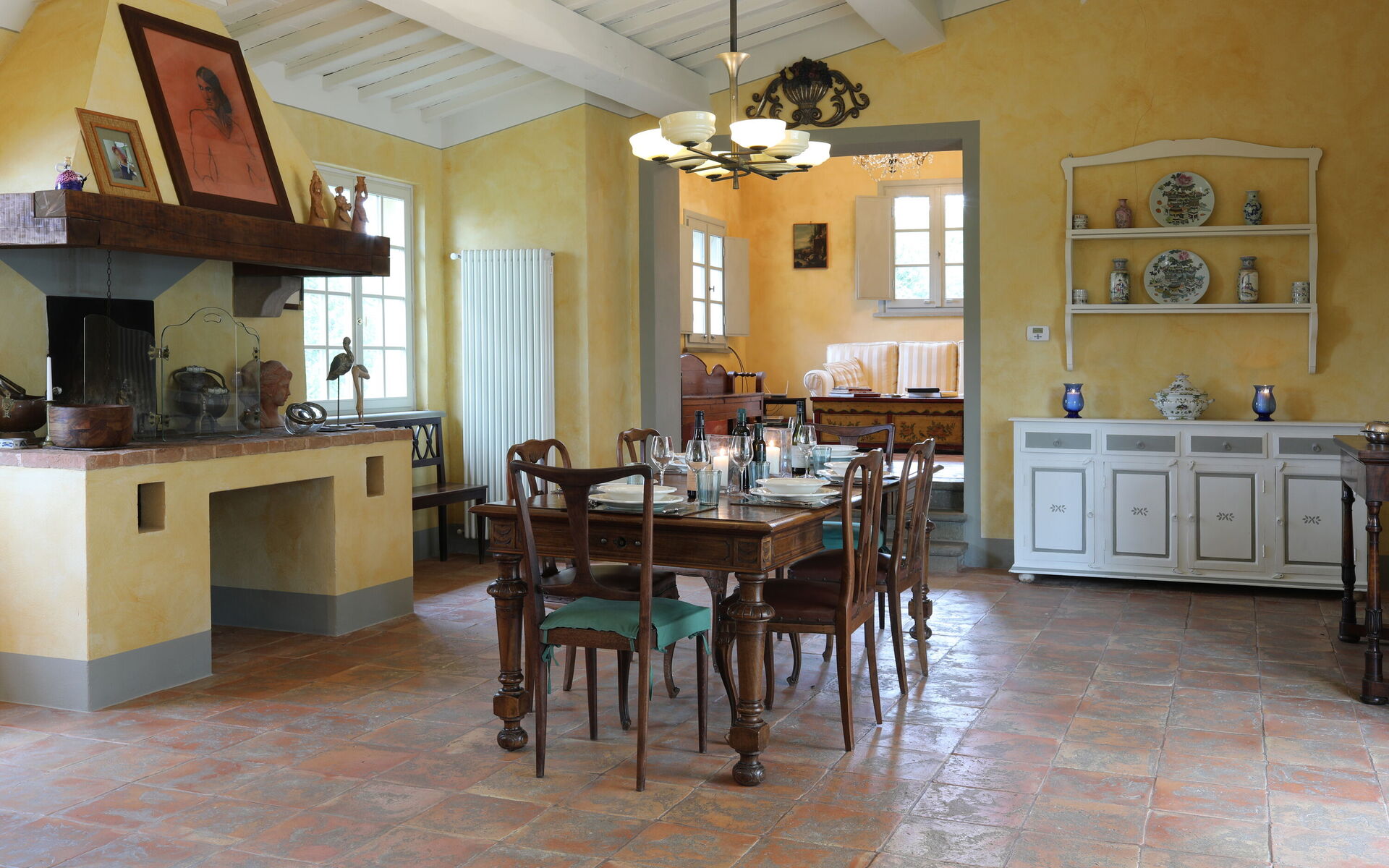 Spacieuse salle à manger avec grande cheminée traditionnelle (deux marches en contrebas du salon). Porte donnant sur l'extérieur.