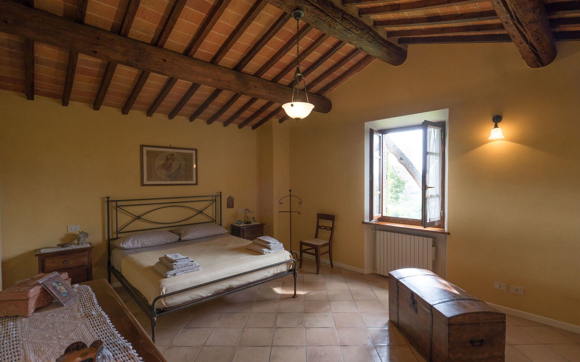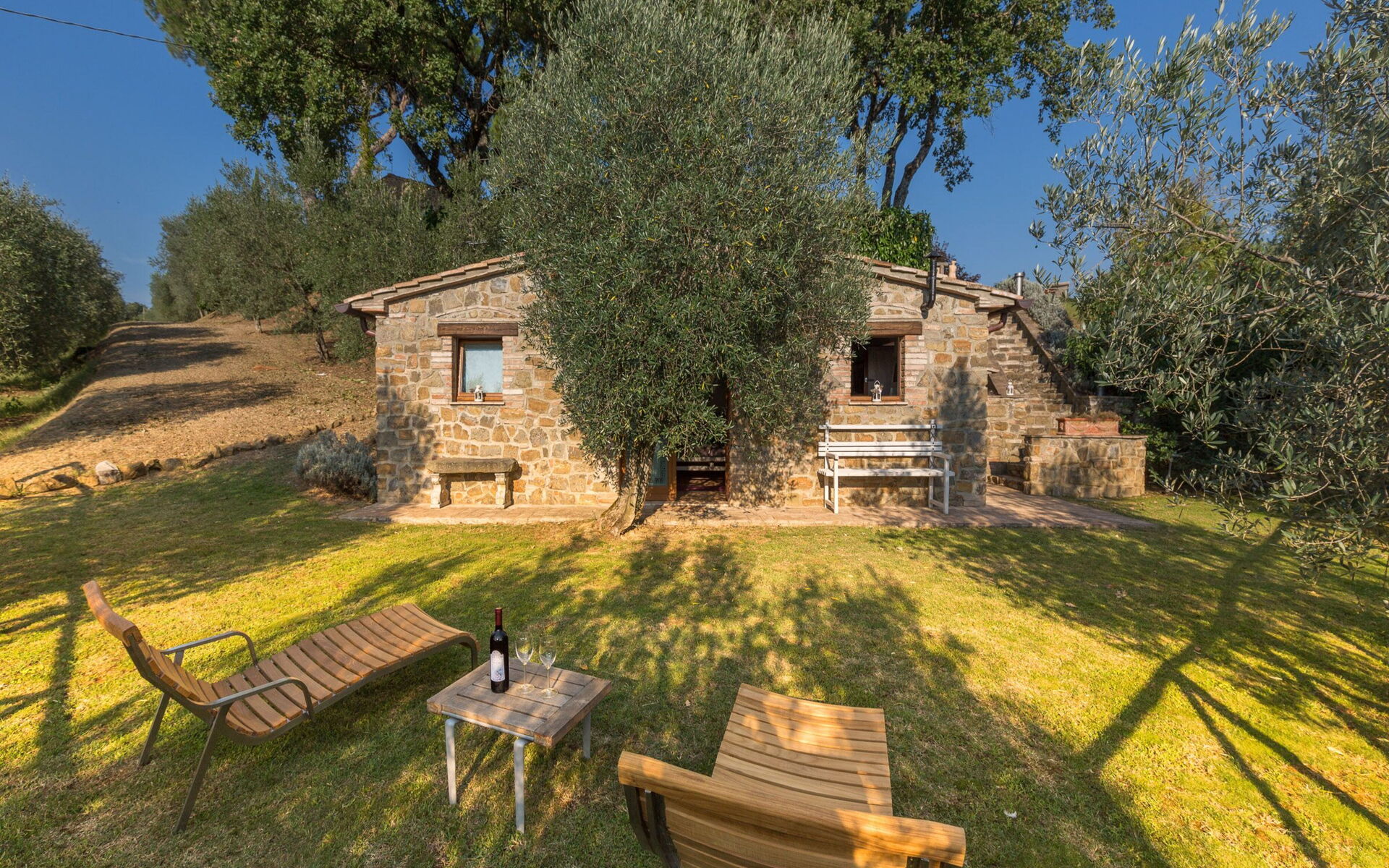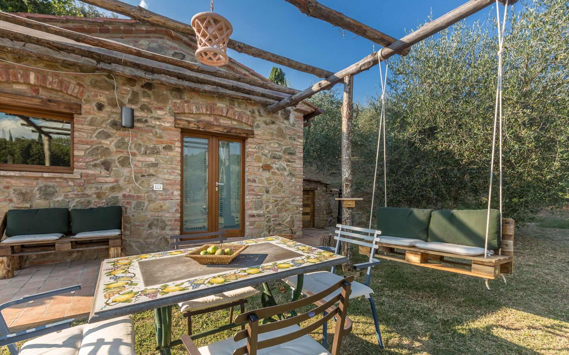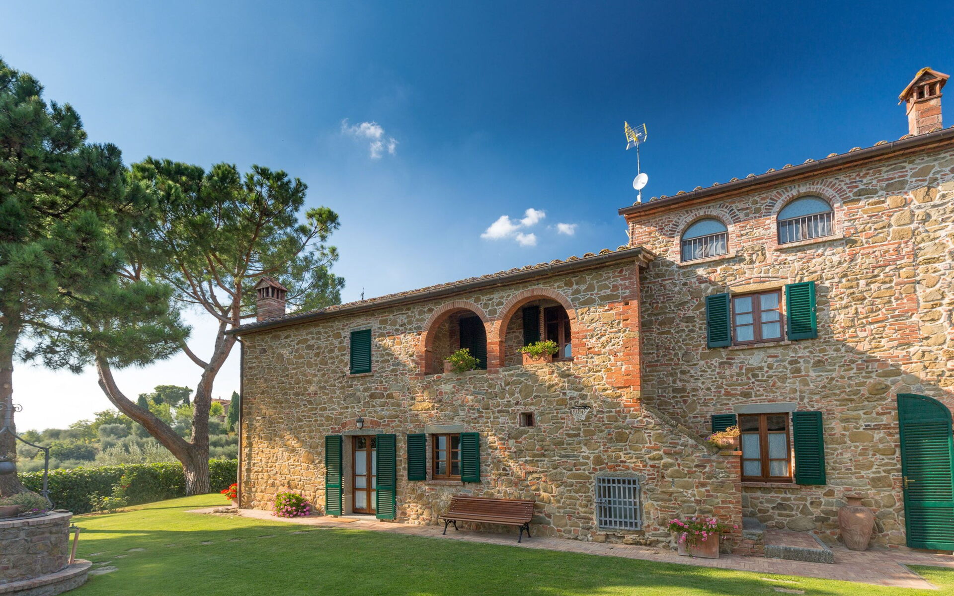 La villa est entourée de 8 hectares de cultures et de bois complètement immergés dans le Val di Chiana. Dans la propriété, il y a aussi un potager / verger, où les légumes et les fruits de saison peuvent être utilisés comme accompagnement pour des plats traditionnels toscans exquis. Le cadre enchanteur de cette résidence se prête également aux petits mariages, anniversaires ou autres cérémonies.