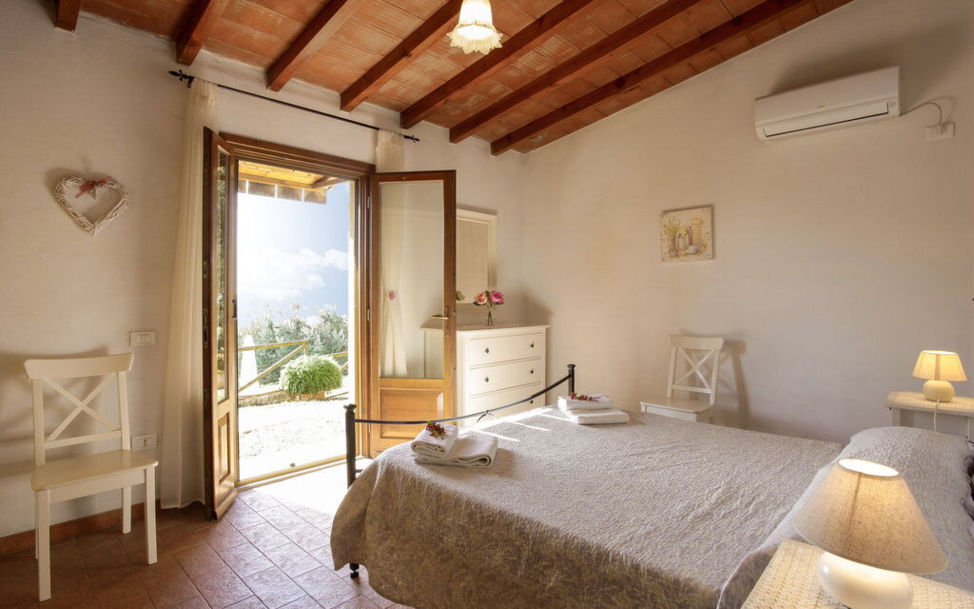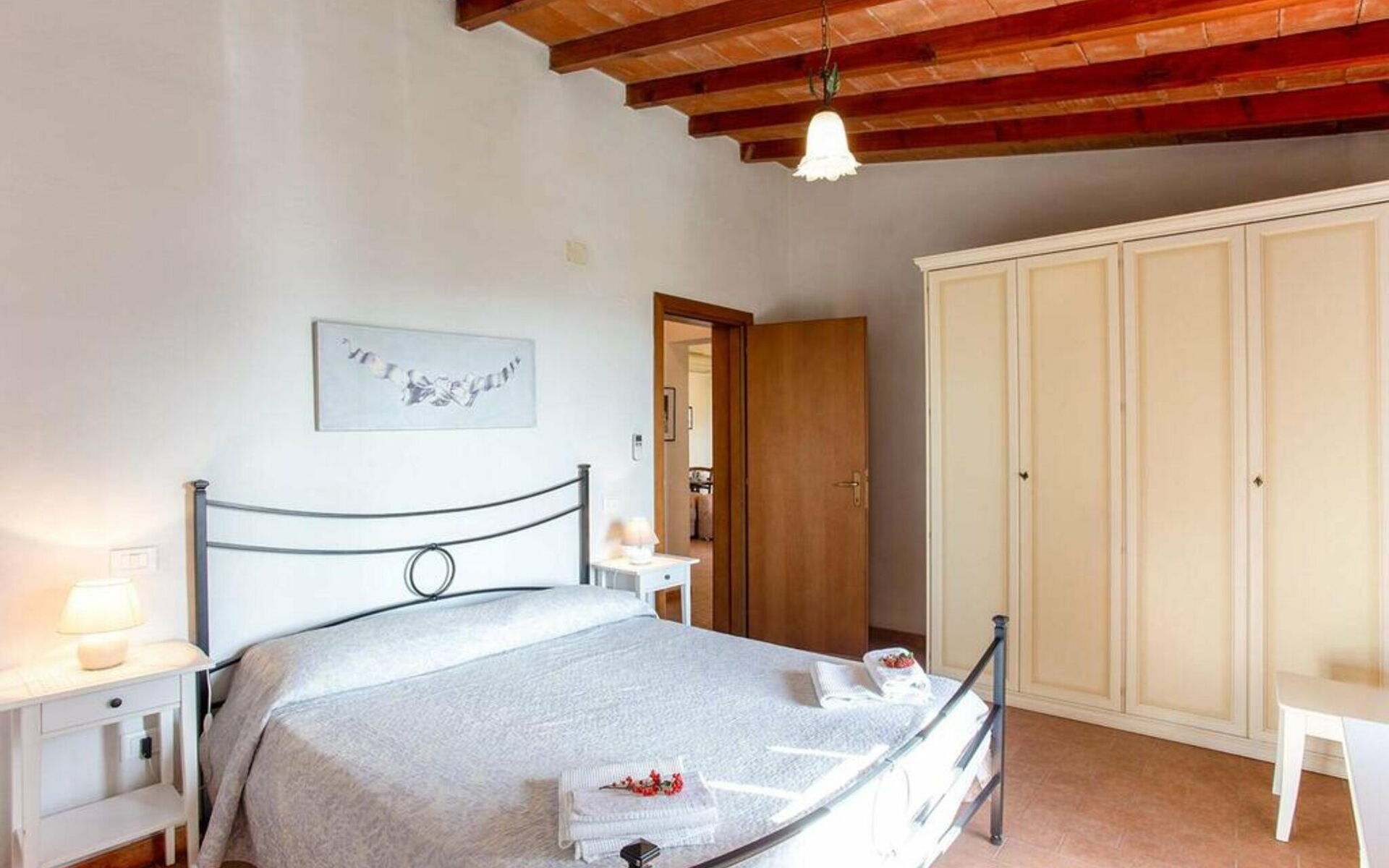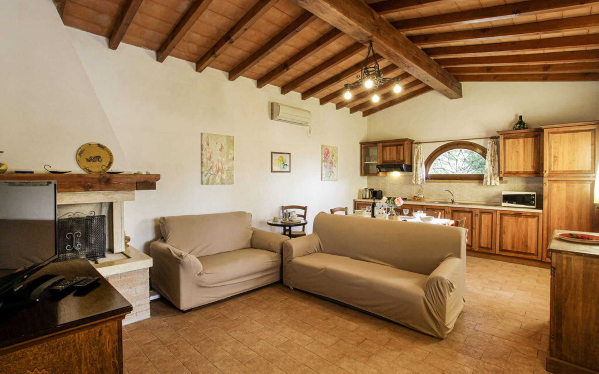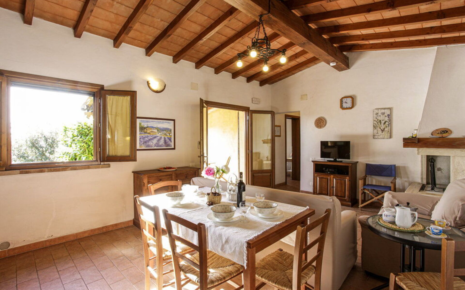 Au rez-de-chaussée: entrée - séjour avec cheminée (TV satellite, DVD) ouvrant sur la cuisine-salle à manger (gazinière, four, réfrigérateur, lave-linge, micro-ondes); 1 chambre à deux lits; 1 chambre double, 1 salle de bain avec baignoire et douche (WC / bidet). Loggia équipée pour les repas en plein air. Mobilier simple dans un style toscan rustique.