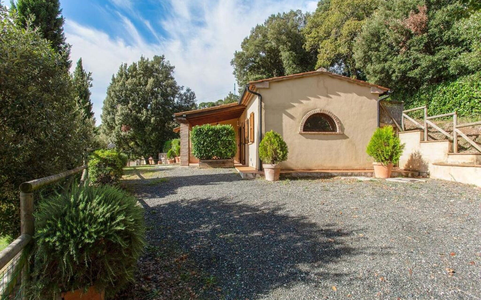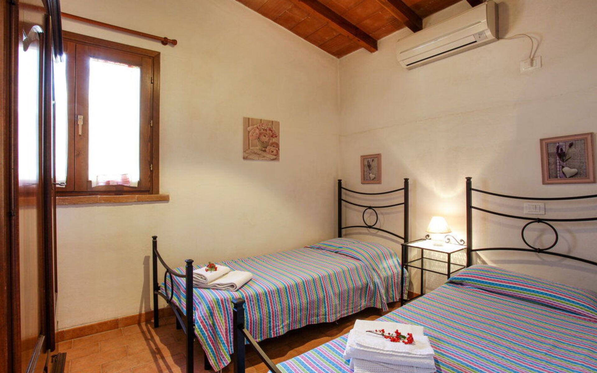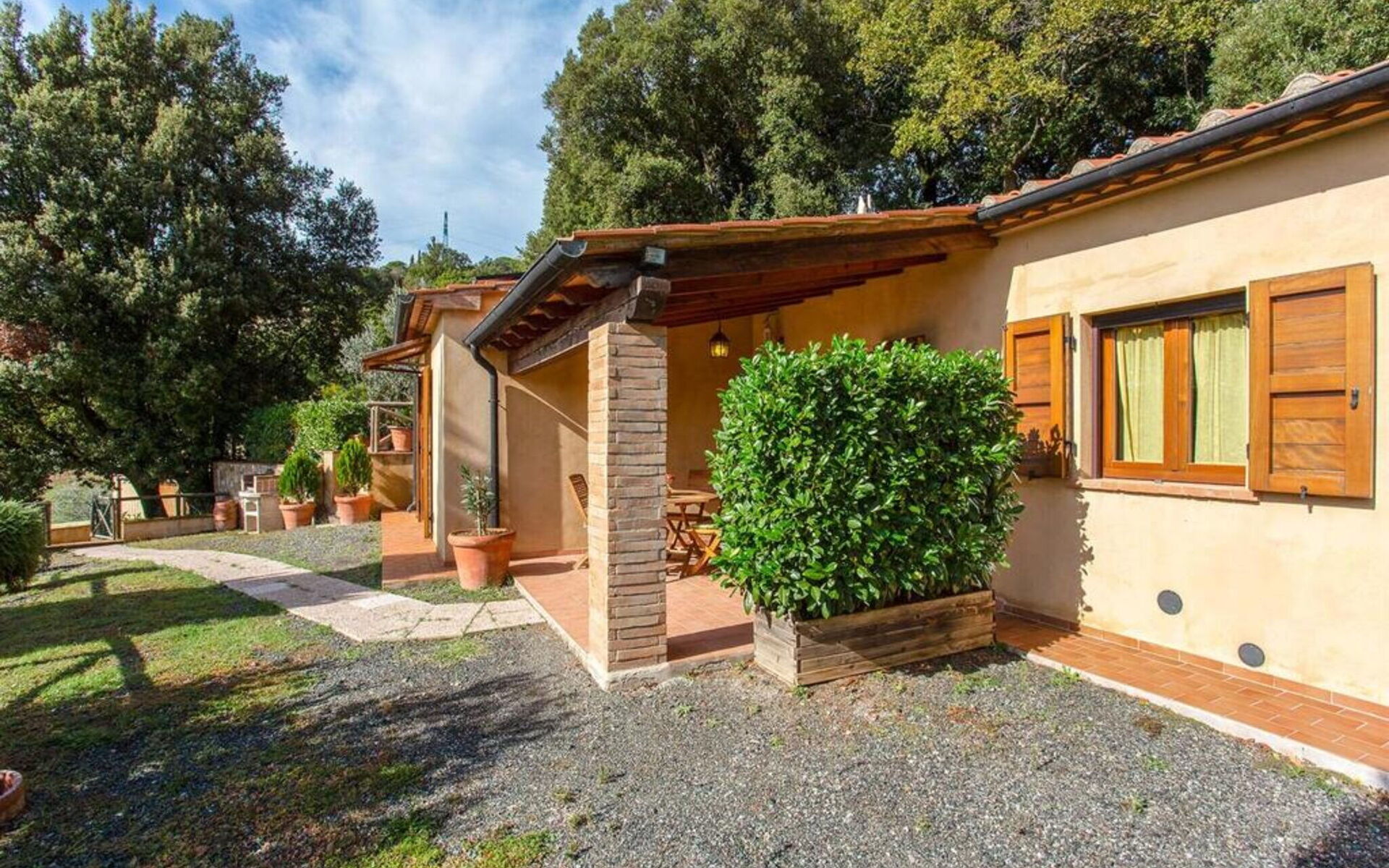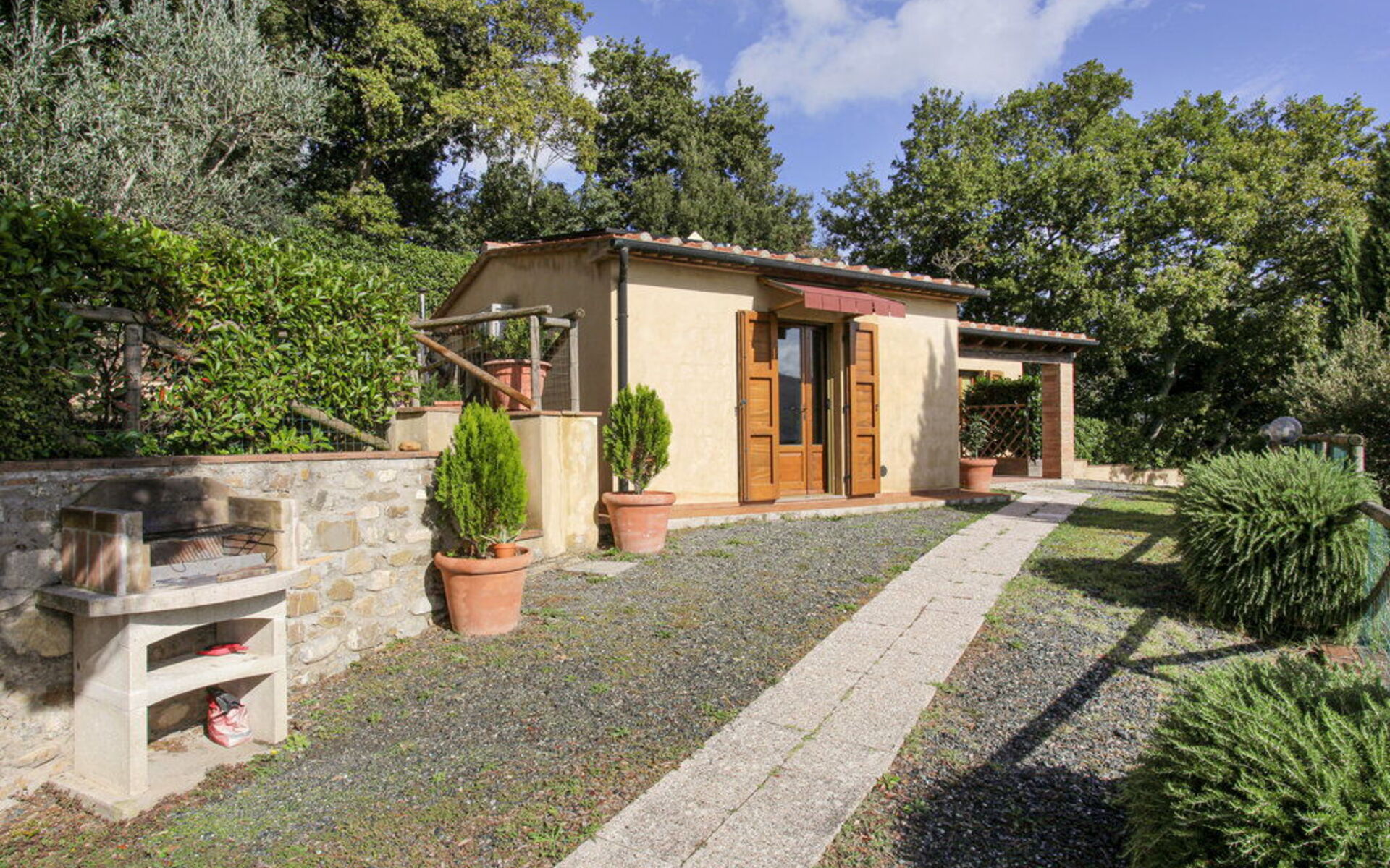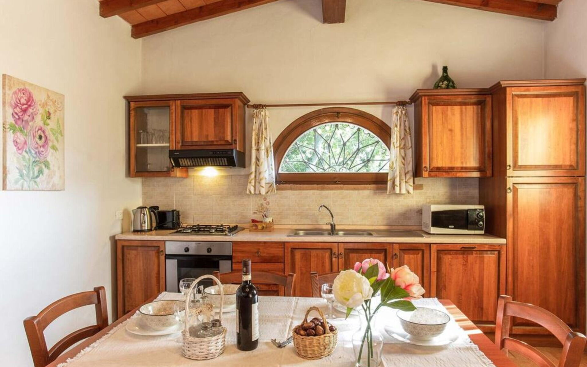 Au rez-de-chaussée: entrée - séjour avec cheminée (TV satellite, DVD) ouvrant sur la cuisine-salle à manger (gazinière, four, réfrigérateur, lave-linge, micro-ondes); 1 chambre à deux lits; 1 chambre double, 1 salle de bain avec baignoire et douche (WC / bidet). Loggia équipée pour les repas en plein air. Mobilier simple dans un style toscan rustique.