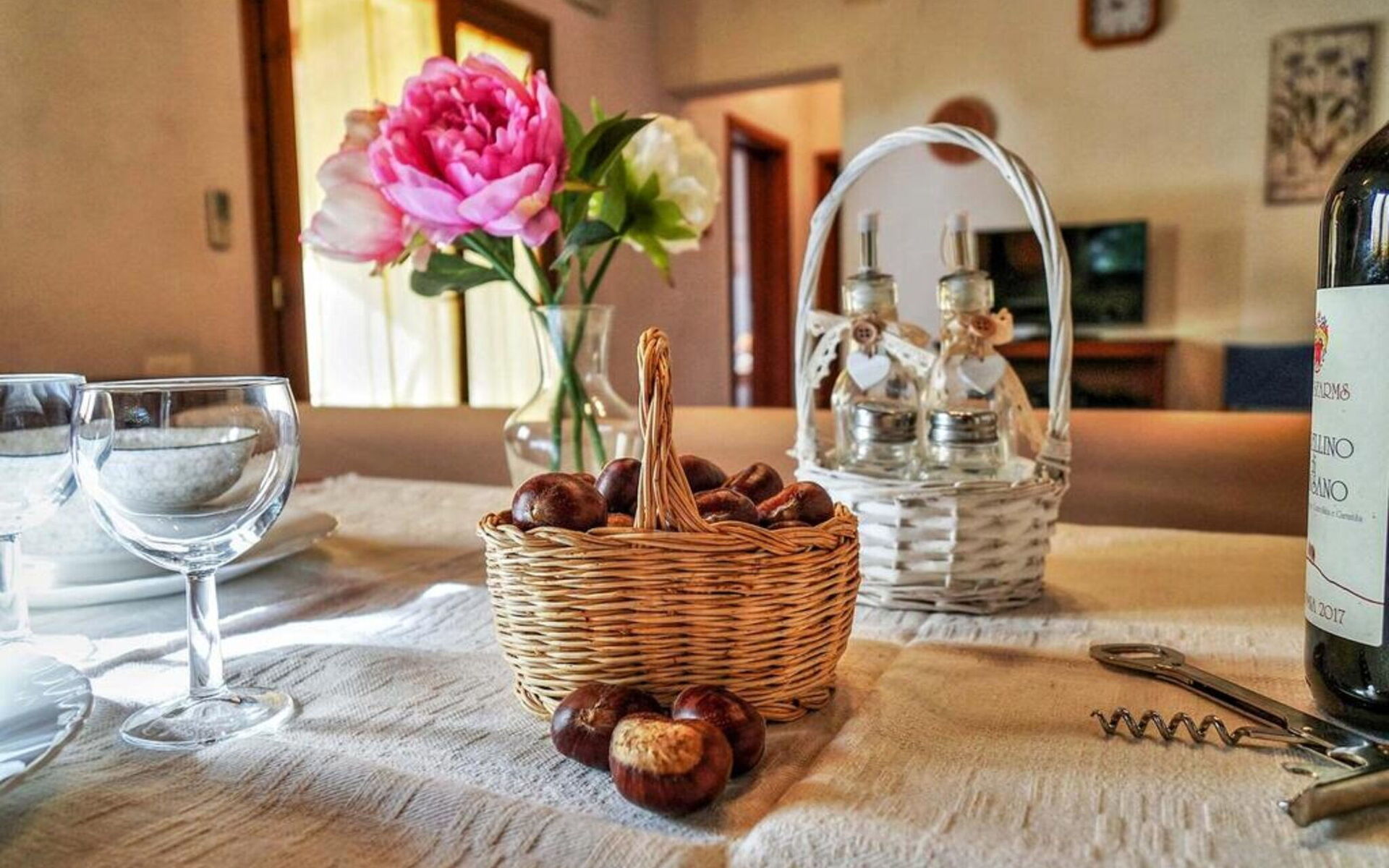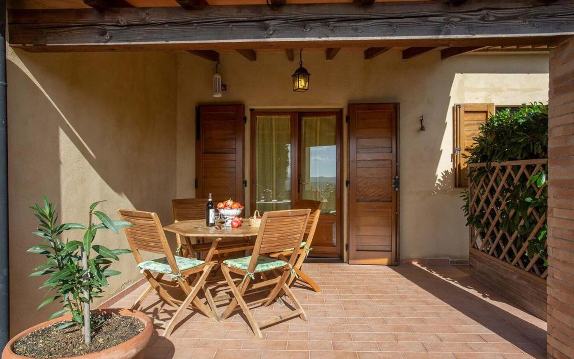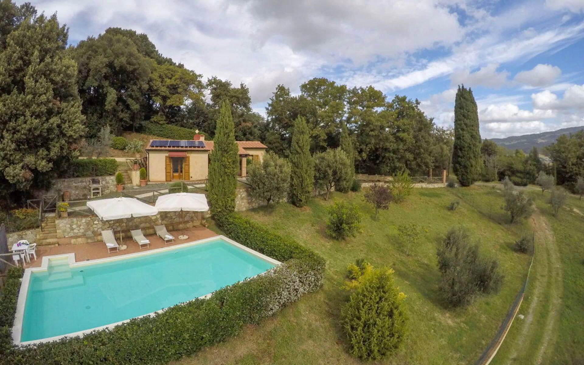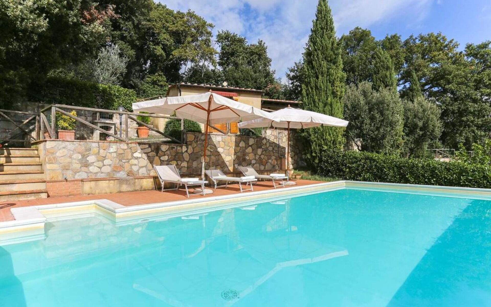 Au rez-de-chaussée: entrée - séjour avec cheminée (TV satellite, DVD) ouvrant sur la cuisine-salle à manger (gazinière, four, réfrigérateur, lave-linge, micro-ondes); 1 chambre à deux lits; 1 chambre double, 1 salle de bain avec baignoire et douche (WC / bidet). Loggia équipée pour les repas en plein air. Mobilier simple dans un style toscan rustique.