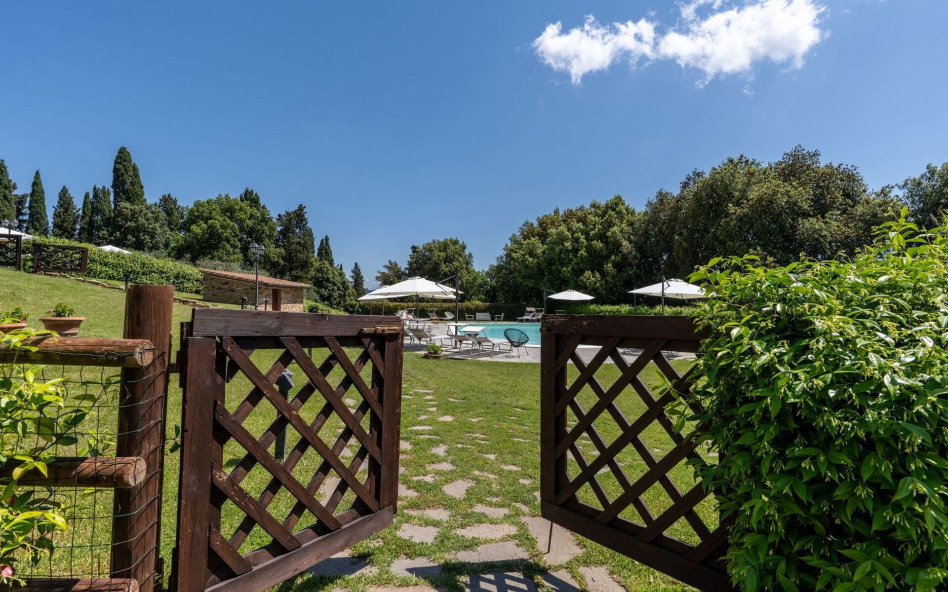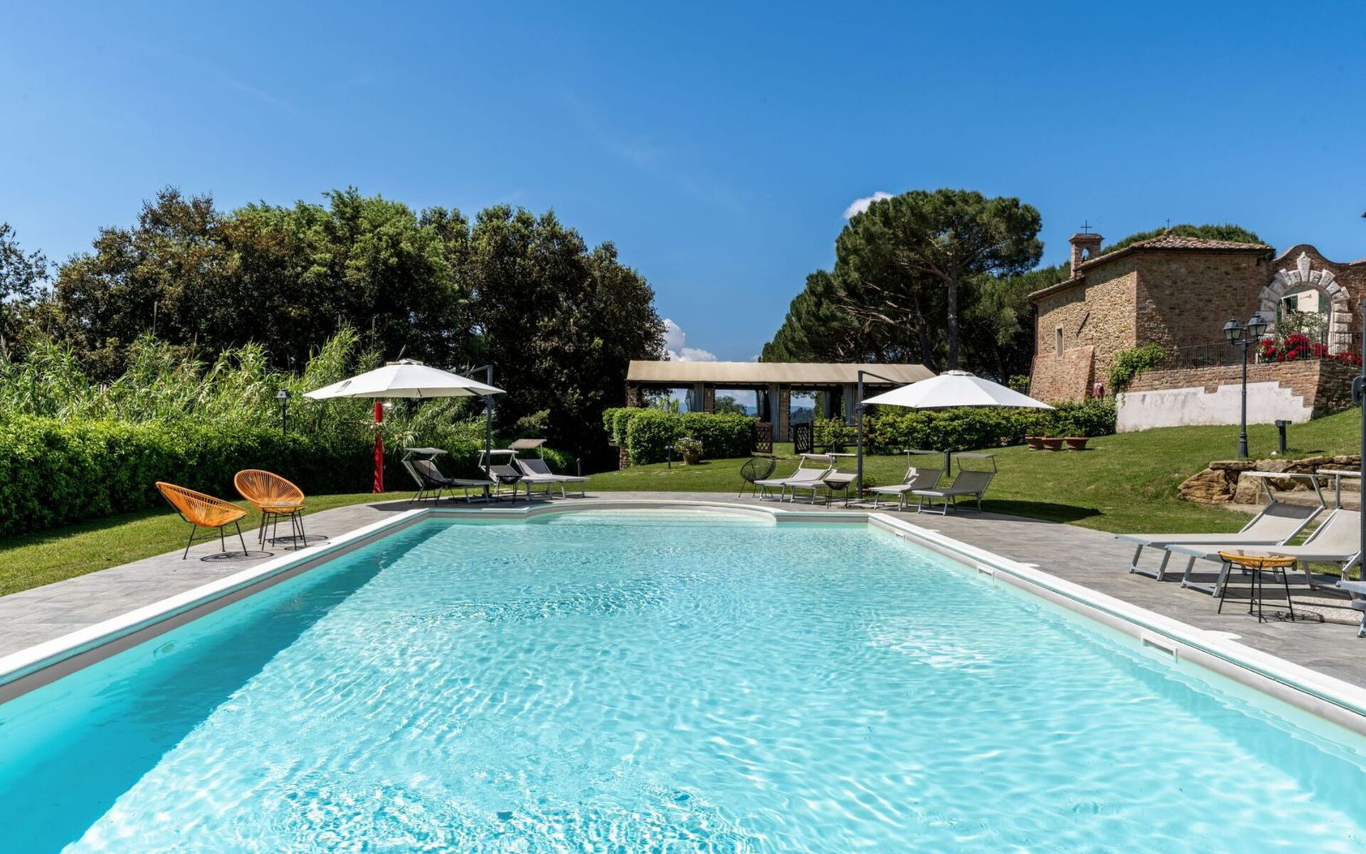 L’espace extérieur, vaste, bien entretenu et entièrement équipé, comprend une piscine en plein air, un espace accueillant avec gazebo privé pour chaque appartement—parfait pour un petit-déjeuner ou un apéritif à l’ombre des oliviers—et une aire de pique-nique avec barbecue pour des moments conviviaux en plein air. Une petite chapelle consacrée est également présente sur place, idéale pour célébrer des événements. Une grande véranda extérieure est à disposition des hôtes pour partager des moments ensemble.