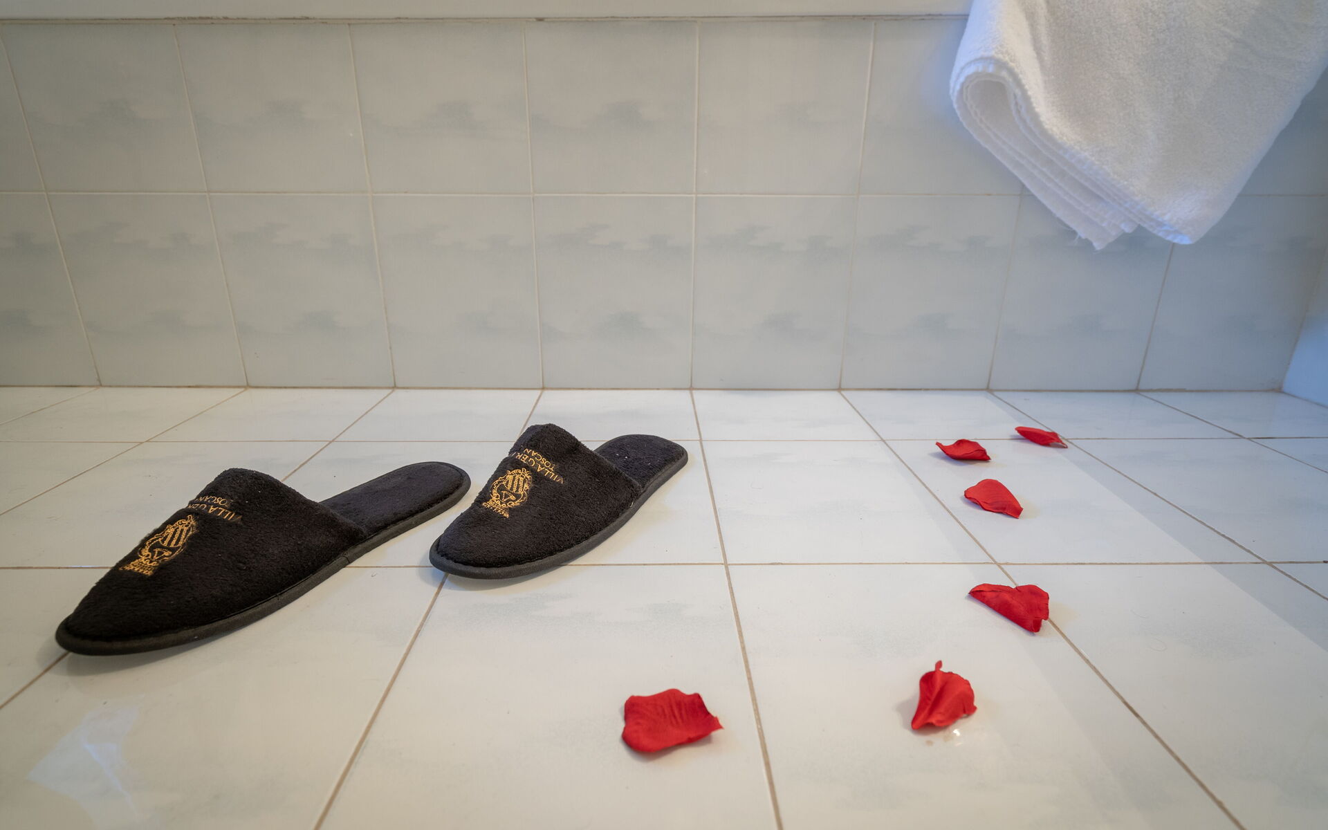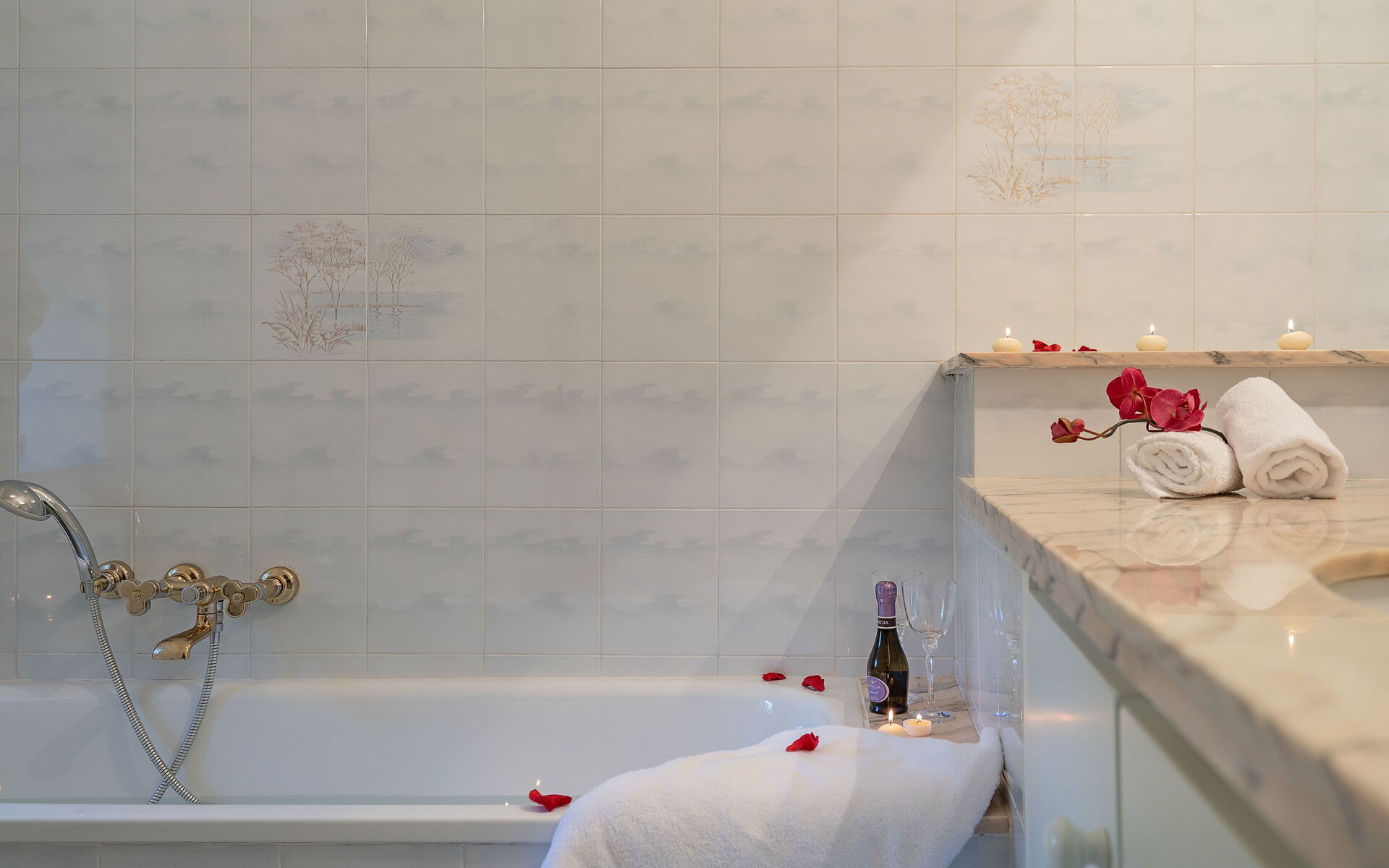 Salon / salle à manger avec coin cuisine et cheminée; 1 chambre avec lit double avec salle de bain privée avec jacuzzi (wc / bidet); 1 chambre avec deux lits simples; 1 salle de bain avec douche (wc / bidet).