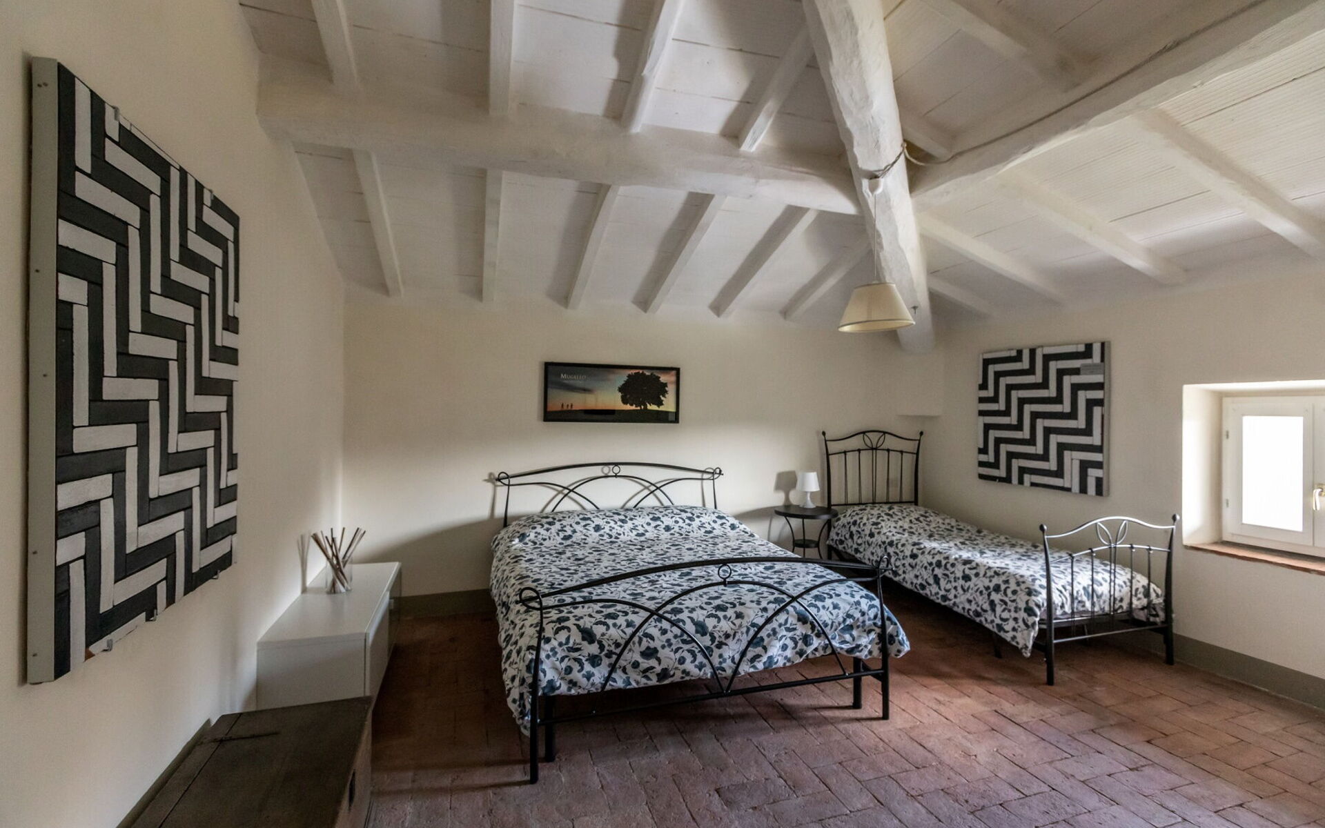 Au premier étage : 1 chambre à coucher avec lit double ; 1 chambre à coucher avec lit double et un lit simple ; 1 chambre à coucher avec 3 lits simples ; 2 salles de bains avec douche (WC/bidet).