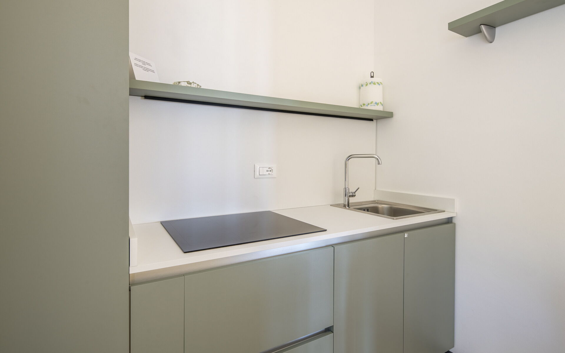 Kitchen and living room with single sofa bed, 1 double and 1 twin bedroom, bathroom with shower, furnished terrace with sea view.