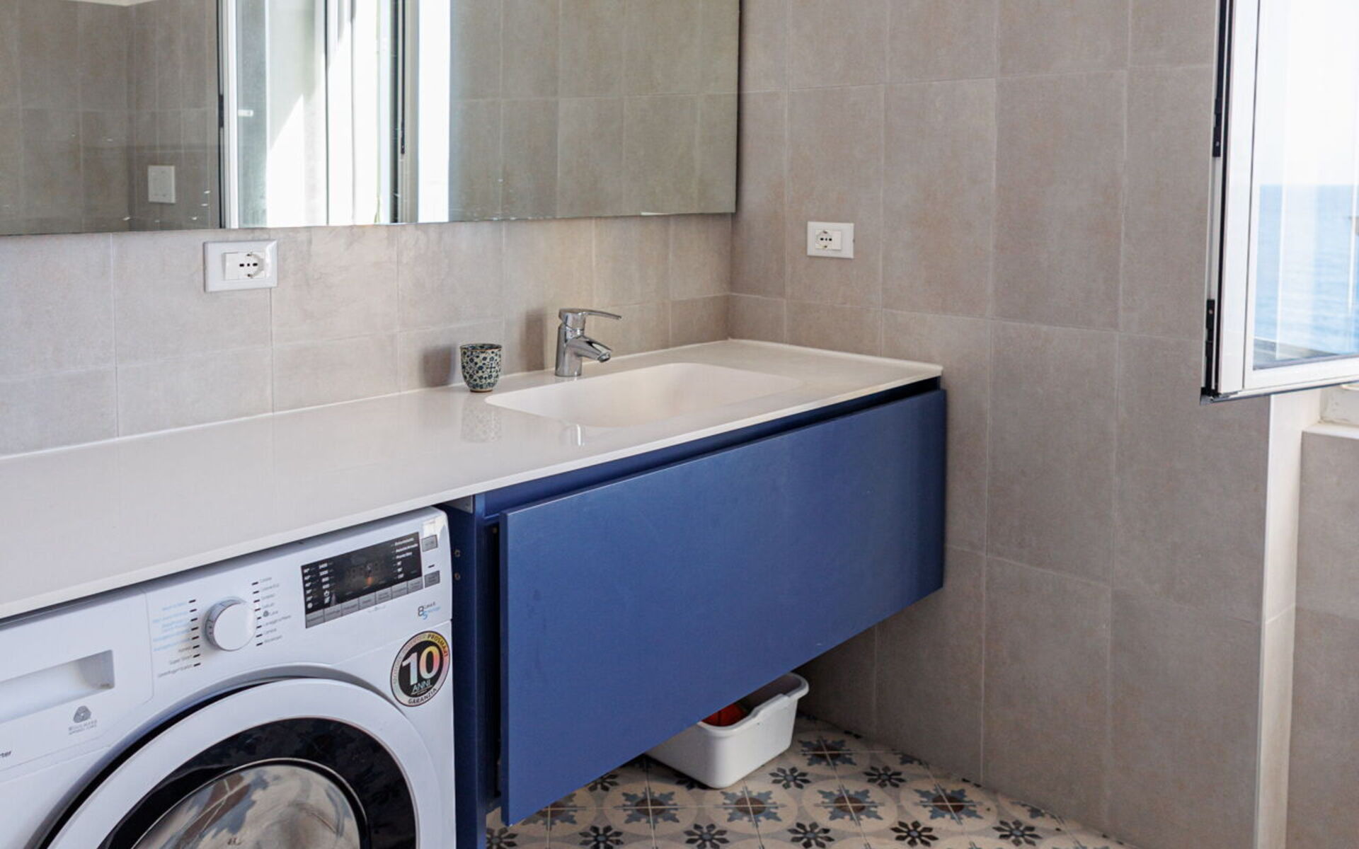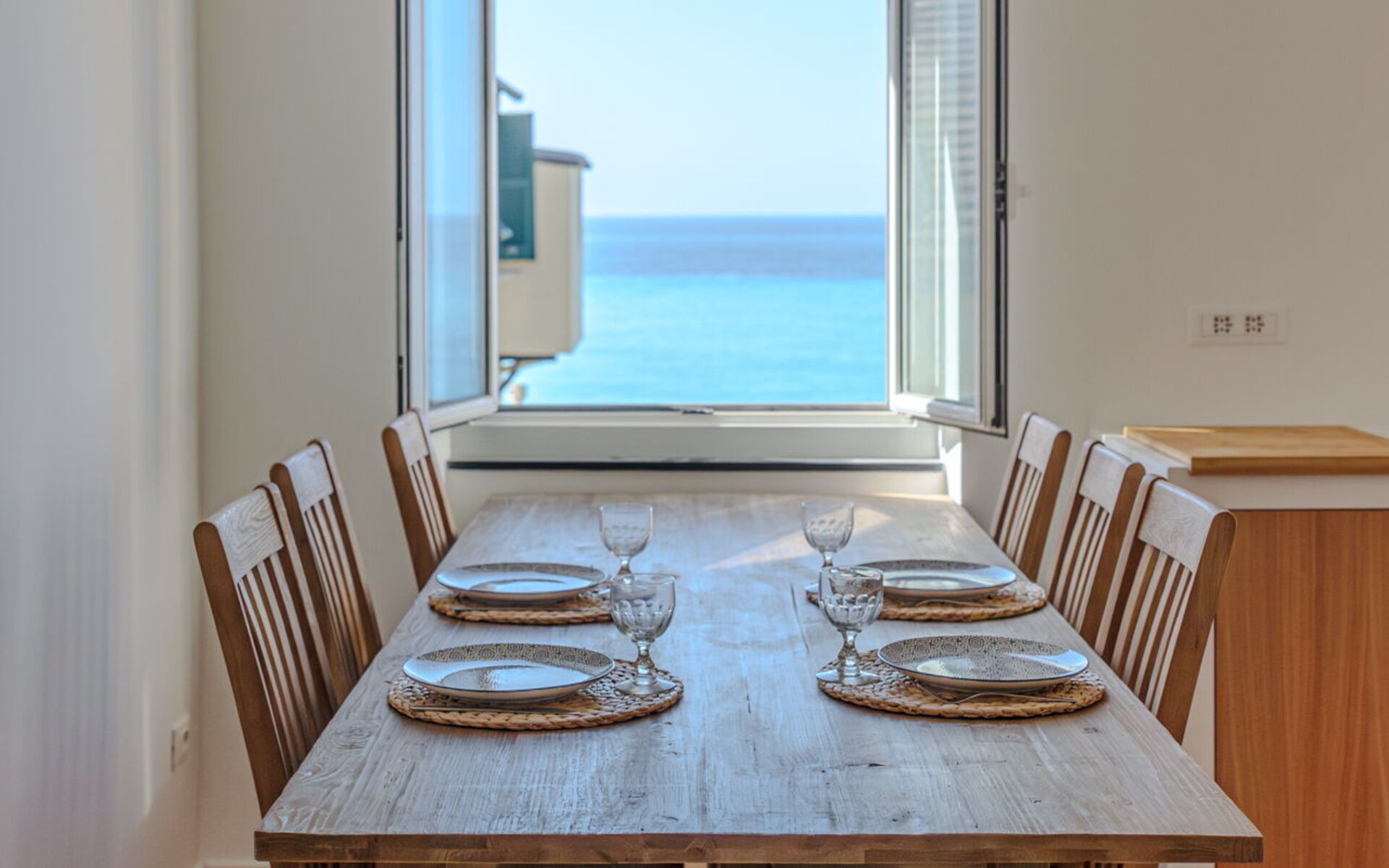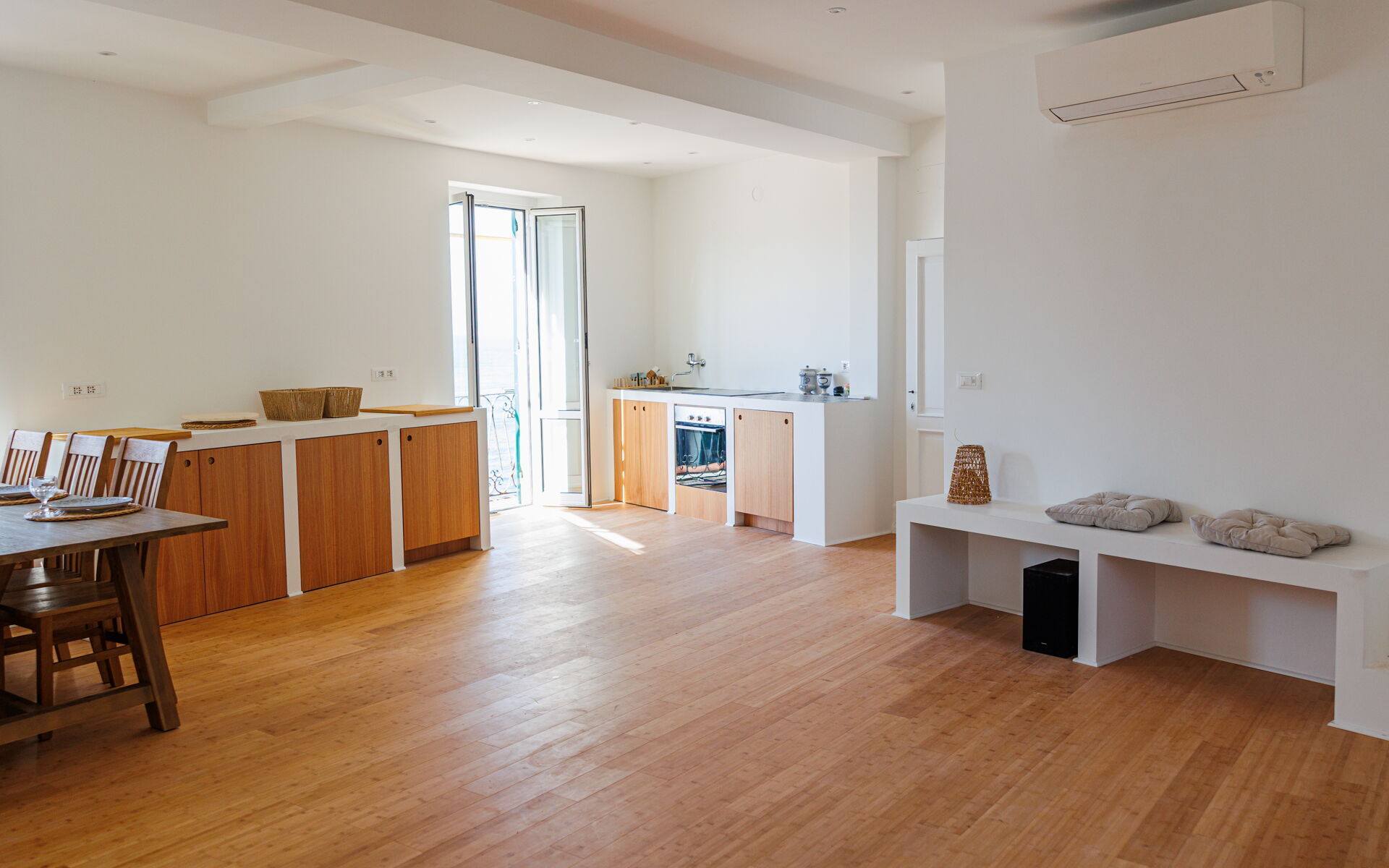 The apartment opens onto a large open space with a fully equipped kitchen with induction hobs, moka pot, oven, dishwasher and dining table. The living area is cosy and has a comfortable double sofa bed, television and air conditioning. Access to the balcony with sea view. The sleeping area comprises two cosy bedrooms, one double and one with two single beds. The bathroom, finished with quality materials, is equipped with a shower and washing machine.