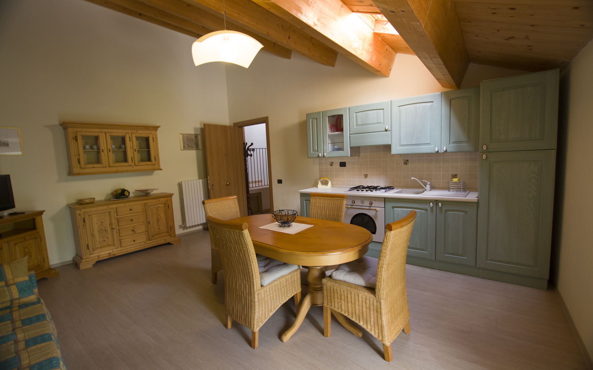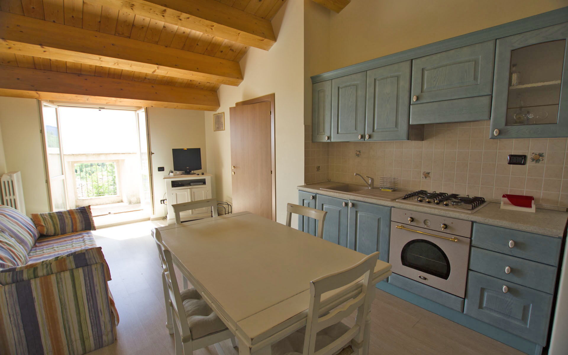 Dobro opremljena kuhinja, Pećnica, Zamrzivač, Frižider, WiFi internet, Perilica posuđa, Aparat za kavu (talijanski), Mikrovalna pećnica, Ploča za kuhanje, 2 Fotelja, Visoka stolica, Blagovaonski stol, Toster, Satelitska TV, Izlaz u vrt