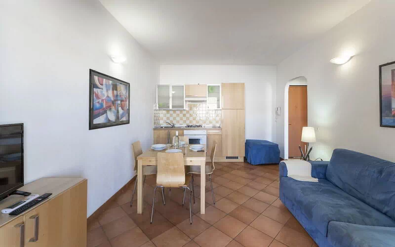 The flat consists of a living room with kitchenette, bedroom with double bed, double sofa bed, pouf convertible into a single bed, bathroom with shower, TV, air conditioning, microwave, safe, wi fi, furnished balcony.