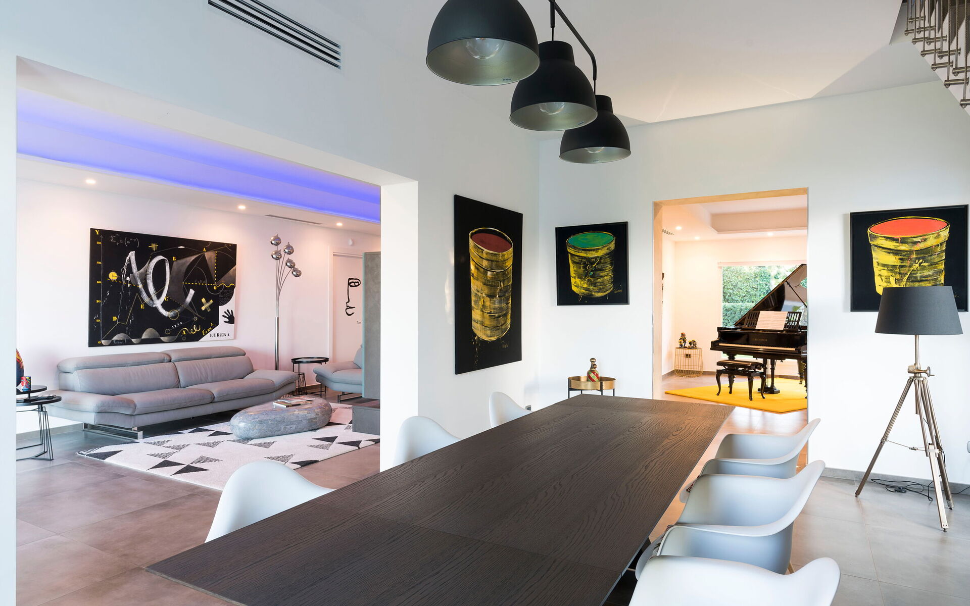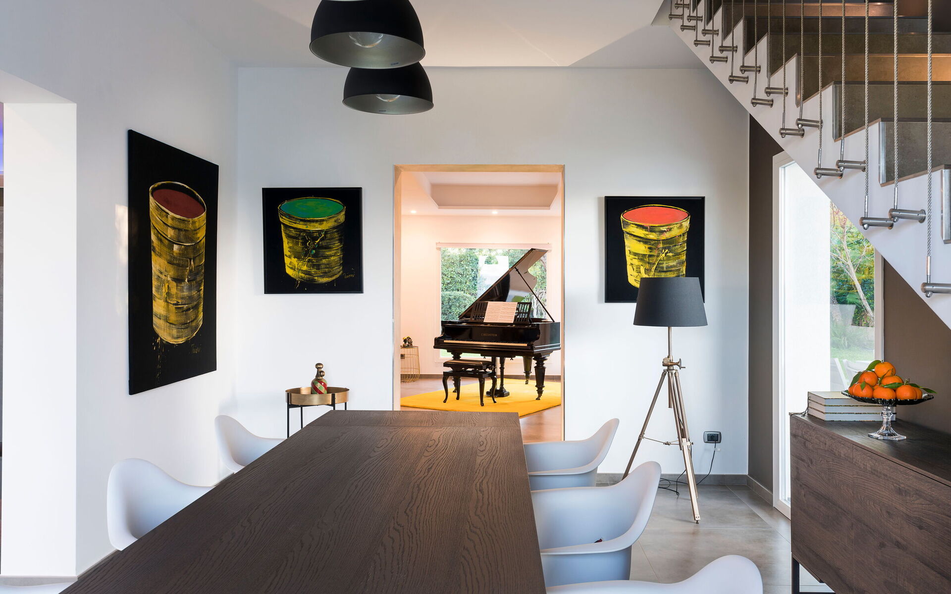 The house is recently built and presents itself as a contemporary residence. It has large and elegant spaces, with a design that includes authentic designer pieces.