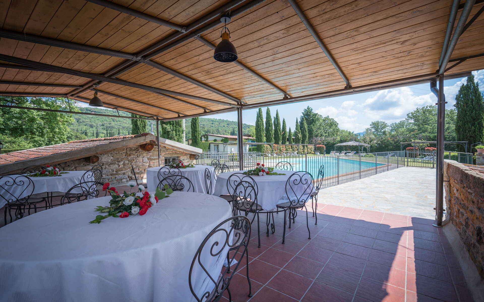 At the swimming pool gazebo, sun loungers.