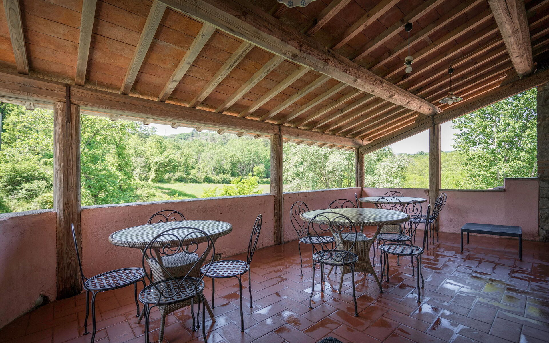 Open but covered terrace of approx. 60 sqm, equipped with tables, chairs, brick barbecue, outdoor / sheltered wood oven.