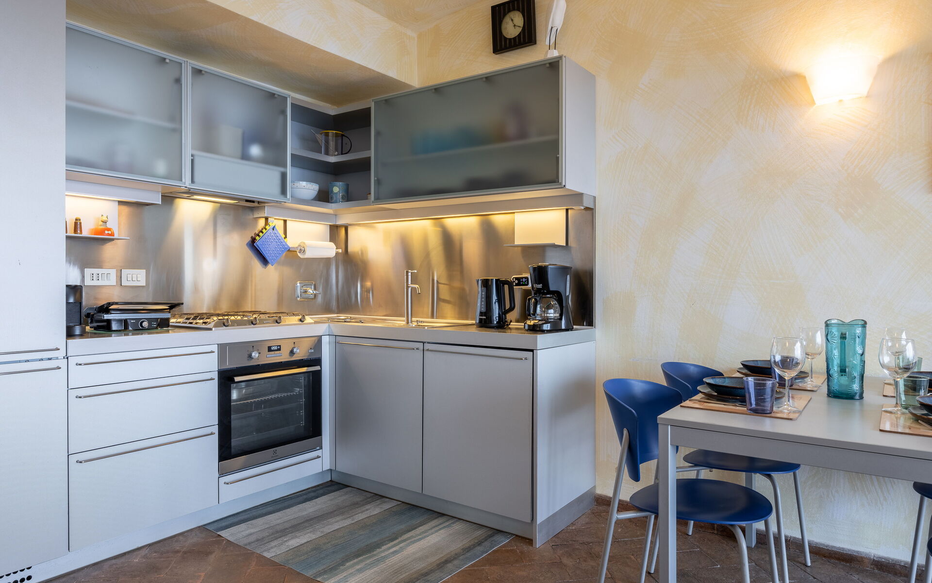 Klimatizacija, Američki aparat za kavu, Jasle, CO2 detektor, Blagovaonski stol, Izlaz na terasu, Zamrzivač, Frižider, Visoka stolica, Željezo, Aparat za kavu (talijanski), Mreže protiv komaraca, Pećnica, Satelitska TV, Detektor dima, Ploča za kuhanje, Toster, Dobro opremljena kuhinja, WiFi internet