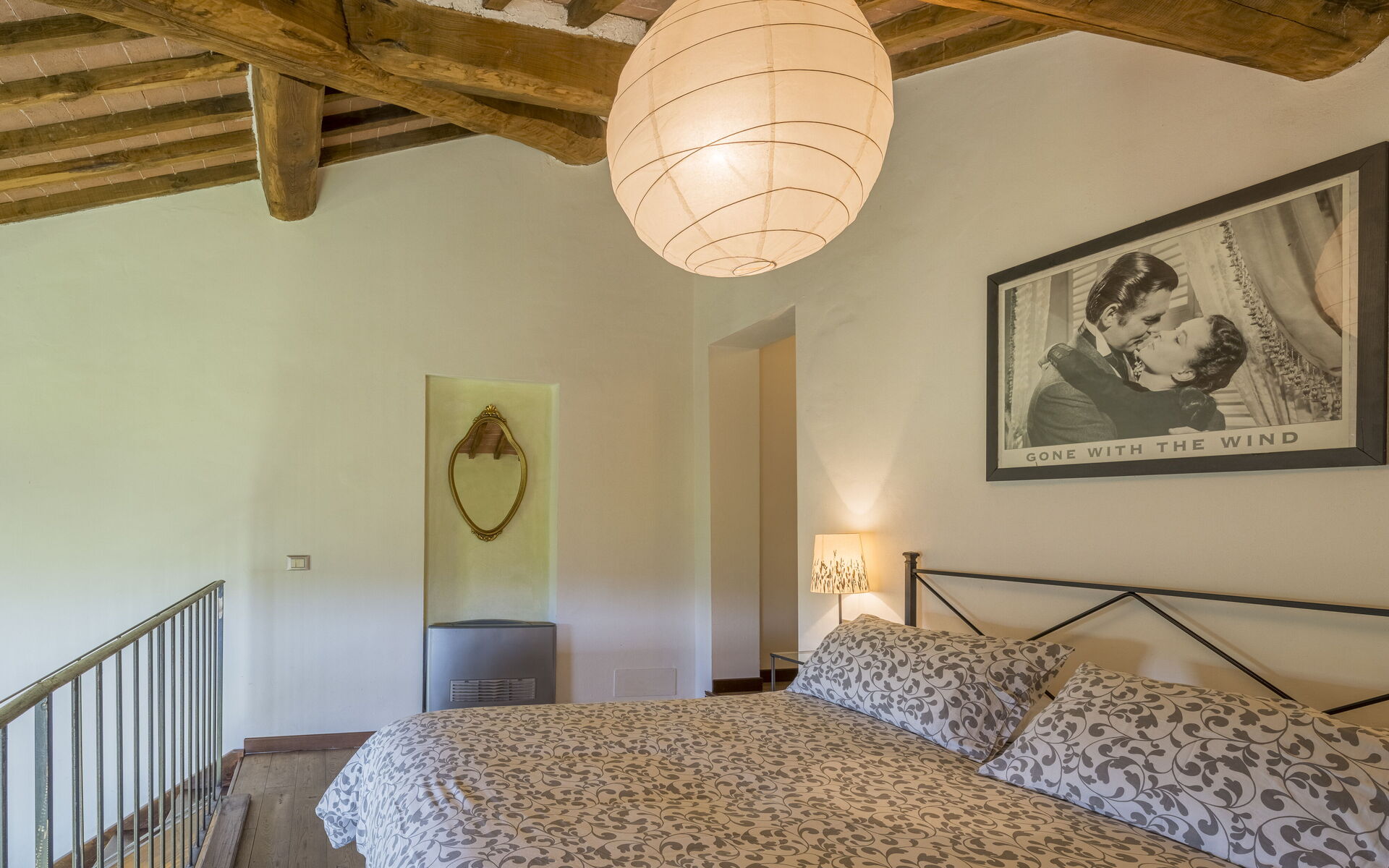 On the second floor mezzanine with kitchen-living room and sleeping area with double bedroom with single sofa bed, 2 bathrooms with shower.