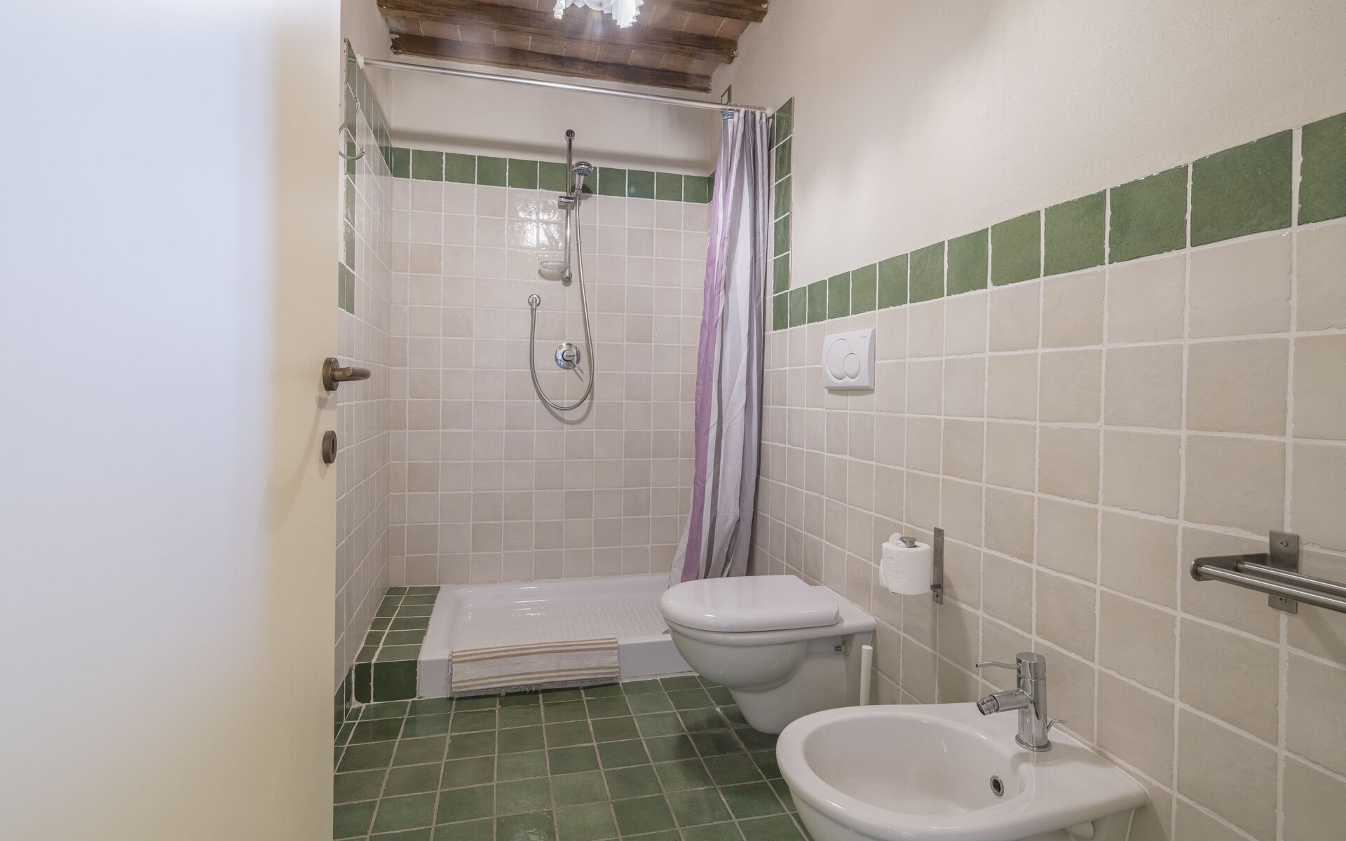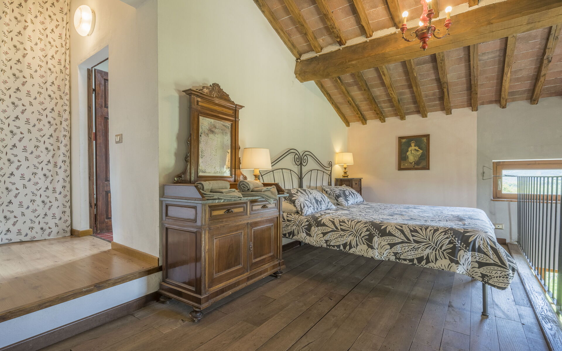 On the second floor mezzanine with kitchen-living and sleeping area with double bedroom with single sofa bed, 2 bathrooms with shower