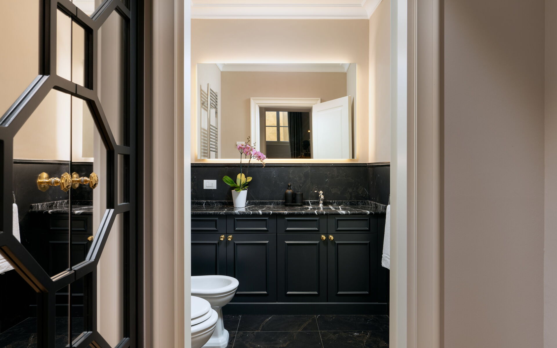The living room, embellished with original 16th century frescoes, offers a unique and elegant atmosphere. Here you will find a magnificent dining table for 10 people, comfortable seating and a 60-inch SMART TV for evenings of pure entertainment. The house also has a lobby for business calls or meetings.