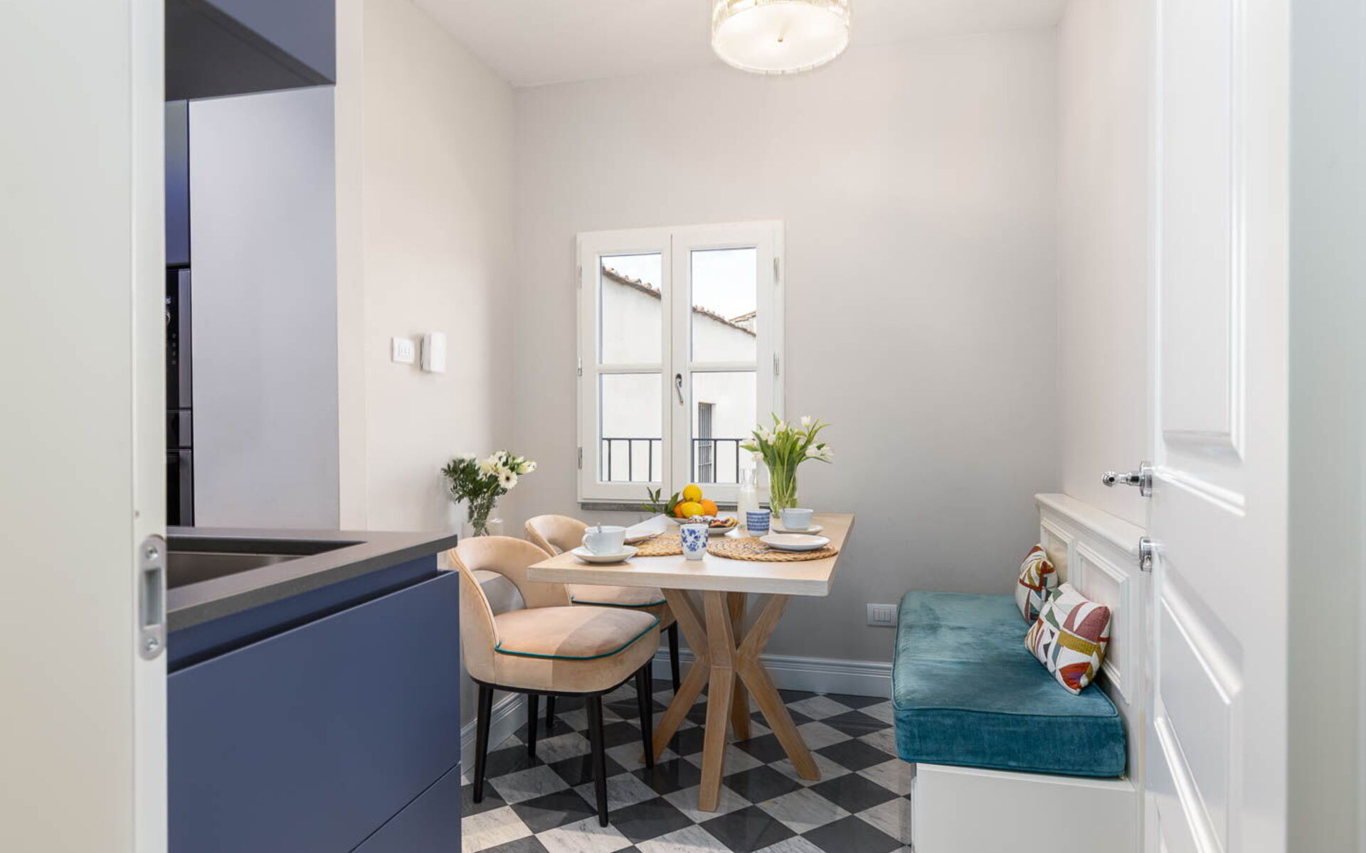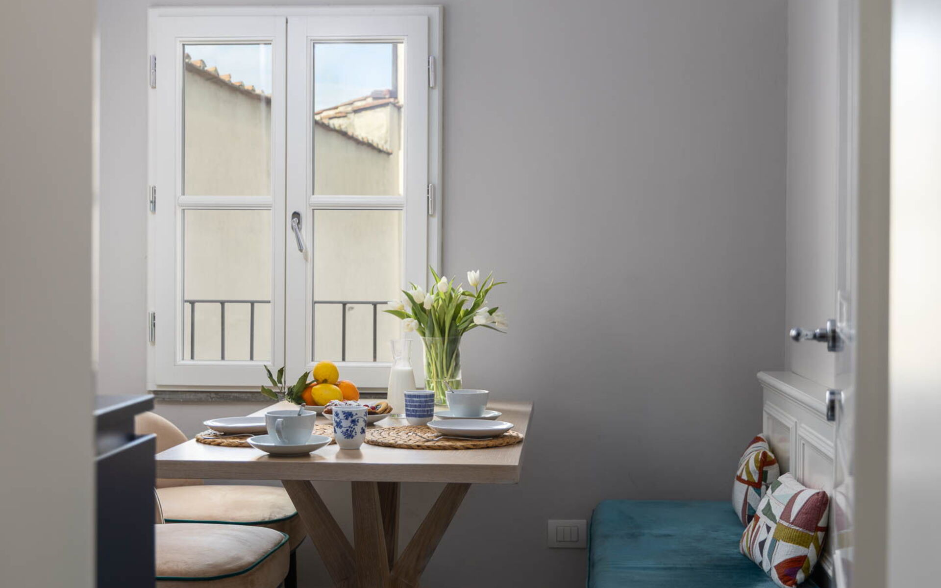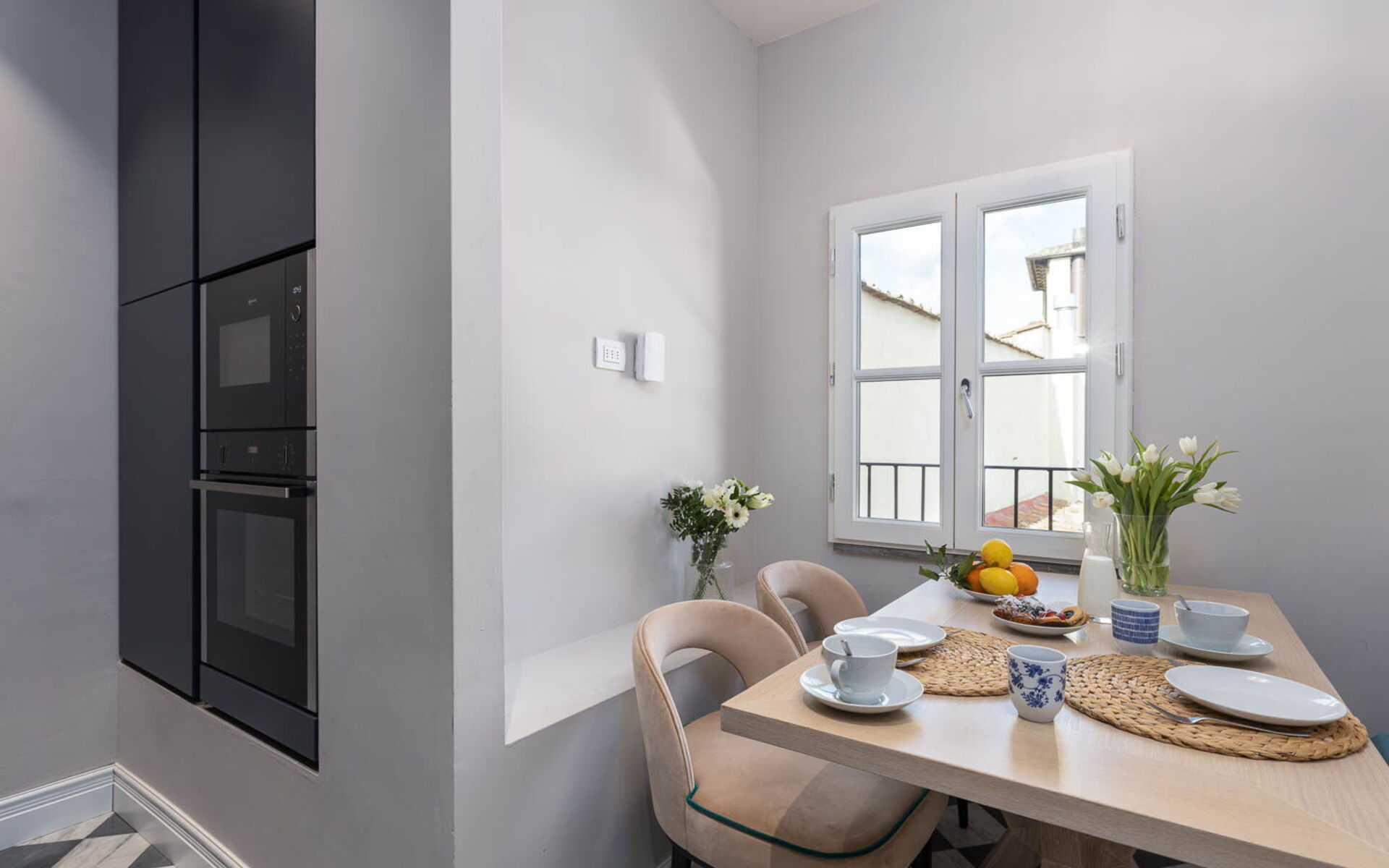 The apartment offers two living rooms: one boasting this magnificent view and a unique, elegant atmosphere, and the other equipped with a double sofa bed.