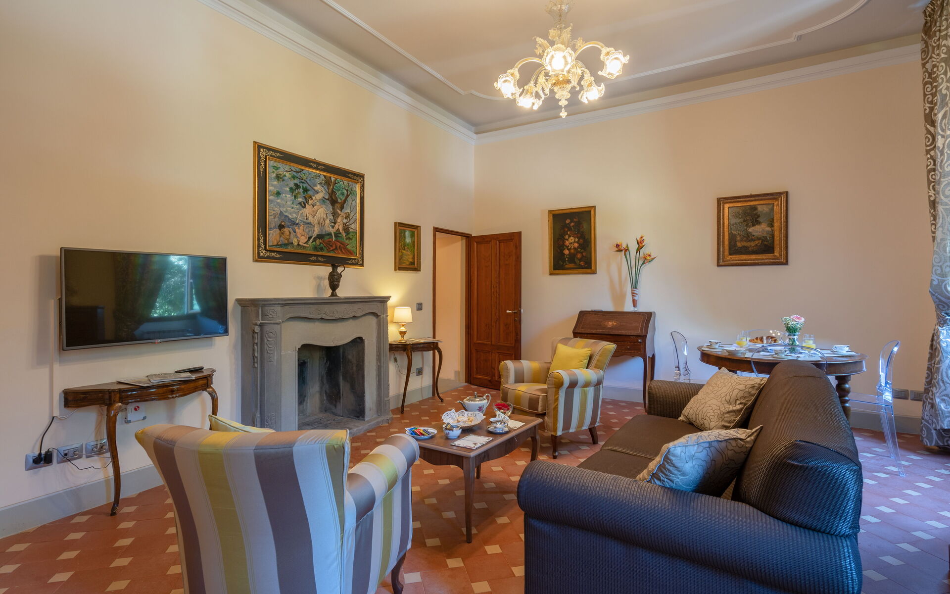 The villa, dating back to the 18th century and recently renovated, is on several levels and comprises 6 independent units for a total of 26 places. The furnishings are finely detailed, guaranteeing the atmosphere and authenticity of an 18th-century villa, with period furniture and antiques. The structure lends itself very well to being rented out as a single room as on the ground floor there is a large dining room where everyone can comfortably eat together, while on the first floor there is a fully-equipped professional communal kitchen. The use of the professional kitchen is only permitted to the chef appointed by the property or to professionals with HACCP certification, subject to approval by the property.