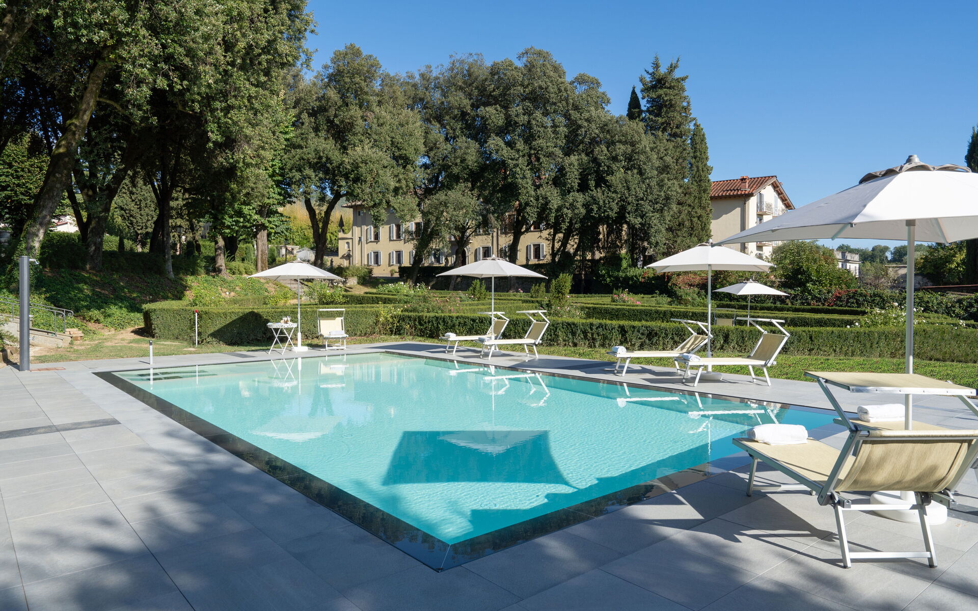 Surrounding the villa is a well-kept and evocative Italian garden with its statues, hedges and centuries-old trees. In this fairytale setting we also find the beautiful infinity pool (6m.x11m., depth 150), for the exclusive use of guests, with a shallow water area for children and a relaxation corner with hydro-massage. The park is also equipped with a gazebo, armchairs, tables and chairs, where guests can relax for an aperitif or dine al fresco, also using the barbecue at their disposal.