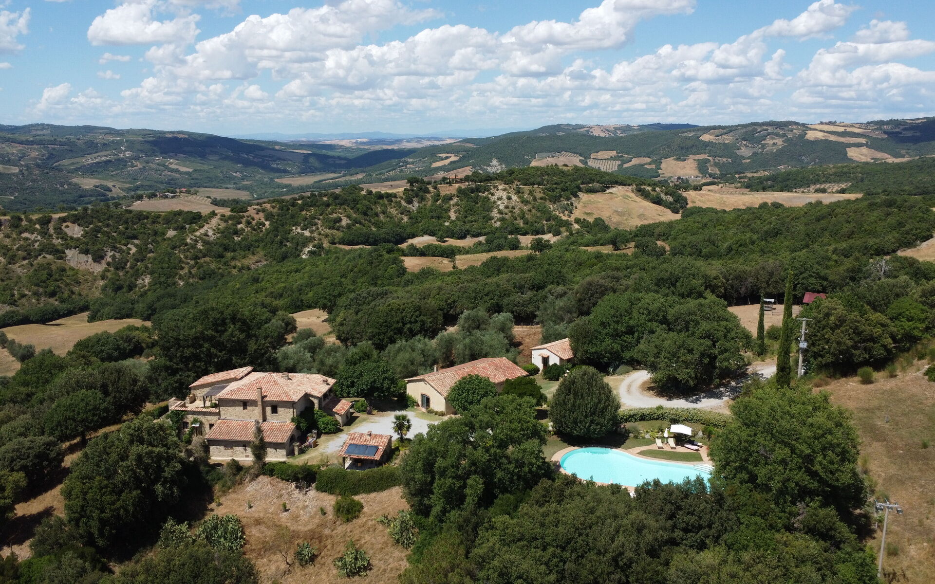 Guests can enjoy spacious outdoor areas and a large, sunny panoramic swimming pool (18 x 9 m), ideal for relaxation. It is possible to eat meals together on the veranda or, in case of bad weather, in the common room. The location is strategic for visiting Montalcino, Bagno Vignoni and Pienza, all within approximately 20 km, and for walking and hiking in the surrounding woodland.