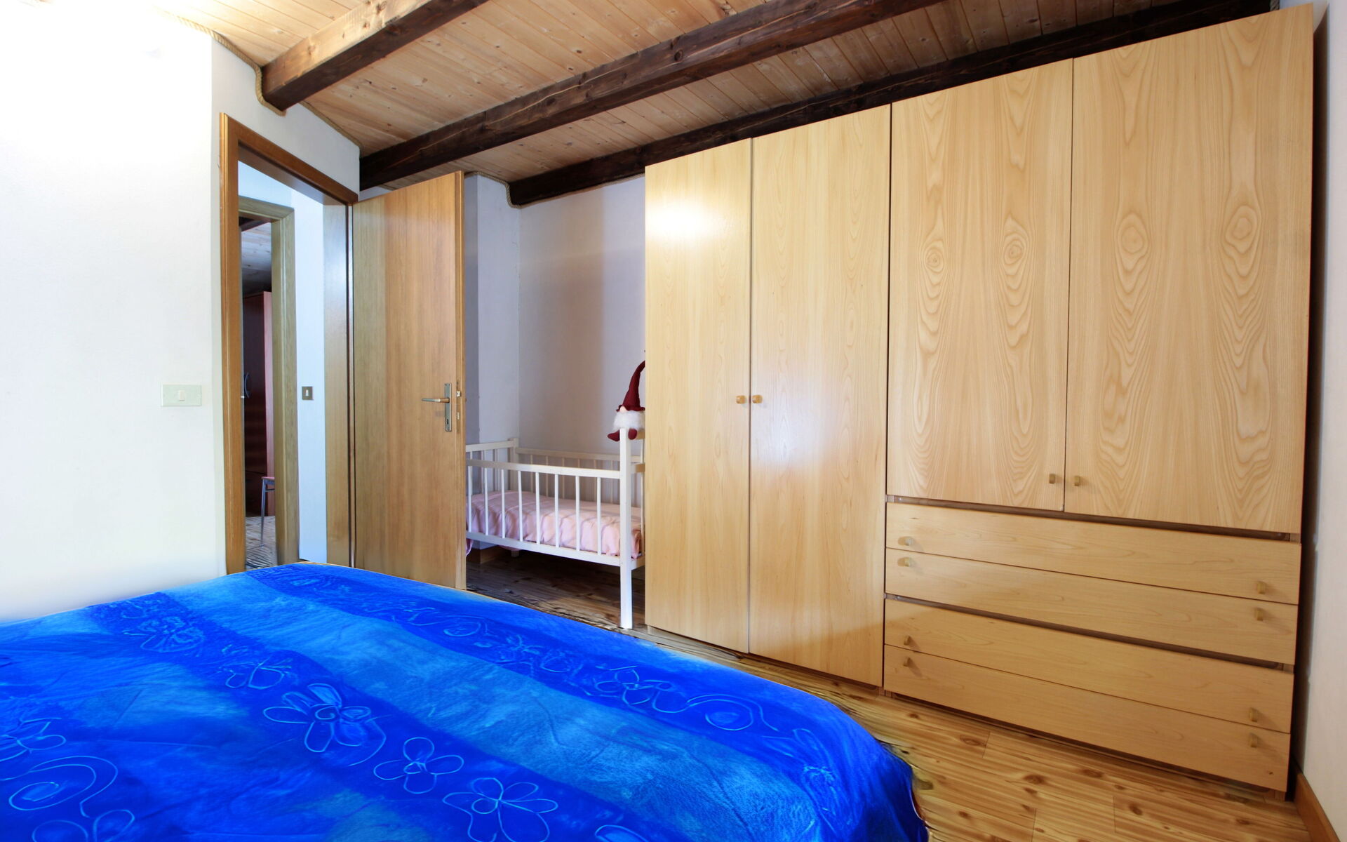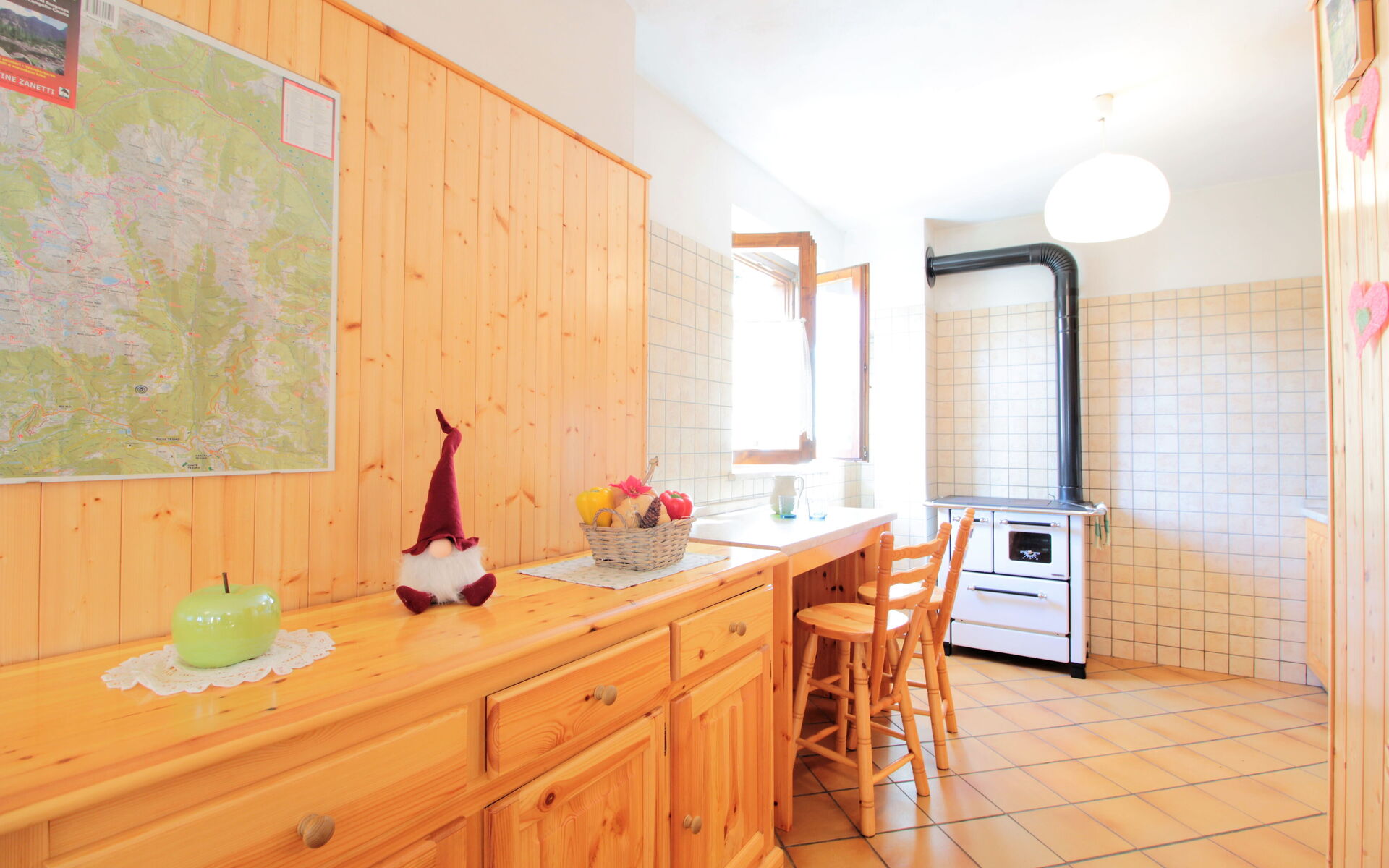 The chalet, built of stone and wood, has two floors connected by a staircase. On the ground floor, you will find a large room characterised by the kitchen, which is somewhat separate and has a wood-burning stove, the living room with dining table, sitting area and fireplace, and the first bathroom (with toilet, sink and washing machine).