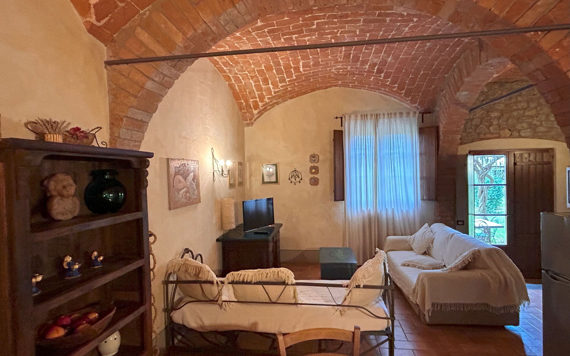 The flat is located in a rural stone house and has been renovated and tastefully furnished in the Umbrian style. It consists of a large living room with sofas and a sofa bed, a fully equipped kitchenette with all appliances (dishwasher, hob, microwave oven, fridge and freezer). Two large bedrooms, one with a double bed and a second with two beds. A bathroom with shower completes the flat. A wi-fi line is present.