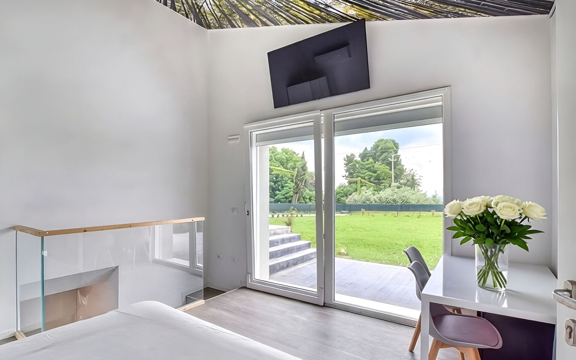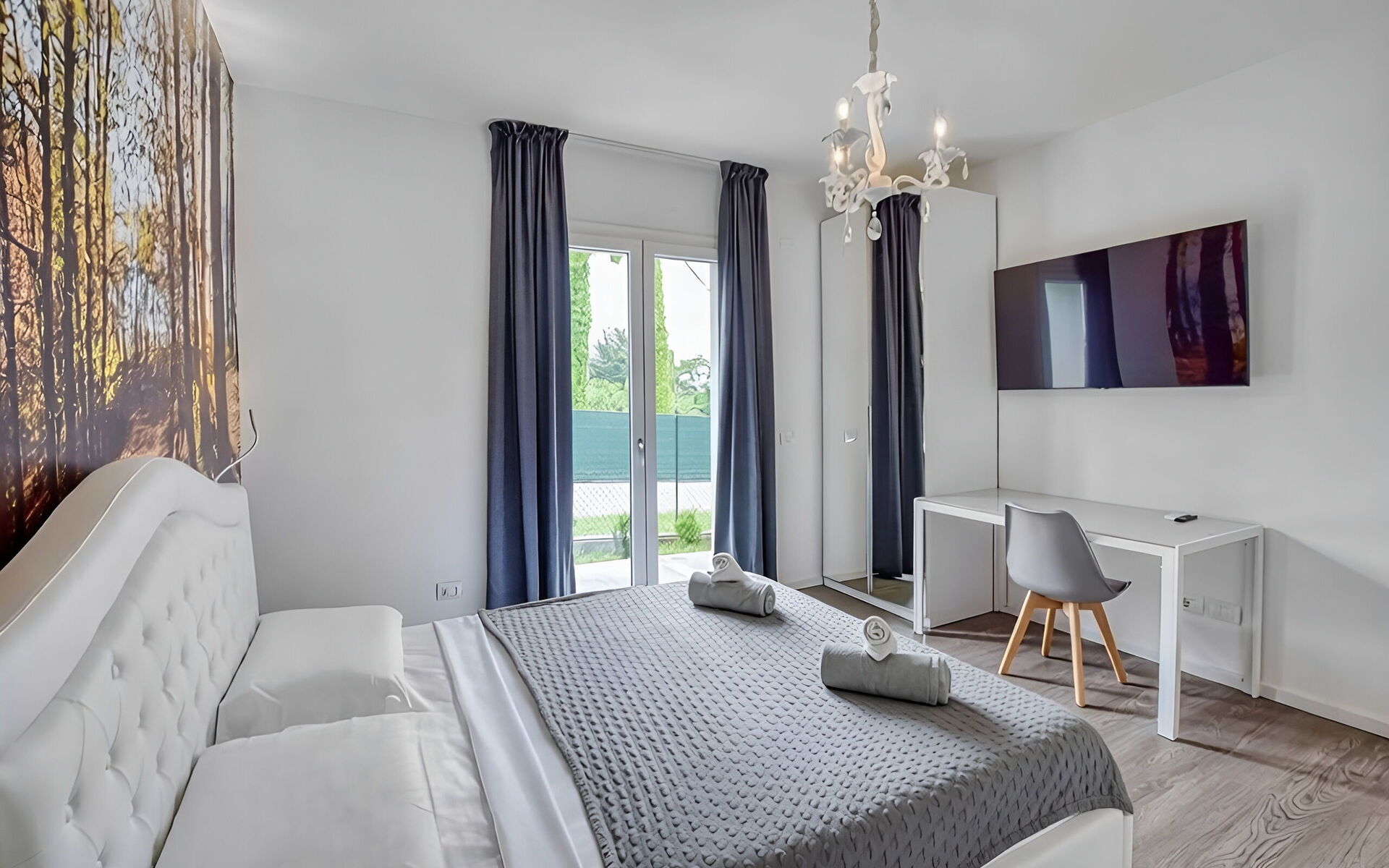 Outside, the large private fenced garden offers ideal spaces for sunbathing, relaxing on the veranda (accessible via 4 steps) or enjoying convivial moments with a barbecue, accompanied by a glass of Valdobbiadene Prosecco.