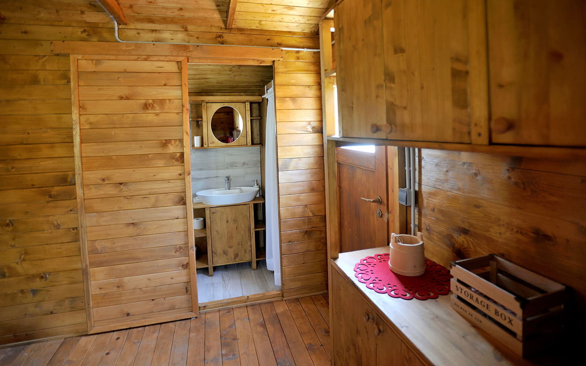The second house has a bathroom with an indoor shower, and there is also an outdoor shower for fresh air.