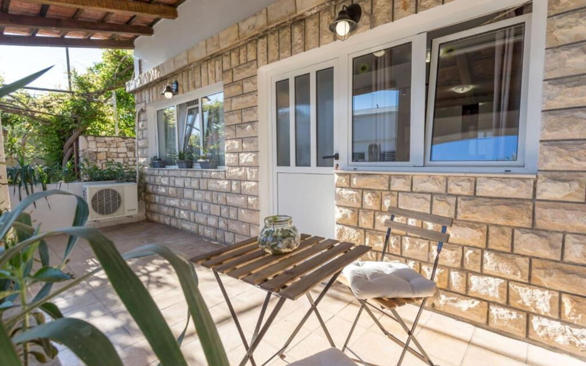 The flat is on the ground floor. It is equipped with heating, air conditioning and free unlimited wi-fi. It has a separate entrance from which you enter the living area consisting of a sofa, dining table and a fully equipped kitchen with oven, refrigerator, dishwasher and all other kitchen utensils. Towels and bed linen are at guests' disposal. It consists of a large bedroom with a double bed and a complete bathroom with a shower cubicle. The flat is surrounded by a large fenced-in courtyard and is therefore suitable for travellers with animals. From the terrace there is a view of a real garden with plants that are typical of this island, which creates plenty of shade on hot, sunny days and guarantees privacy and relaxation. The outdoor area is equipped with elegant and comfortable garden furniture and guests have access to a barbecue.