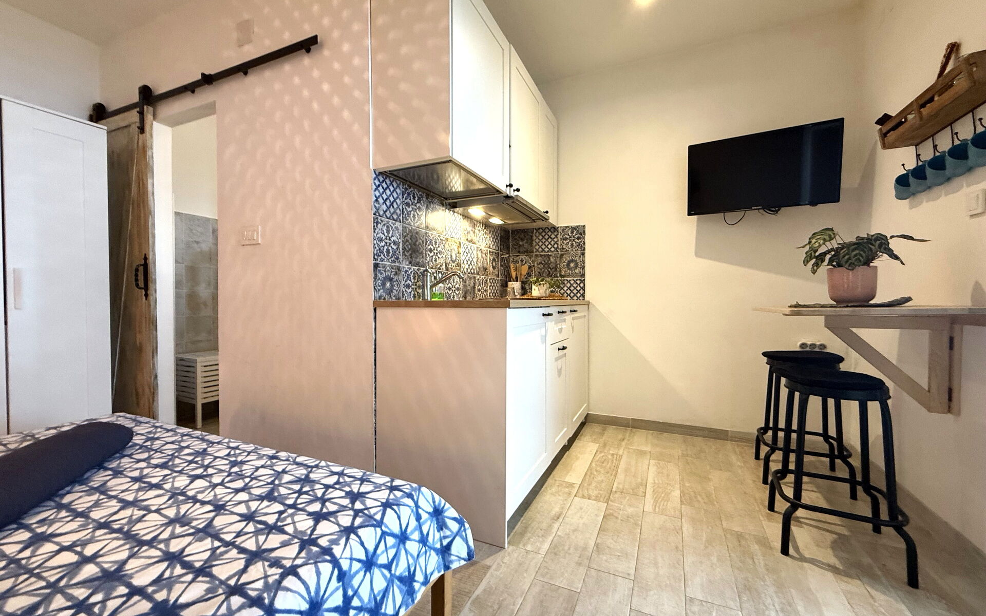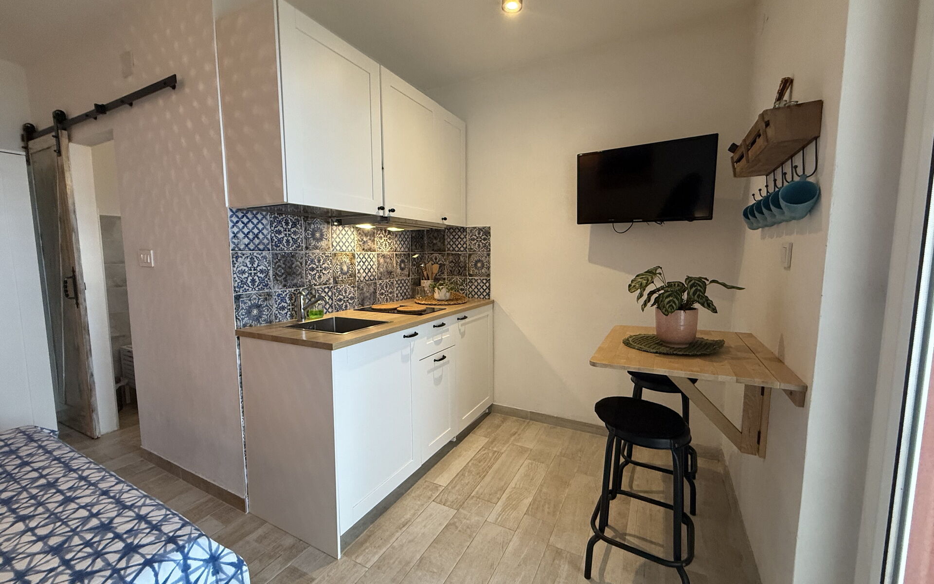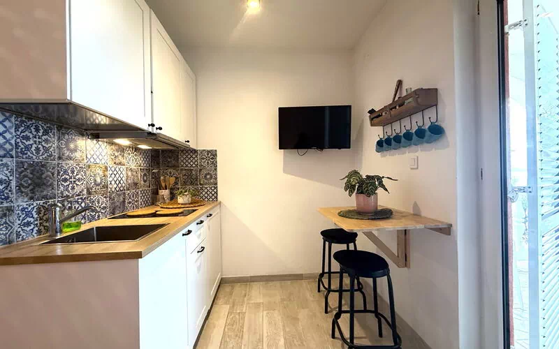The flat is equipped with everything necessary for a pleasant stay, such as a living area and kitchenette with a double bed. Equipped with television and wifi internet. There is a bathroom with shower.