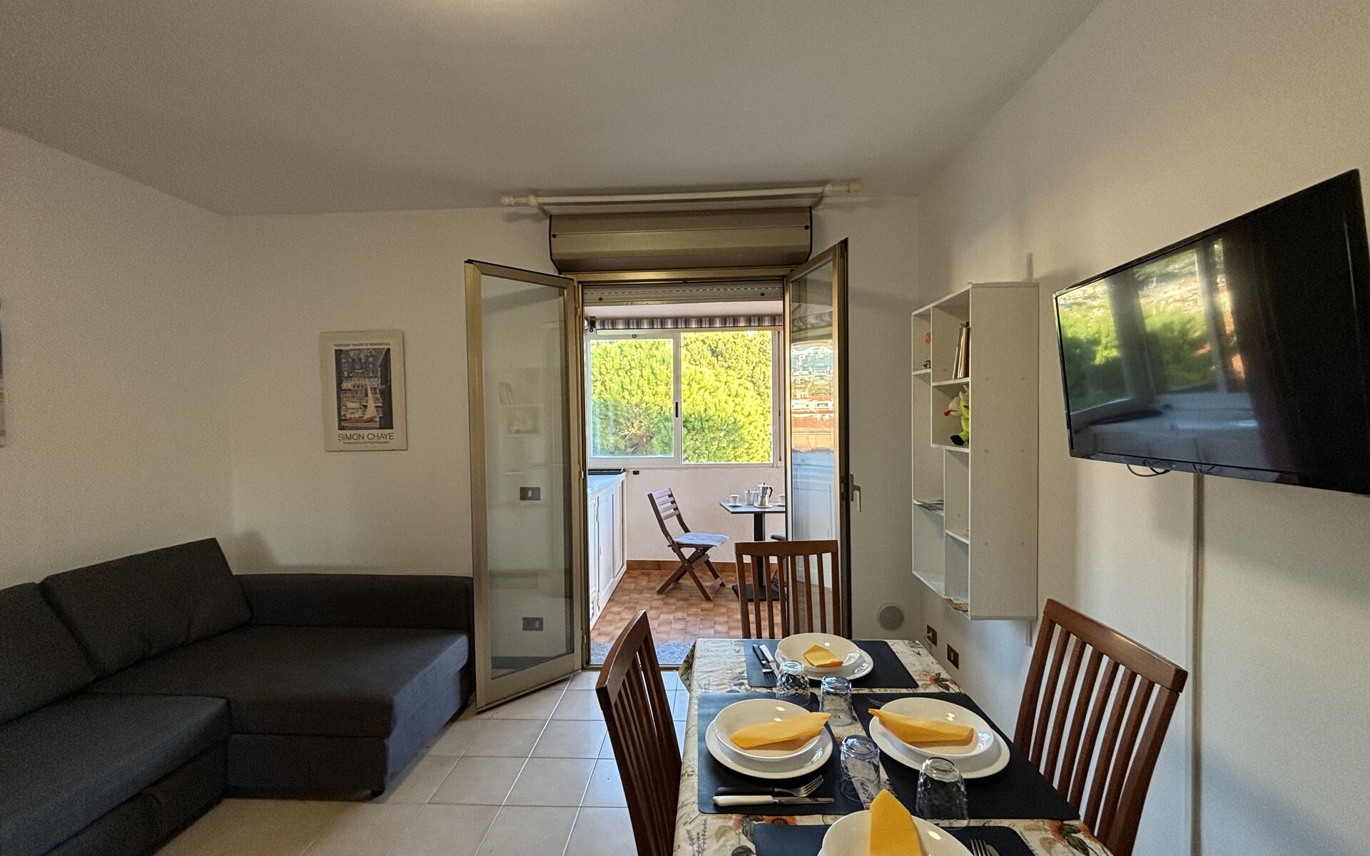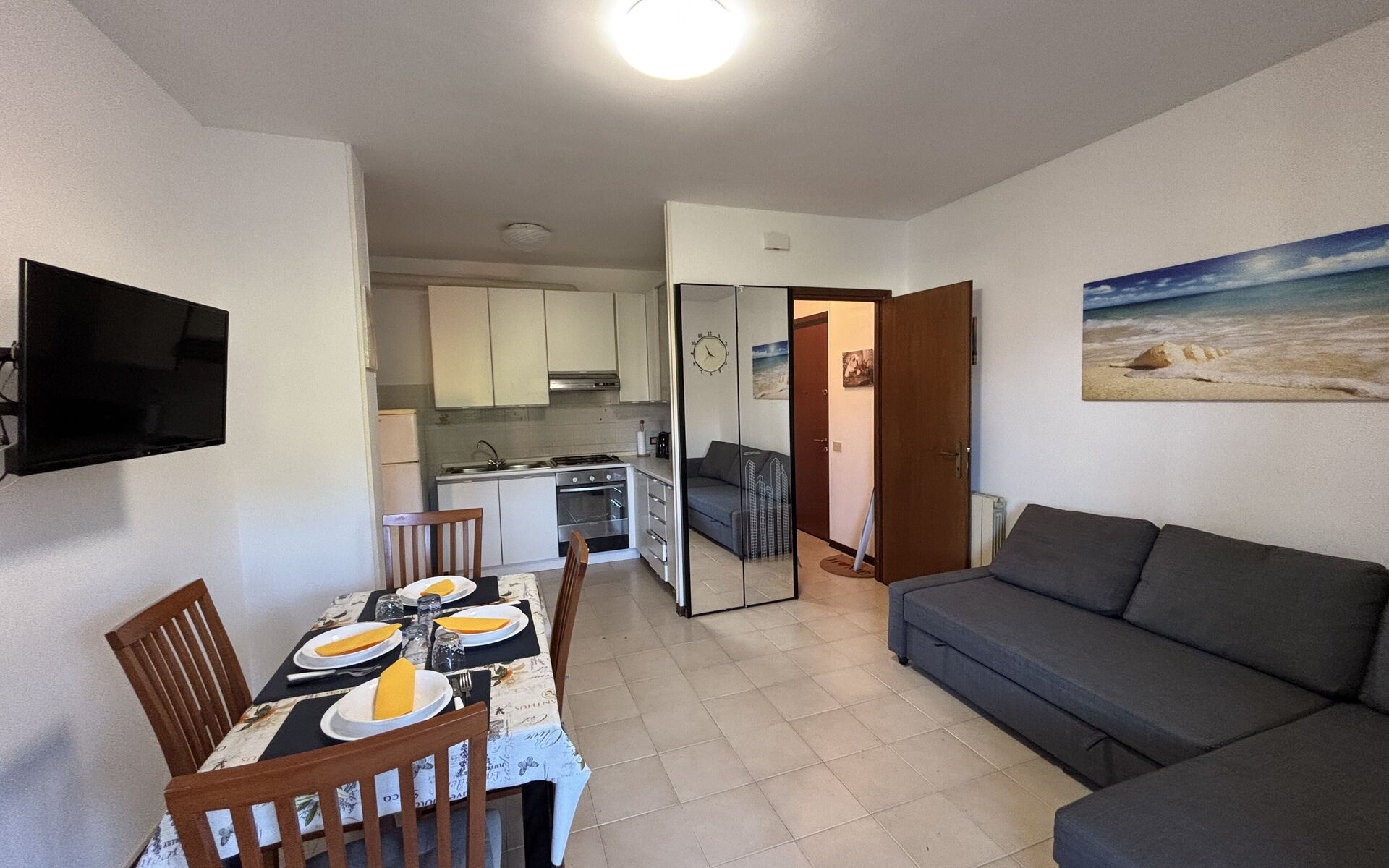 Cucina ben attrezzata, Divano letto matrimoniale, Forno, Freezer, Frigo, Microonde, Piano Cottura, Tavolo da pranzo, Televisione, Uscita sulla terrazza