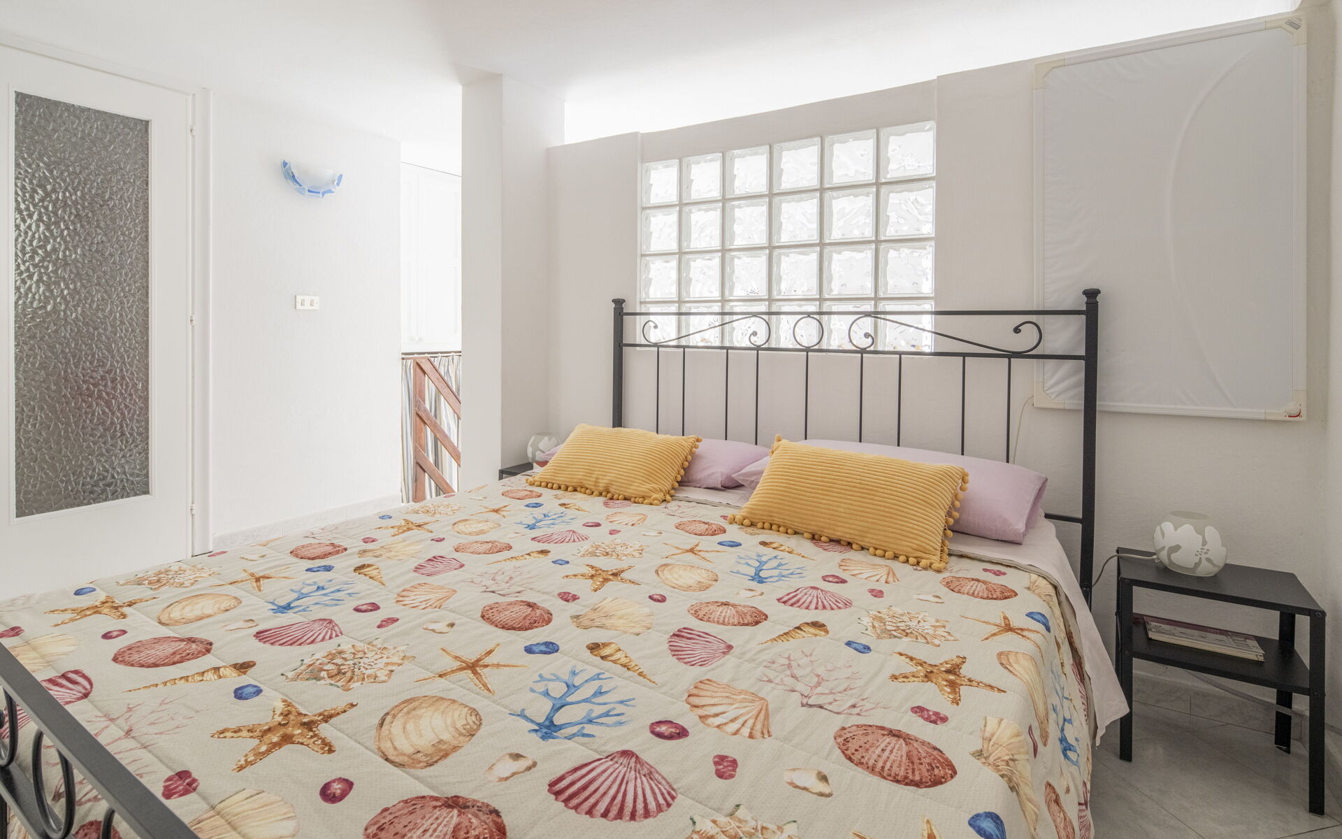 Gli interni sono composti da una cucina-soggiorno: cucina ben attrezzata, frigo, microonde, e soggiorno con 2 divani letto singoli. La zona notte con un letto matrimoniale è leggermente rialzata e separata dalla zona giorno da 3 gradini. All'interno troviamo un bagno con doccia. Nota Bene: non è presente una porta che separa la zona giorno dalla zona notte. Ventilatore a soffitto (presente nella cucina-soggiorno)