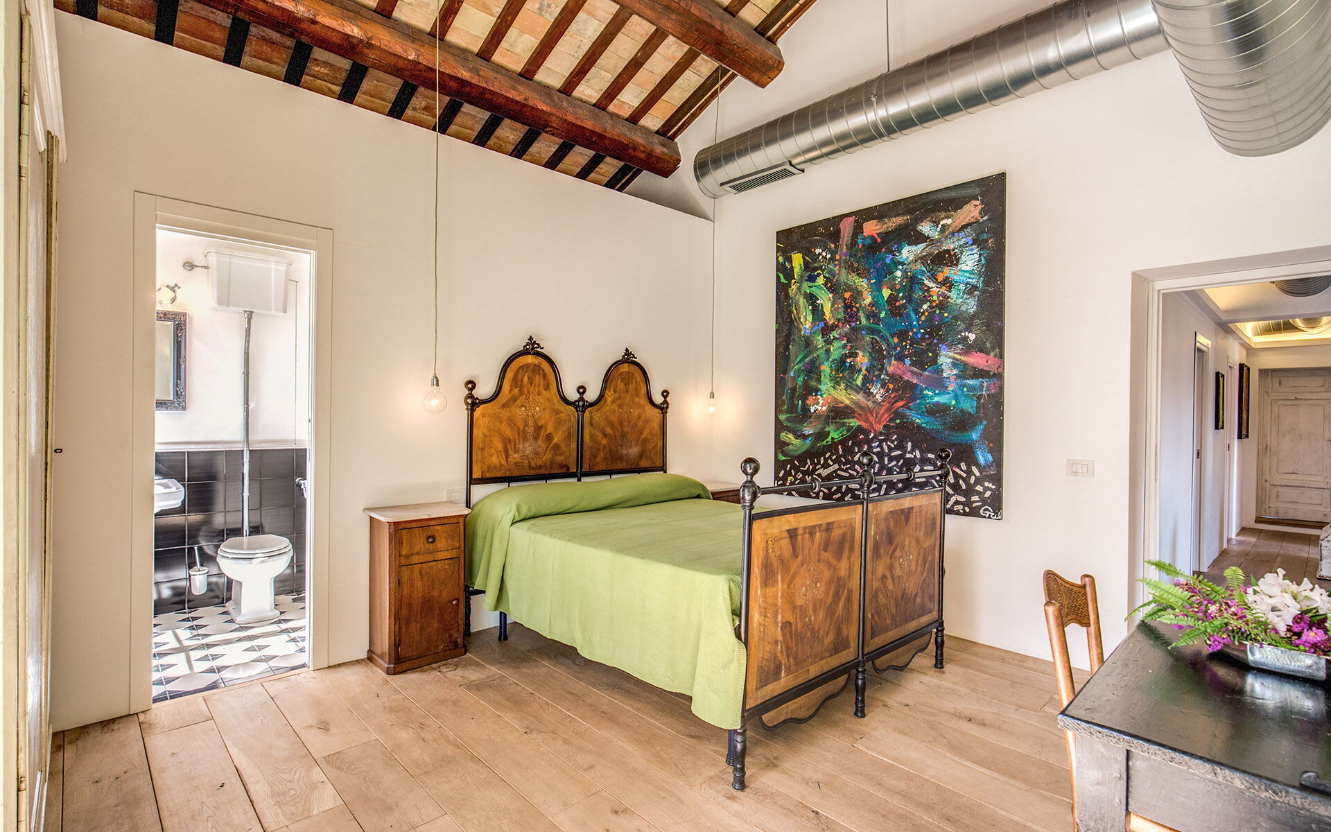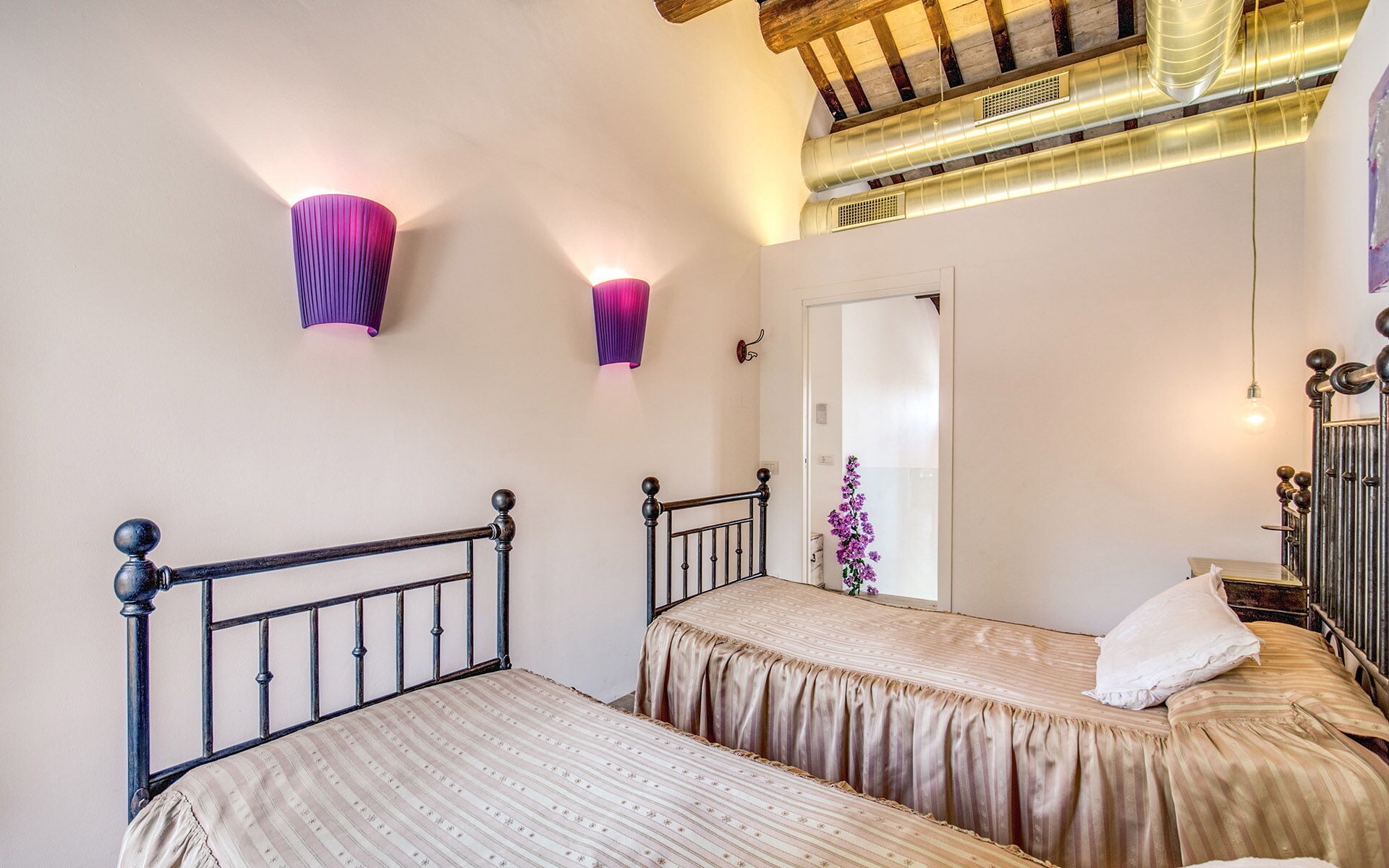 5 spaziose camere matrimoniali ciascuna col proprio bagno privato e 2 camere singole con un bagno esterno.