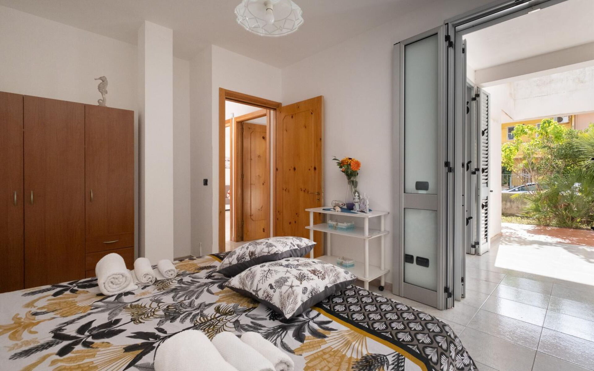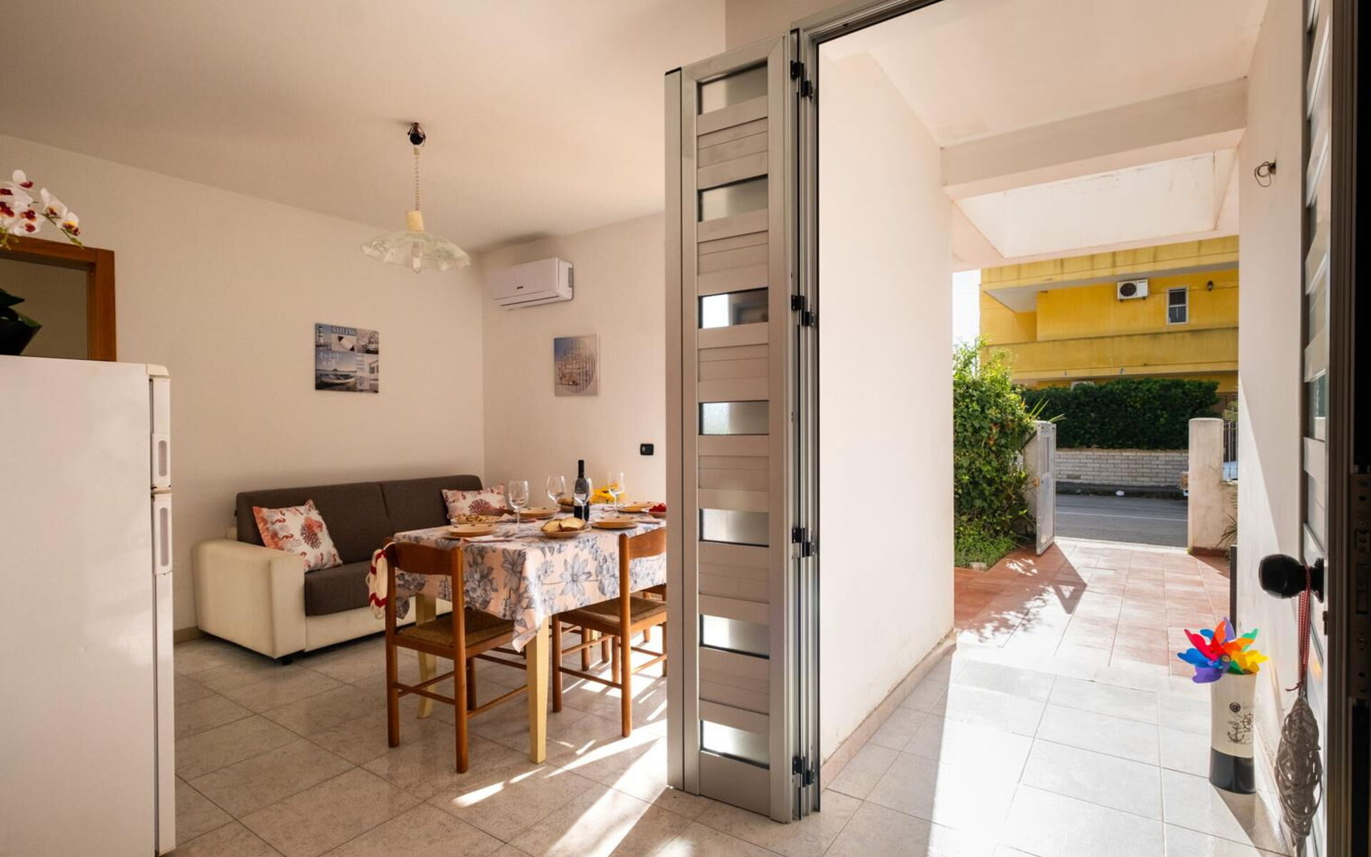 Aria condizionata, Cucina ben attrezzata, Divano letto matrimoniale, Forno, Frigo, Internet WiFi, Piano Cottura, Tavolo da pranzo, Televisione, Uscita sul patio