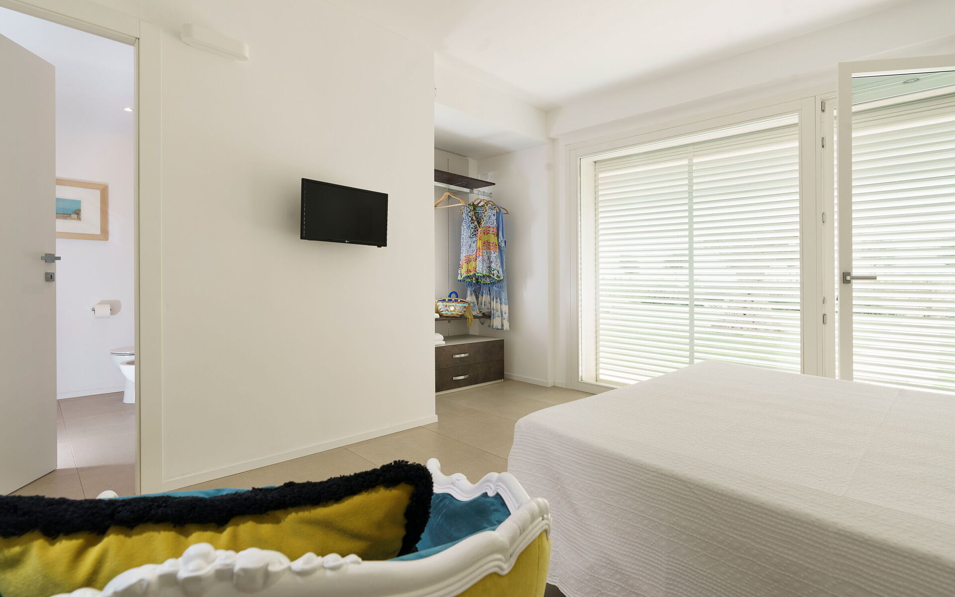 Aria condizionata, Asciugacapelli, Bidet, Culla, Doccia, Internet, Internet WiFi, Lavandino, Poltrona, TV Satellitare, Uscita sulla terrazza, WC, Zanzariere, Letto matrimoniale, Bagno senza finestra