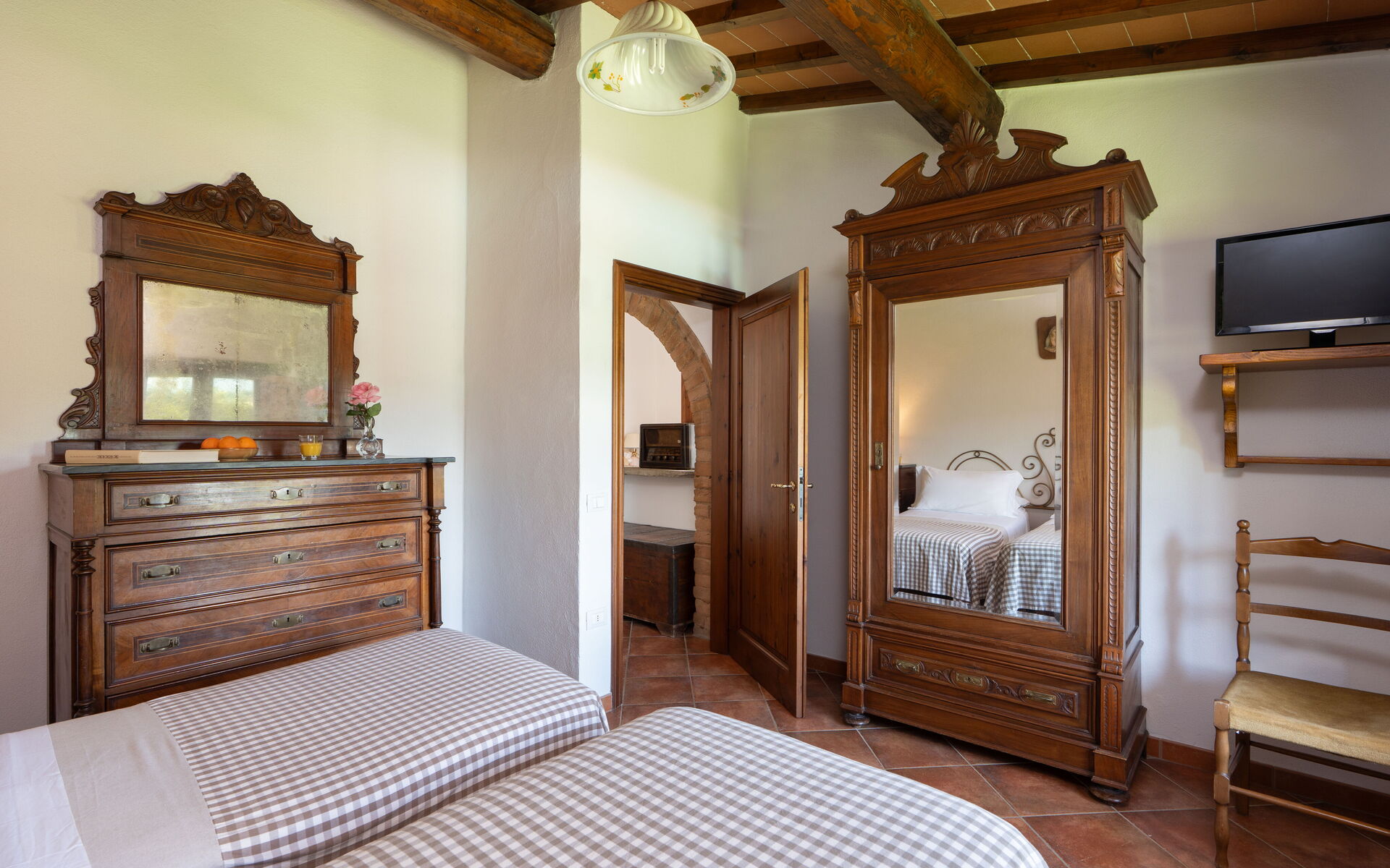 Al piano primo: 2 camere doppie con letto matrimoniale; 2 camere con due letti singoli ciascuna; 1 bagno con doccia (wc/bidet); 1 bagno con doccia e lavatrice (wc/bidet).