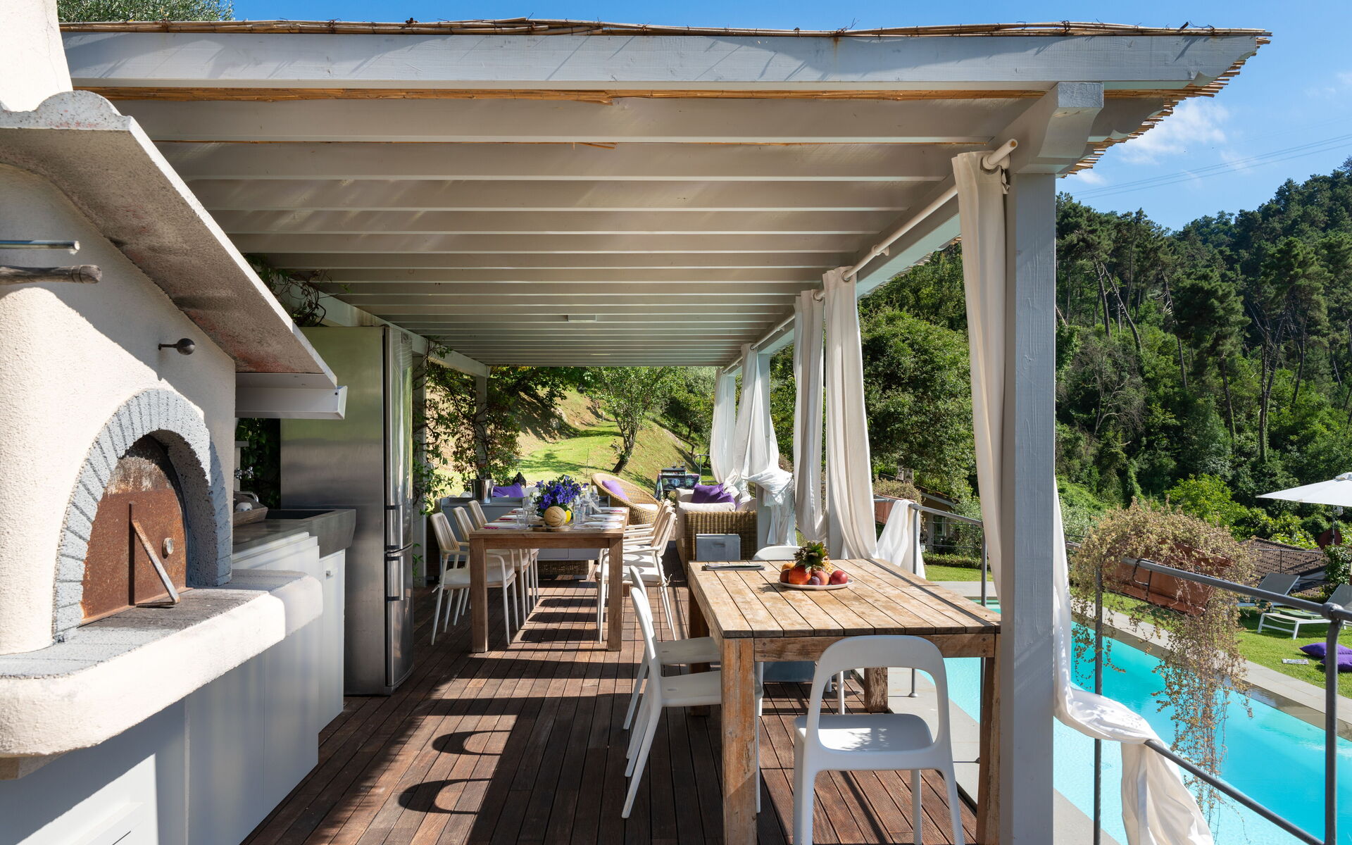 Cucina esterna composta da: barbercue, forno a legna, piano cottura, frigo, lavastoviglie, lavabo, tavolo per pranzo/cena, salotto da esterni. Lettini prendi sole 8, doccia esterna.