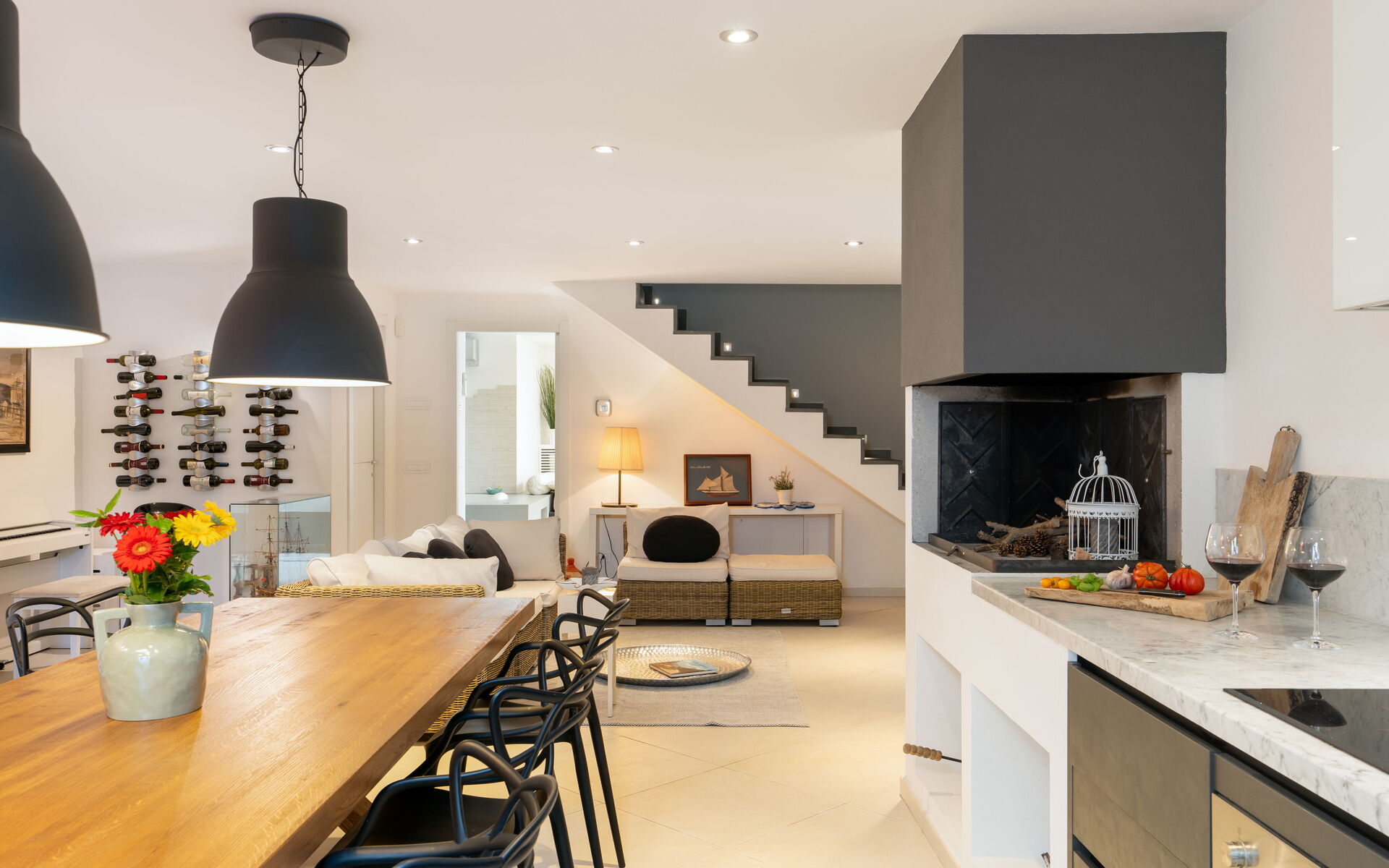 Piano terra: 2 soggiorni di cui uno con TV, cucina con piano a induzione, forno elettrico, lavastoviglie, macchina del caffè americana, macchina del caffè espresso. Lavabo, cappa e frigo.