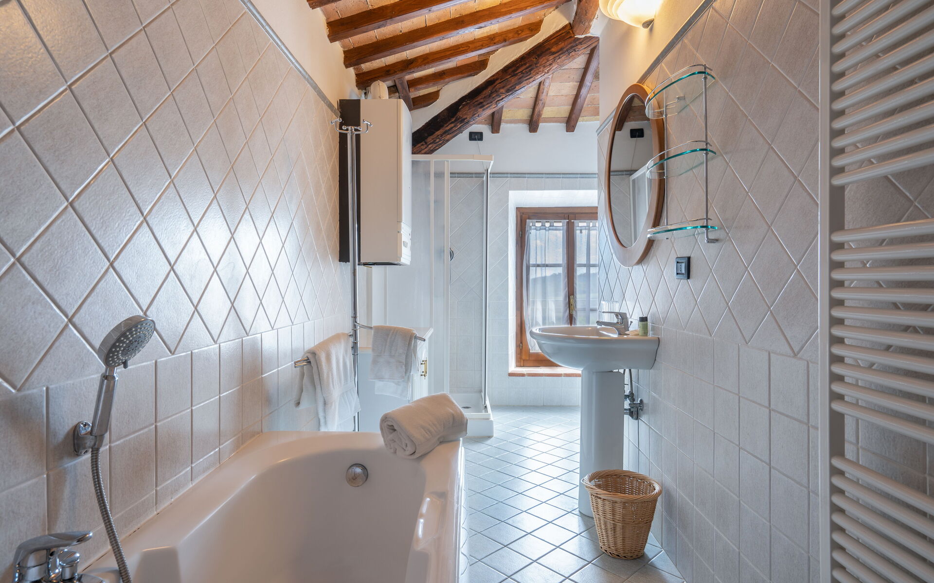 Le recenti ristrutturazioni non hanno alterato lo stile tipico rustico toscano, ancora visibile in tutti gli appartamenti con i suoi pavimenti in cotto e i soffitti con travi di legno e mattoni a vista.