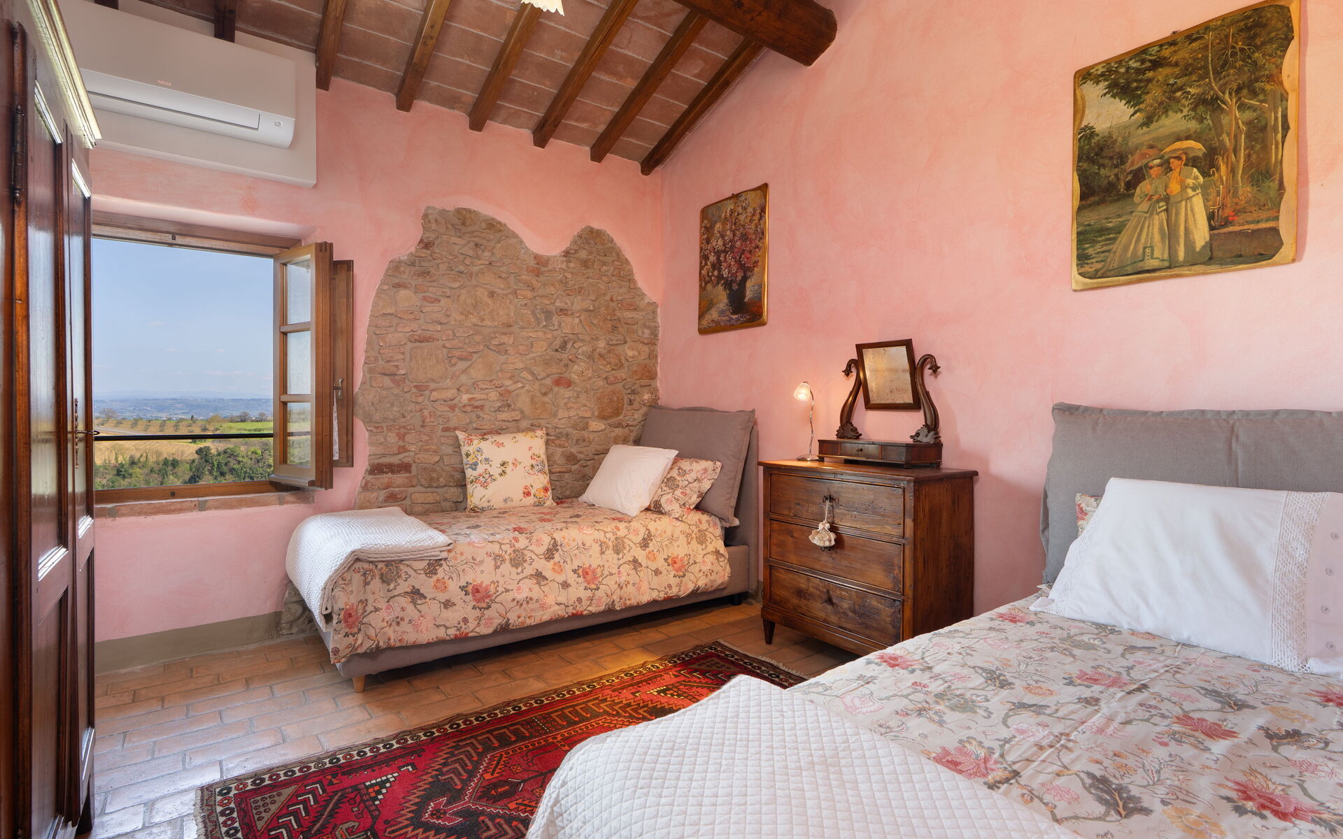 Al piano primo: 2 camere con letto matrimoniale, una delle quali con bagno in camera con doccia (wc/bidet); 1 camera con due letti singoli; 1 bagno con doccia (wc/bidet/lavatrice).