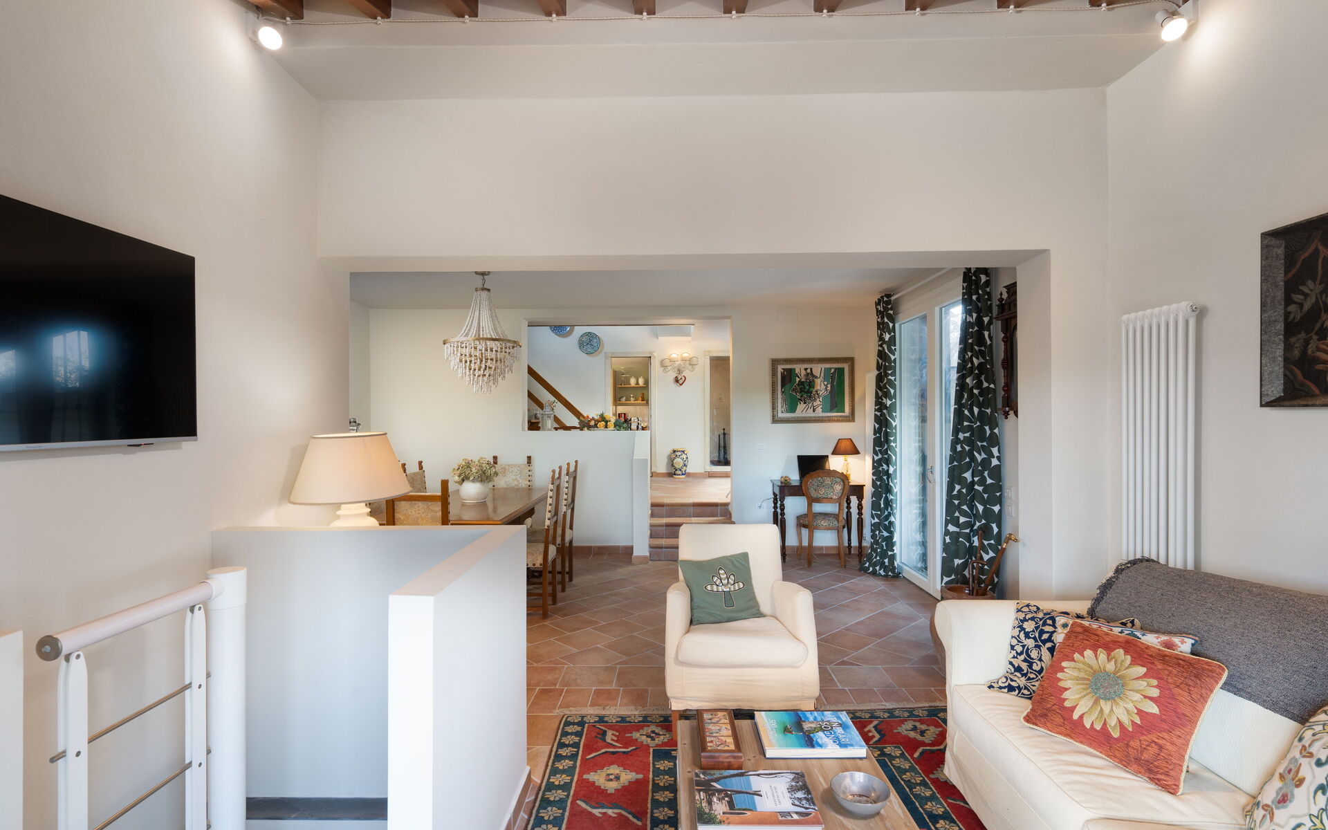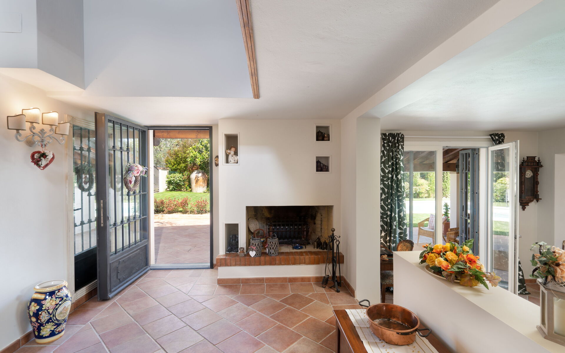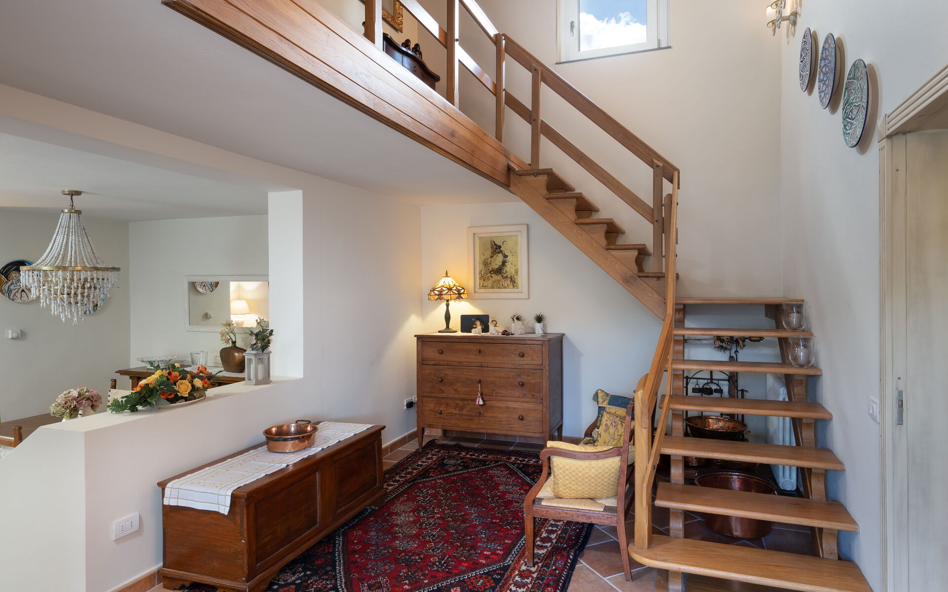 Piano terra: ingresso , cucina ( 6 fuochi, frigo freezer, forno, lavastoviglie, macchina da caffe’, tostapane, forno a microonde ) pranzo soggiorno con camino, TV satellitare con accesso alla loggia esterna attrezzata per pranzi e cene all’aperto , bagno con doccia.