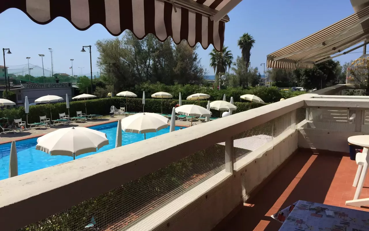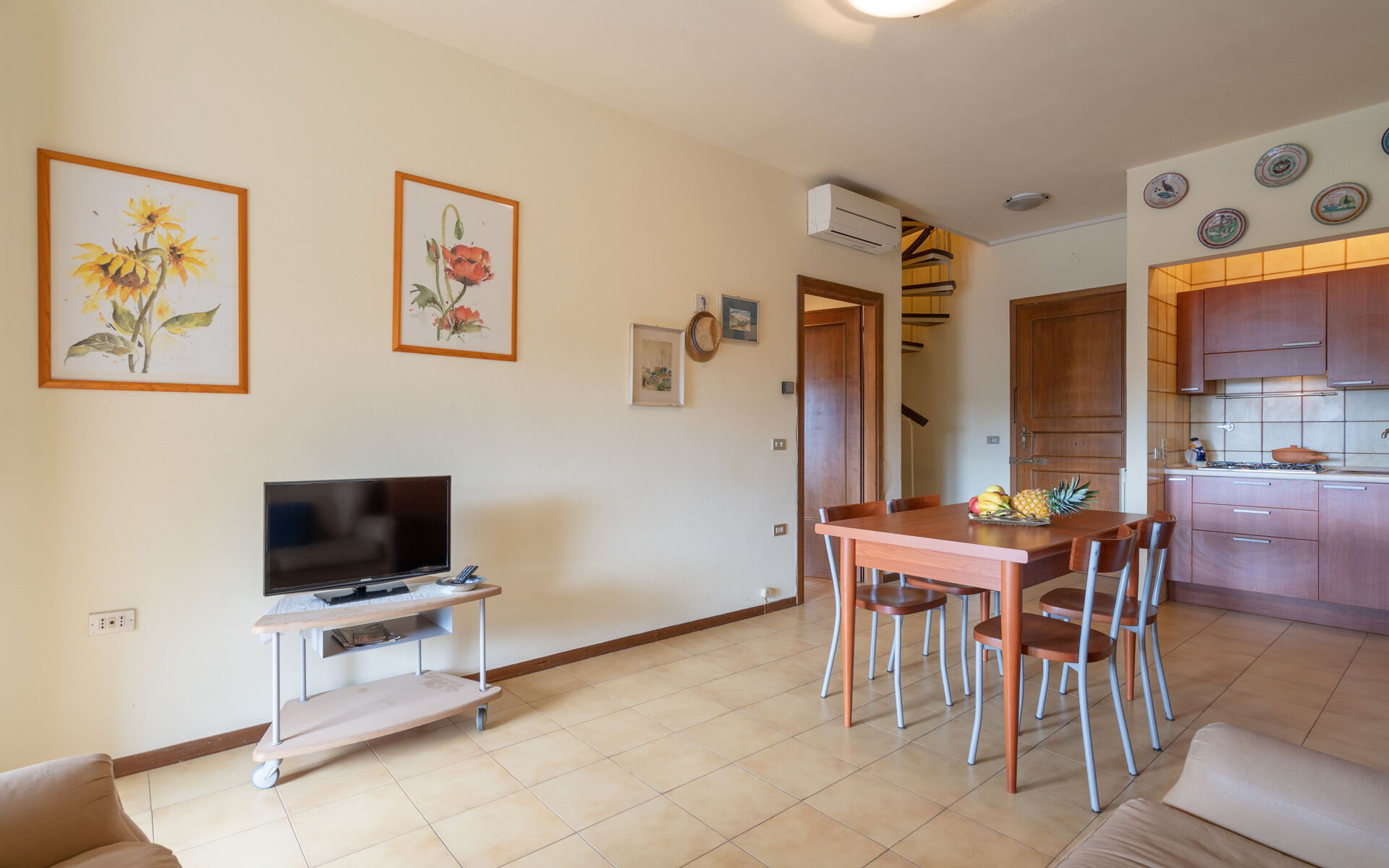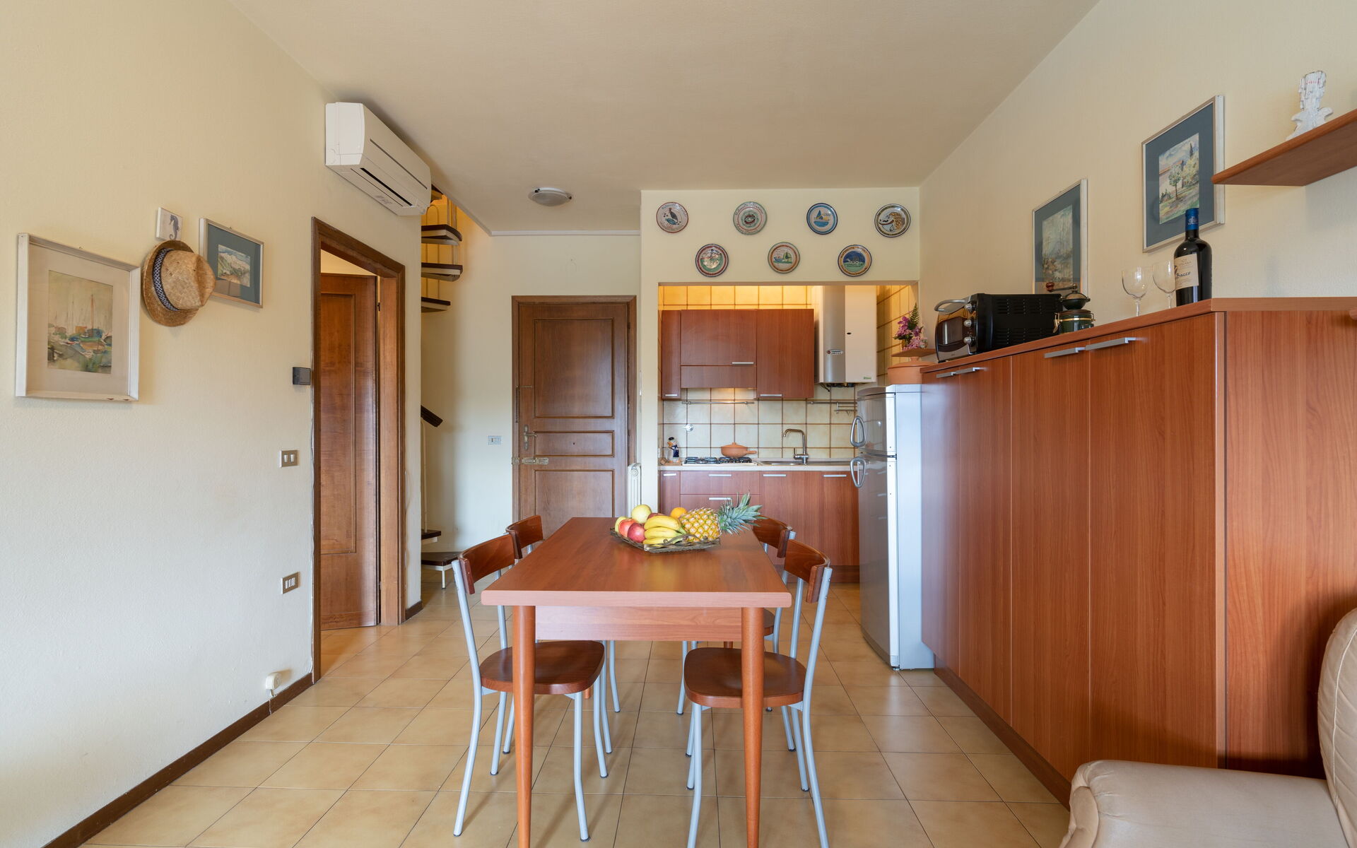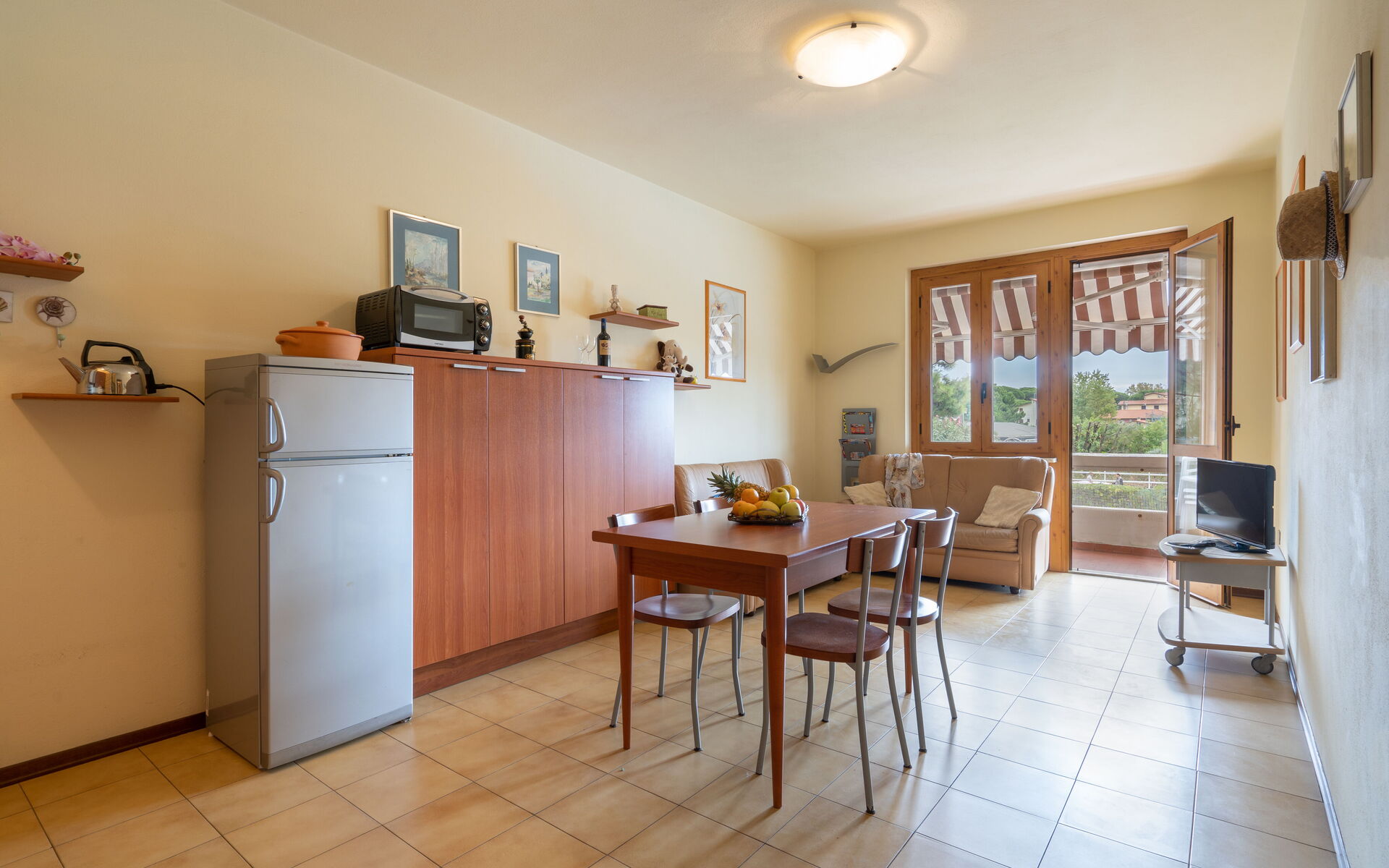 Sala/angolo cottura con accesso diretto al balcone, vista mare e piscina,