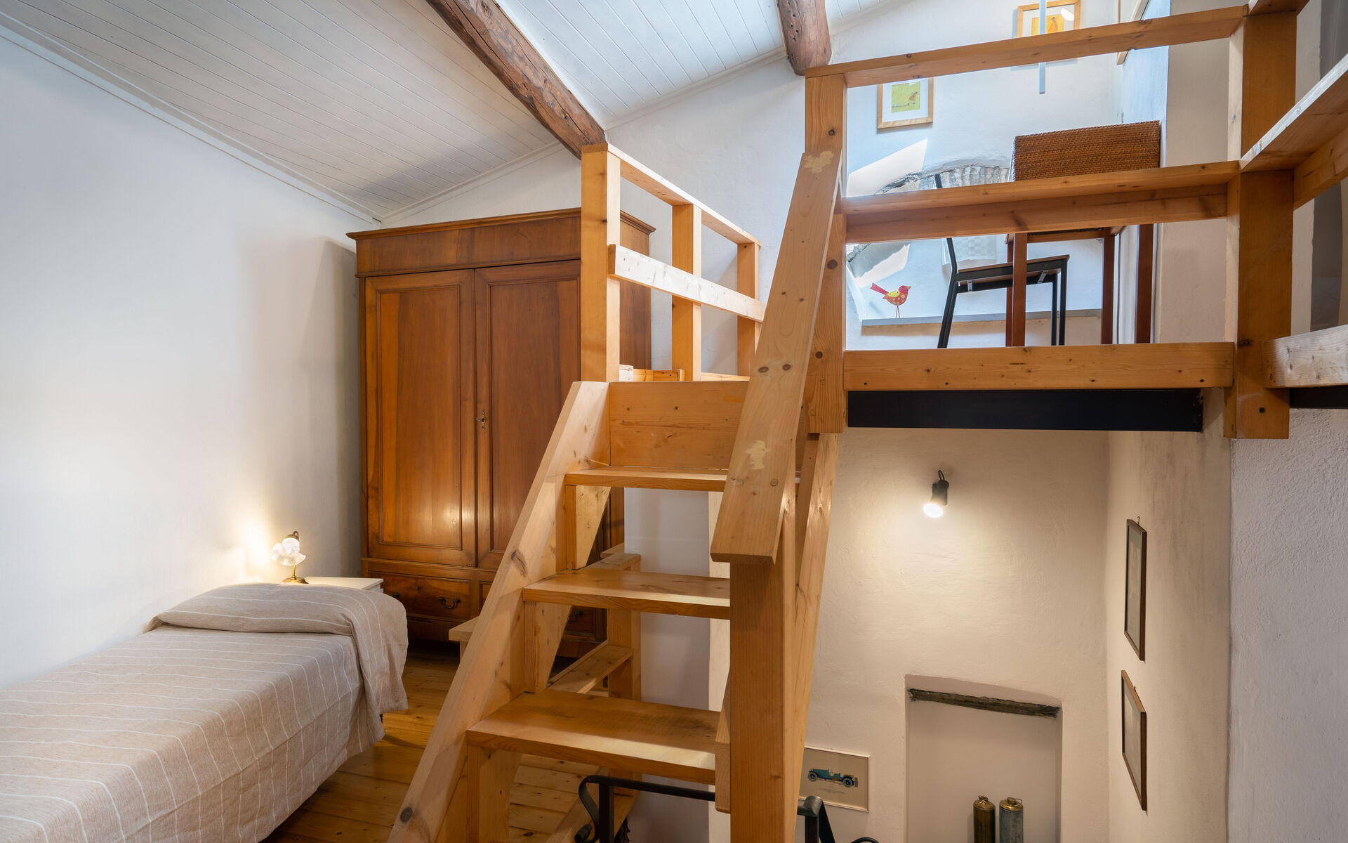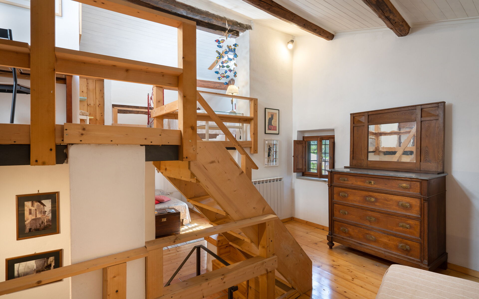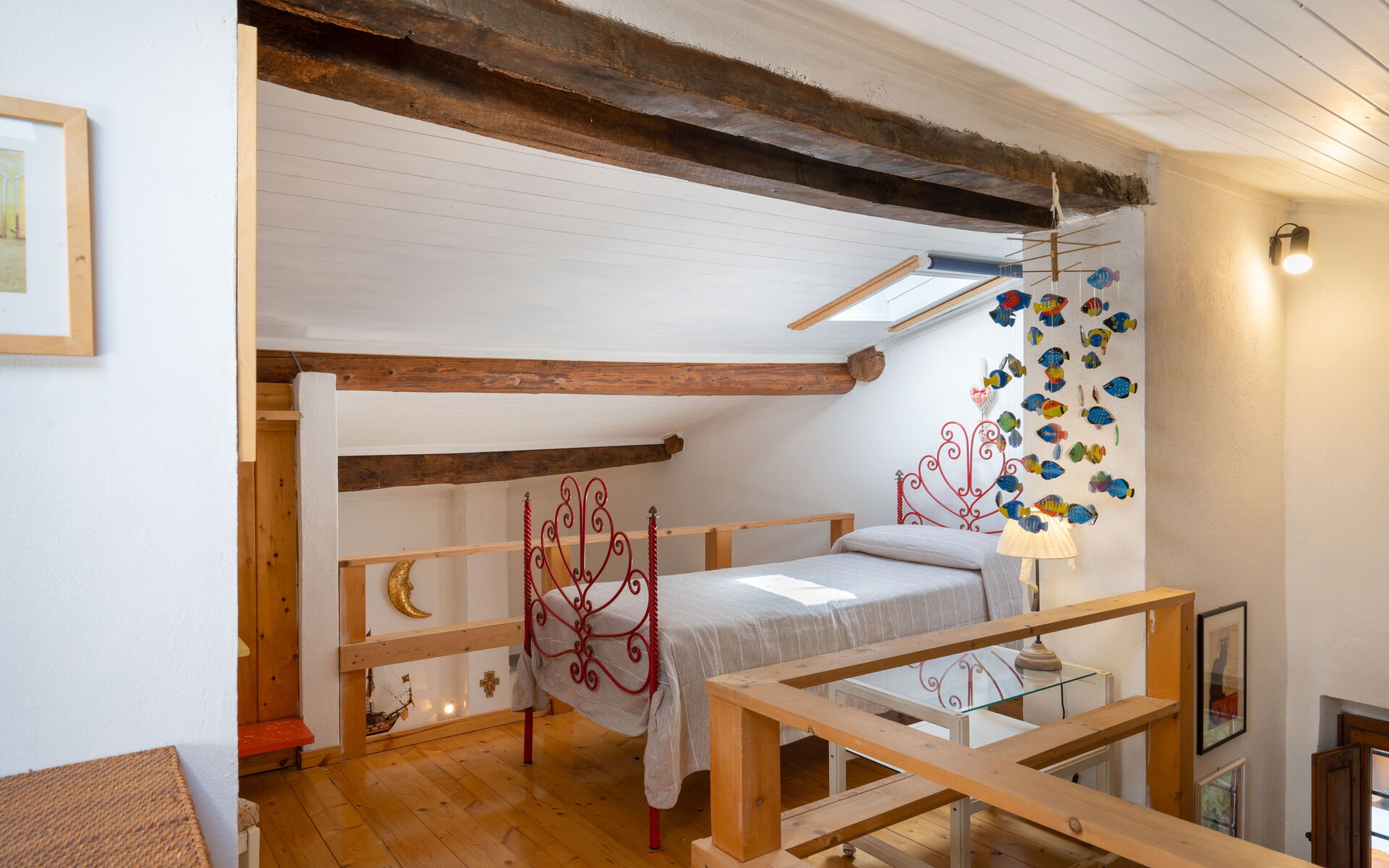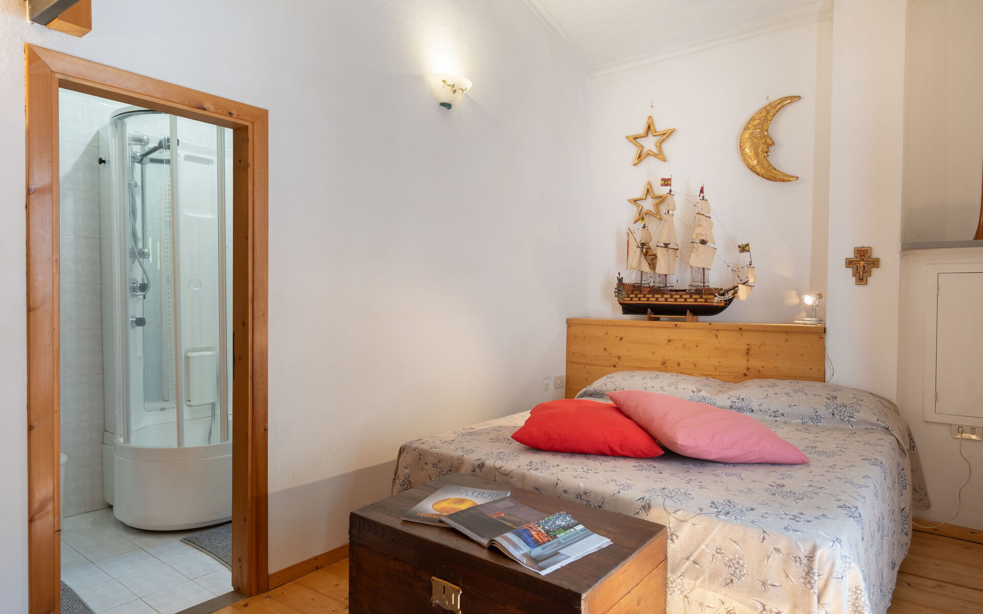 1 P: 1 camera matrimoniale con bagno con doccia, soppalco con 2 letti singoli.