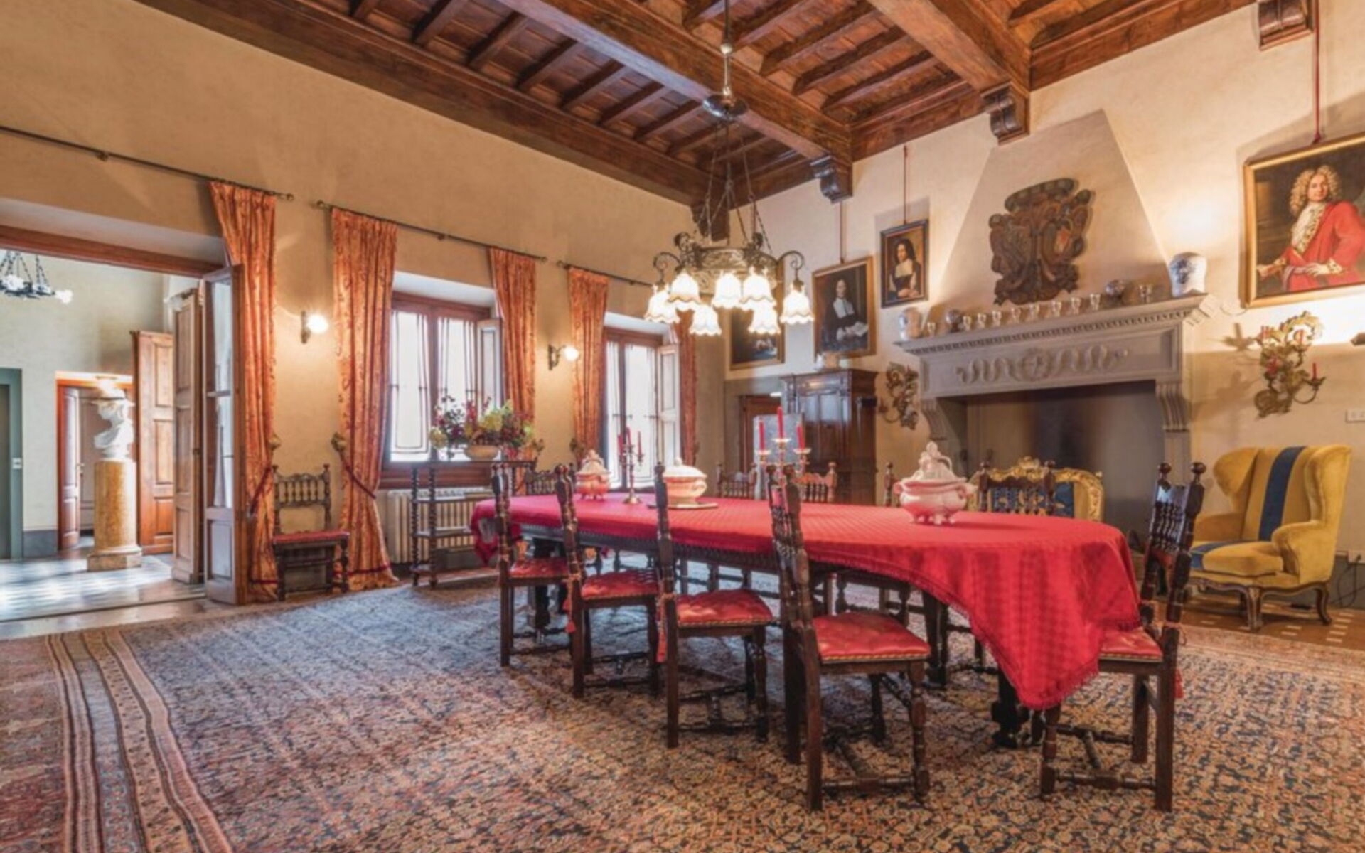 Al piano primo: salotto; salotto/soggiorno con camino e Tv; 1 bagno di servizio (wc); ampia sala pranzo; saletta per prima colazione con Tv (da qui tramite una rampa di scale si accede al locale lavanderia/stireria); cucina dotata di cinque fuochi, forno elettrico, forno a legna, frigo, freezer, macchina da caffè, lavastoviglie; 2 camere doppie ciascuna con letto matrimoniale e bagno in camera con doccia (wc/bidet); 1 camera doppia con letto matrimoniale e bagno in camera con vasca (wc/bidet).