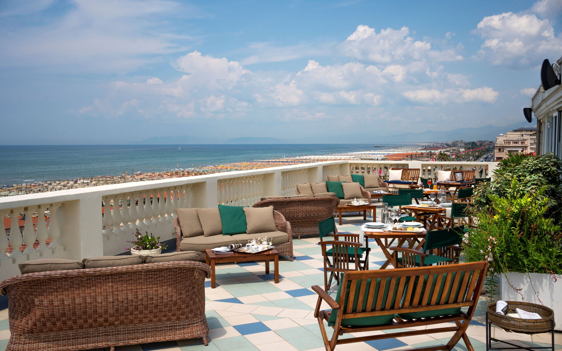 Dalla Terrazza condominiale vista spiaggia ogni sera si può ammirare il tramonto con la vista che spazia dal Golfo dei Poeti fino all’isola della Gorgona; alle spalle lo scenario delle Alpi Apuane, con il marmo di Carrara a ricordarci Michelangelo, il Bernini, Canova e tutti i più importanti scultori italiani.