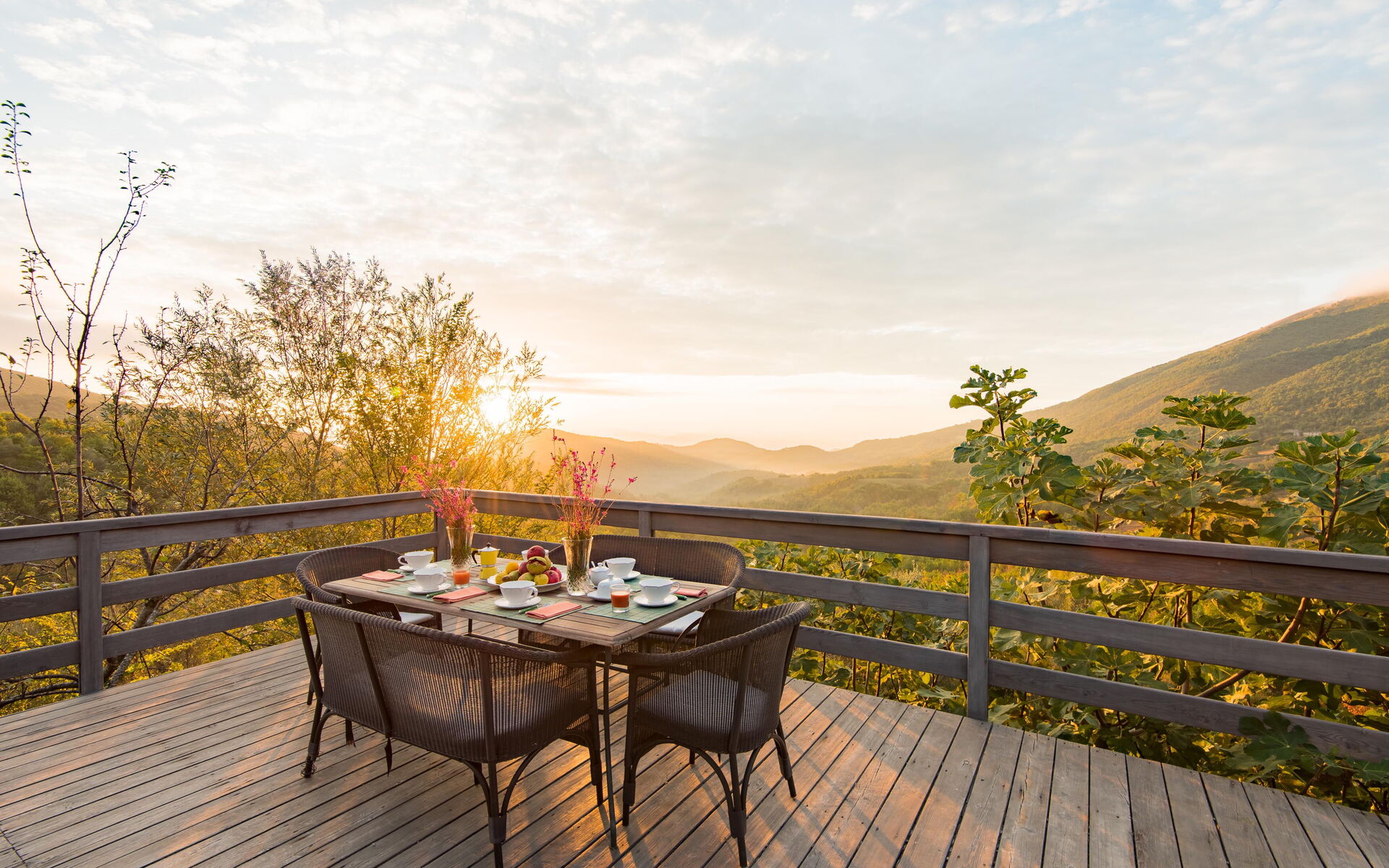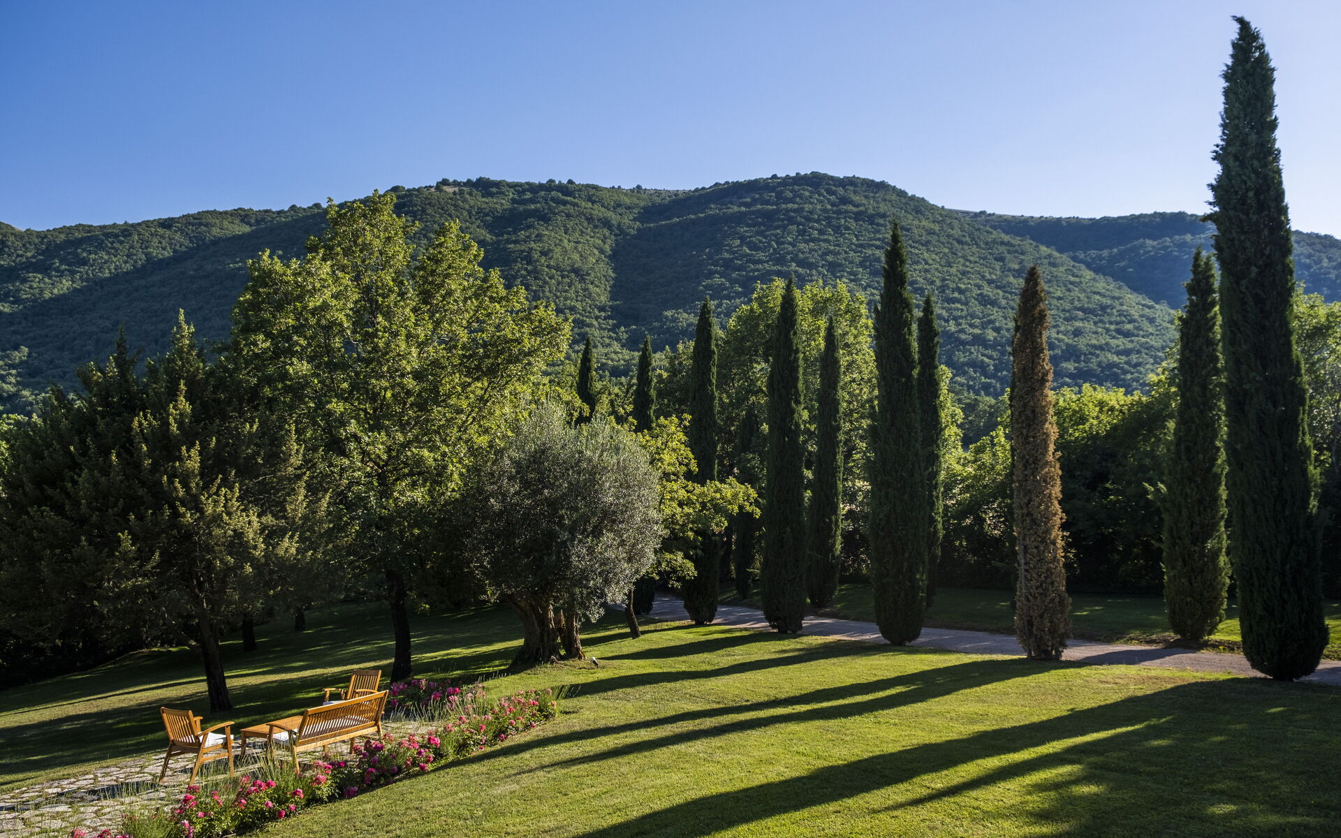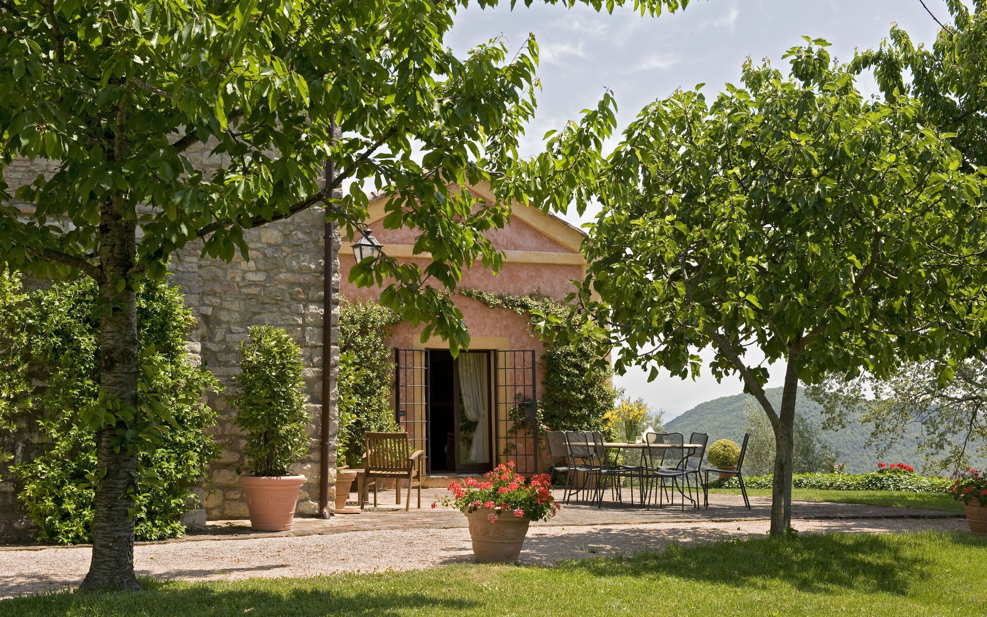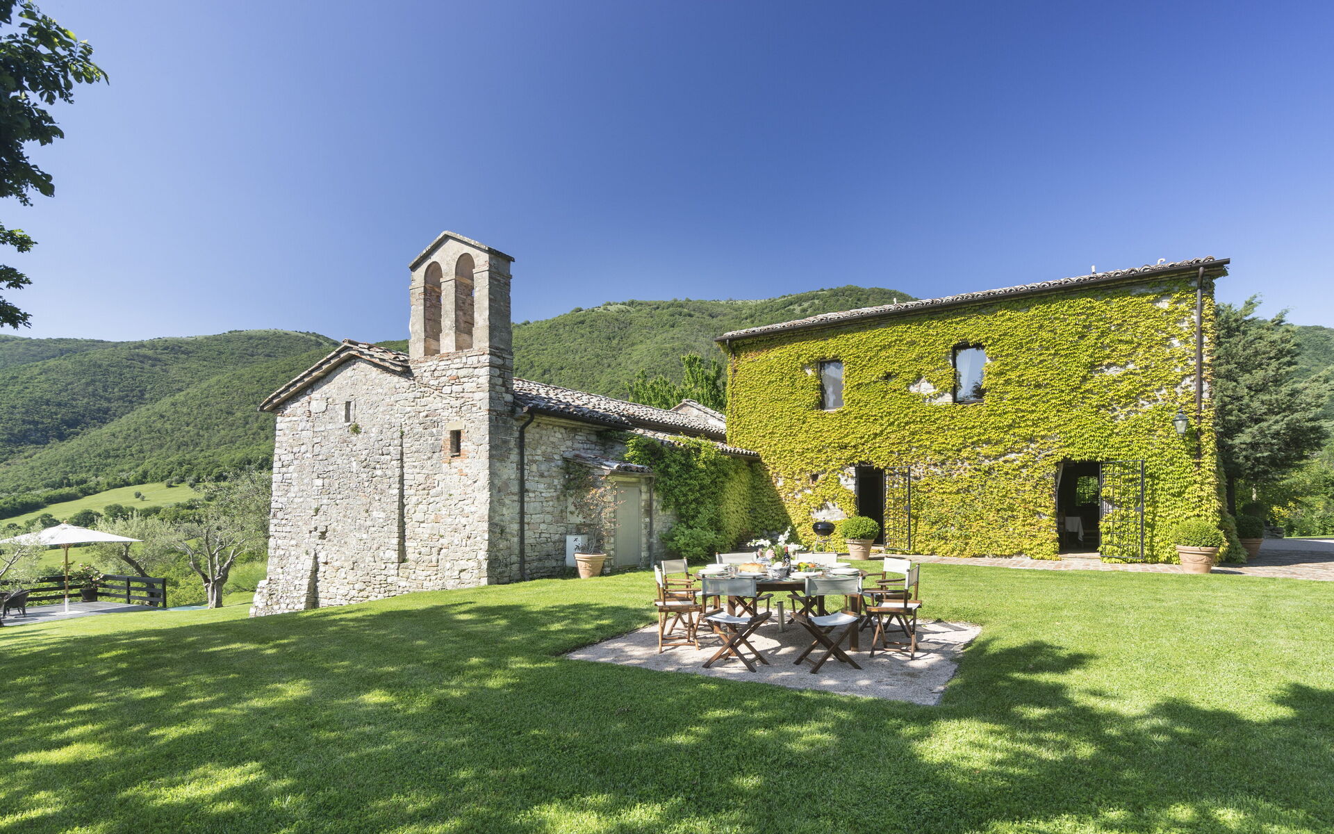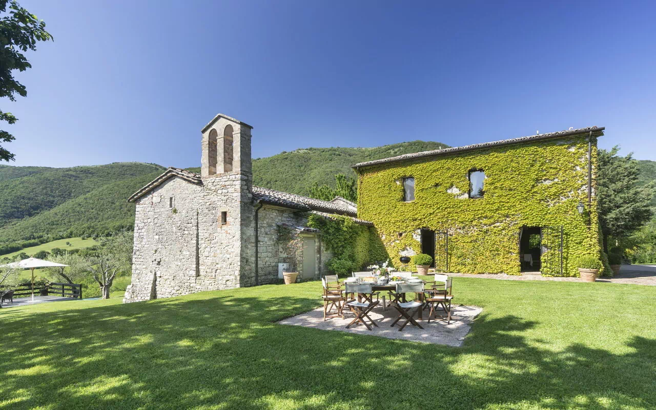 Il casale si affaccia su un elegante giardino con una terrazza panoramica che regala una vista mozzafiato sulla campagna circostante.