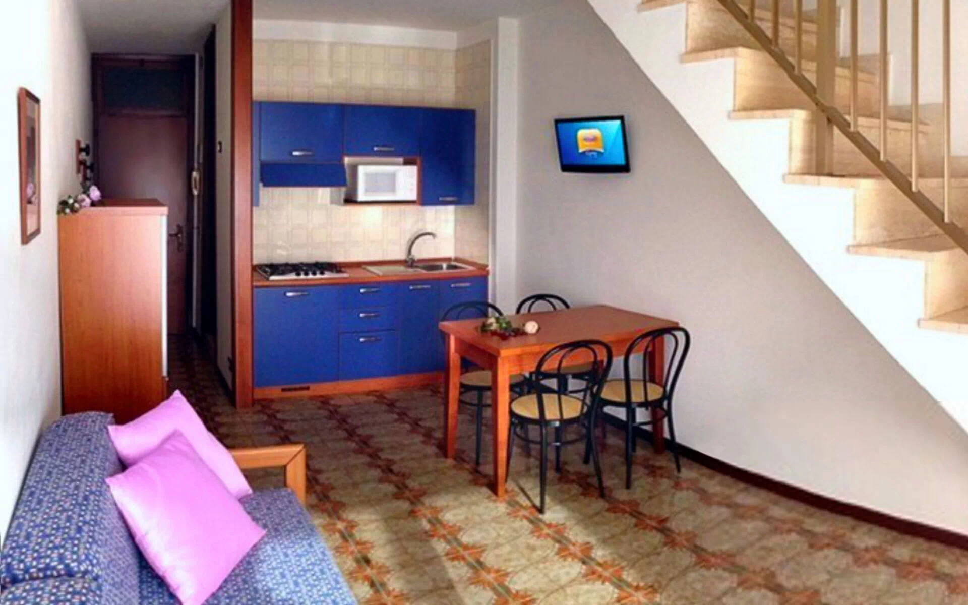 Appartamento bilocale disposto su due piani, composto da soggiorno con angolo cottura e divano letto doppio, camera con letto matrimoniale, due servizi con box doccia e bidet, due terrazze. Dispone di persiane elettriche, forno a microonde, frigorifero grande con congelatore, lavastoviglie, cassaforte, LCD sat-TV, lavatrice, aria condizionata, internet WiFi gratuito, un posto auto.