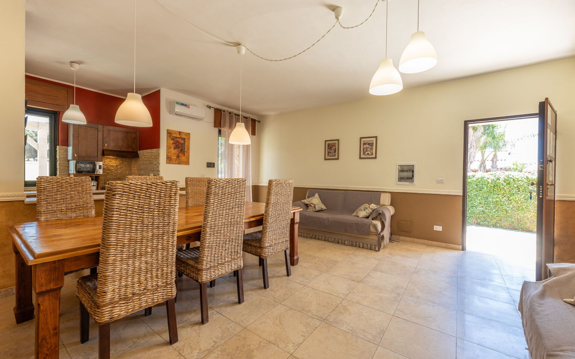 This villa is an oasis of peace and relaxation, where you can enjoy the blue waters of the swimming pool, equipped with an outdoor shower and comfortable sun loungers. Surrounded by manicured greenery with palm trees and lush vegetation, the pool has evening lighting that creates an evocative atmosphere.