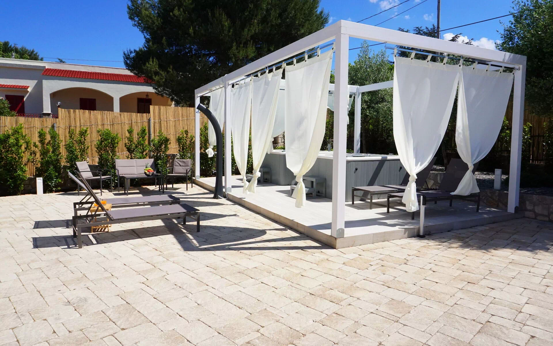 The property consists of 2 independent units, each with its own private Jacuzzi. This solution is perfect for groups of friends who wish to spend a holiday together while maintaining their privacy. Each unit has a private patio furnished with a table, chairs and comfortable sofas, while the garden and outdoor spaces are shared.